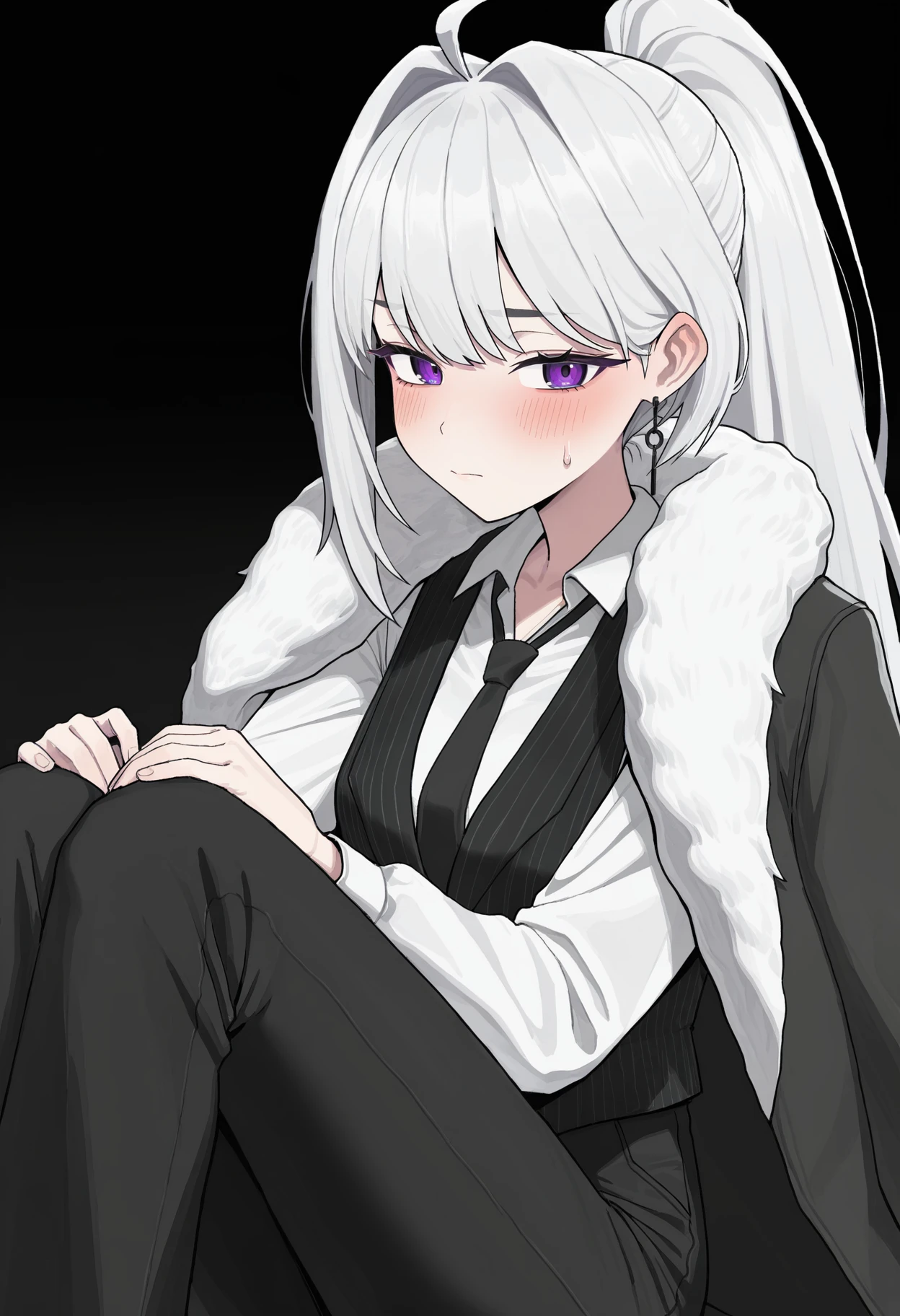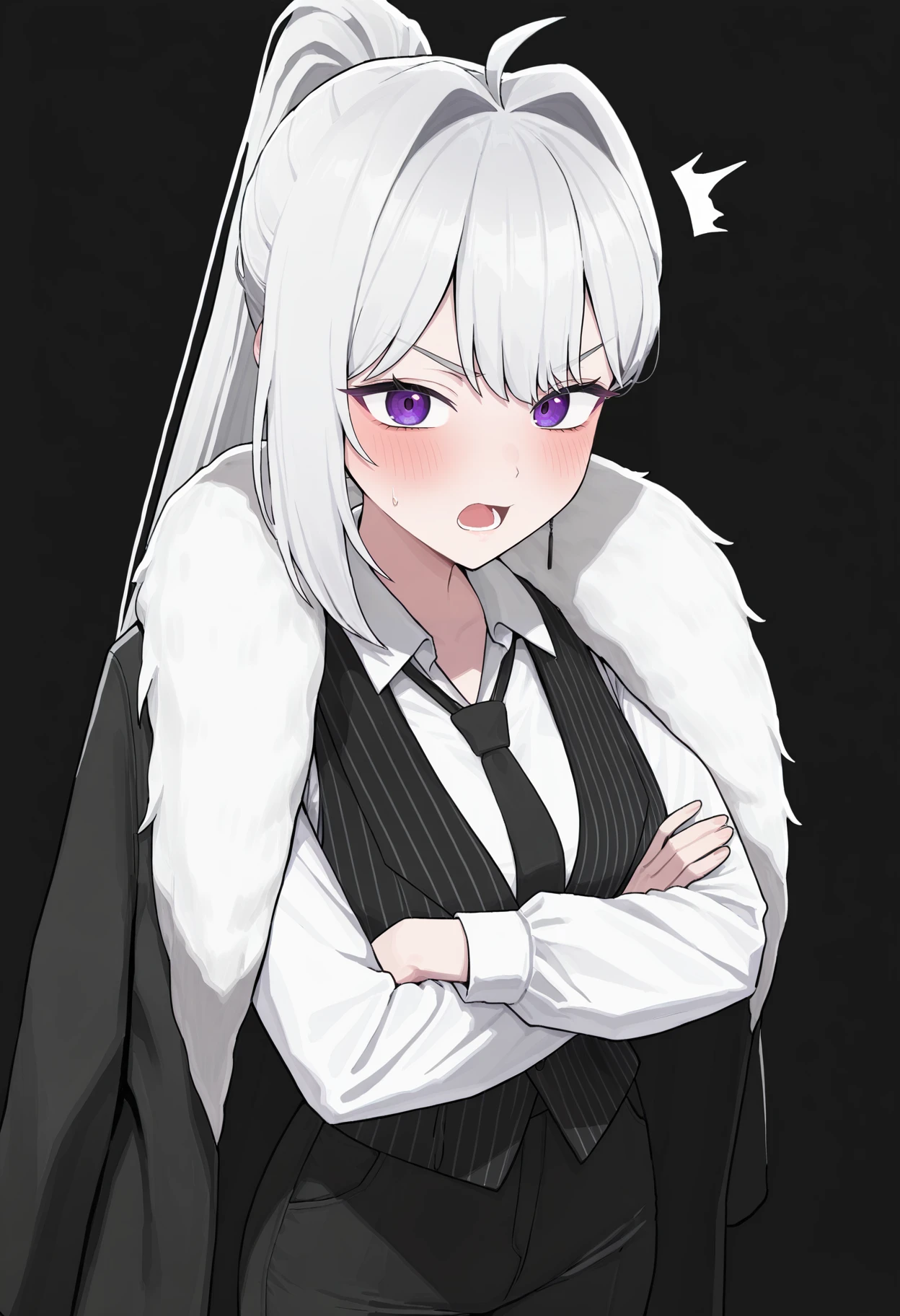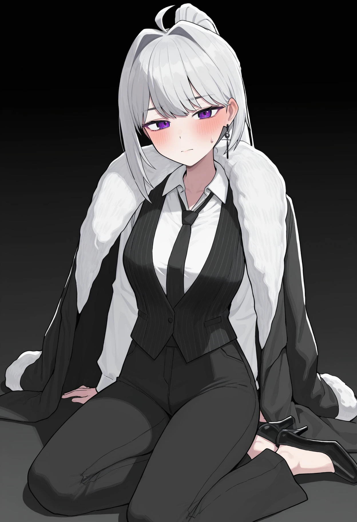 MAINE, white hair, long hair, single sidelock, ahoge, high ponytail, bangs, purple eyes, chain earrings, single earring, white shirt, collared shirt, black necktie, long sleeves, black vest, striped vest, black coat, fur-trimmed coat, coat on shoulders, white fur, black pants, high-waist pants, bell-bottoms, black footwear, high-heels