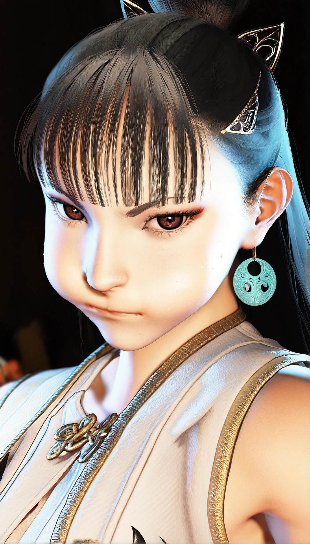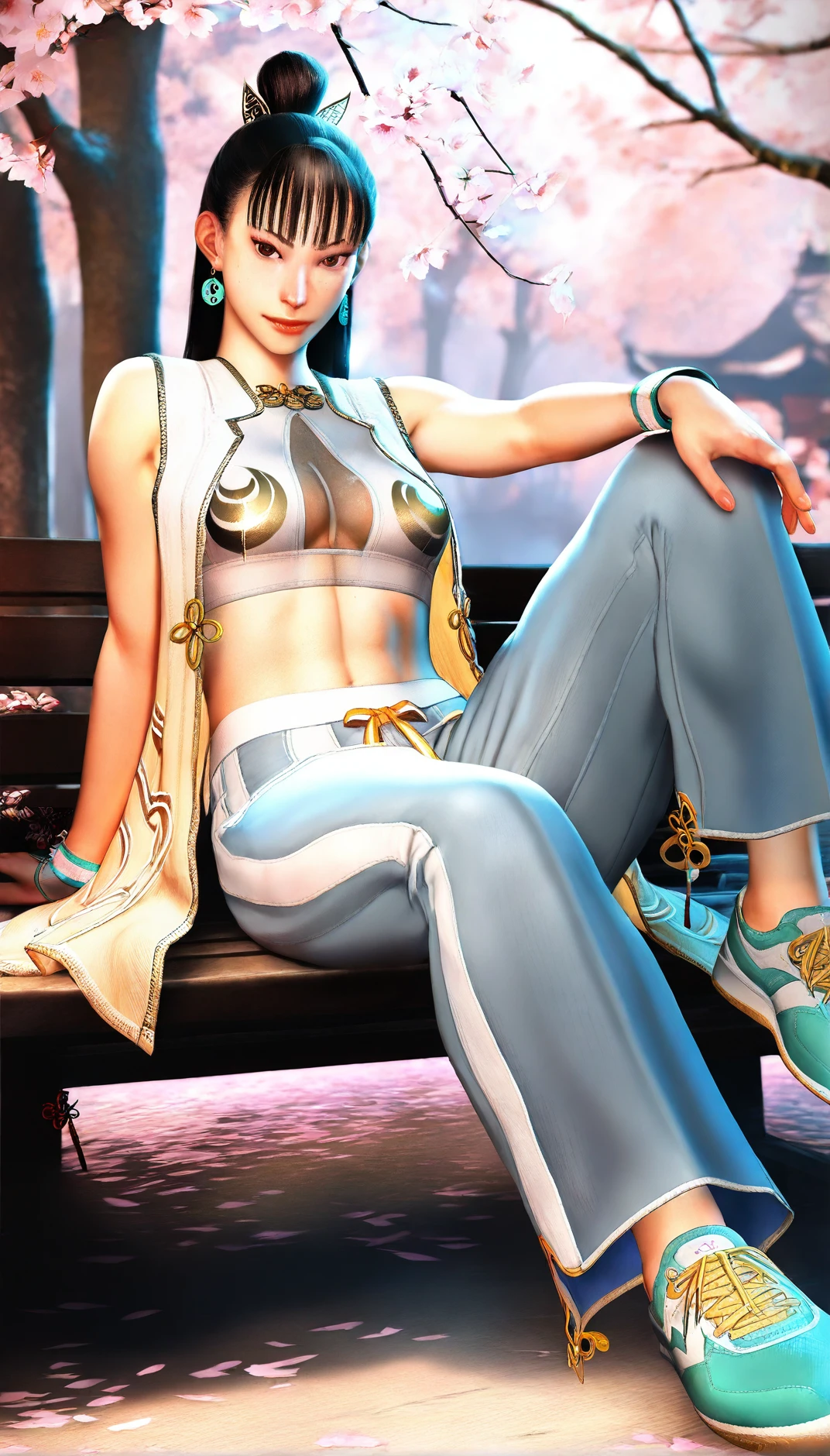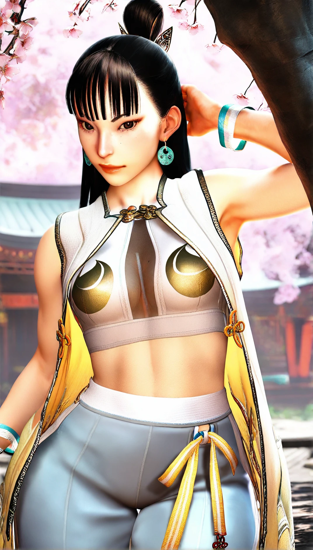 sf6chunli, realistic, 1girl, solo, black hair, long hair, hair bun, bangs, hairclip, jade earrings, brown eyes, long white vest, open clothes, white sports bra, loose gray pants, green shoes,