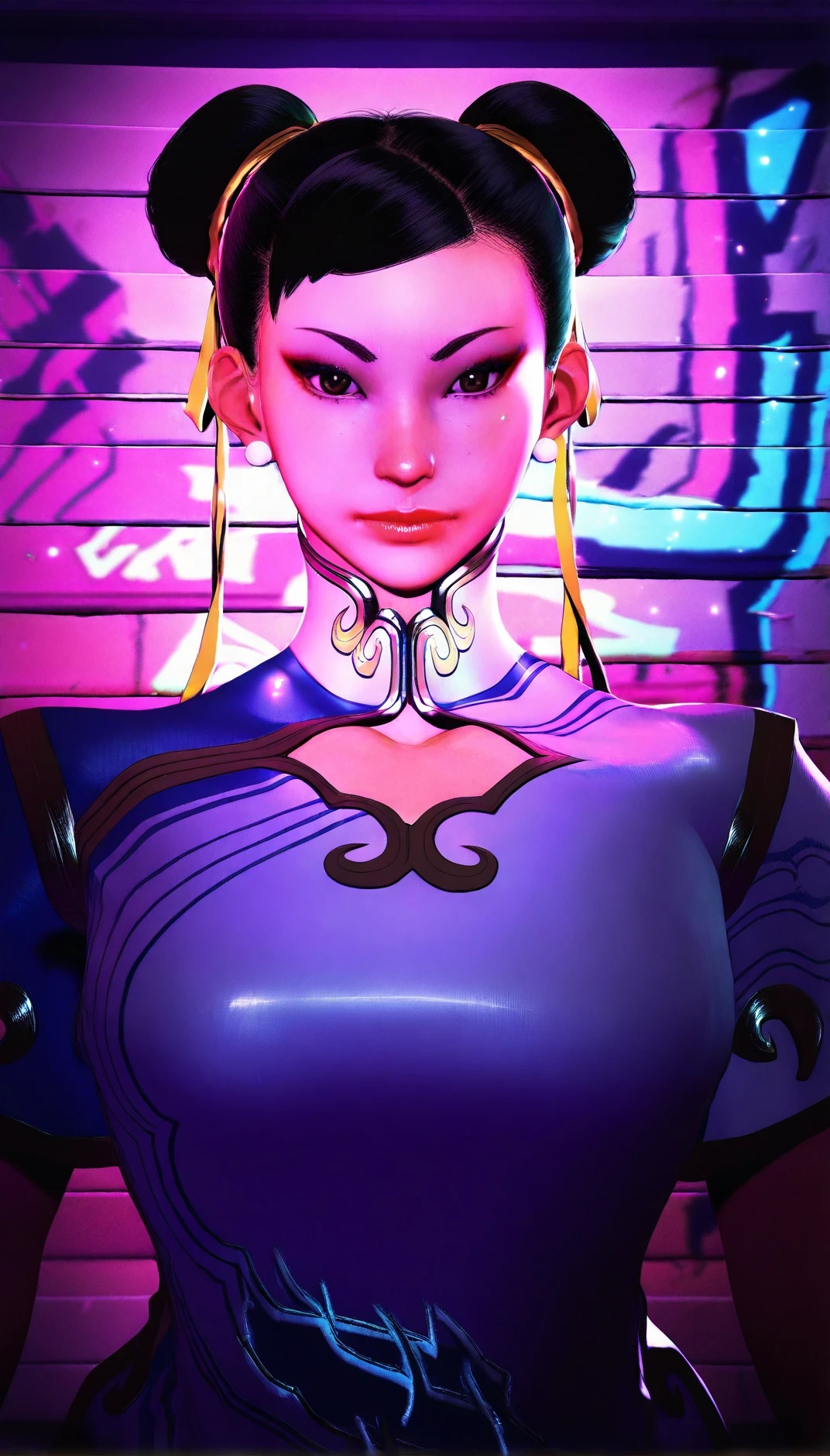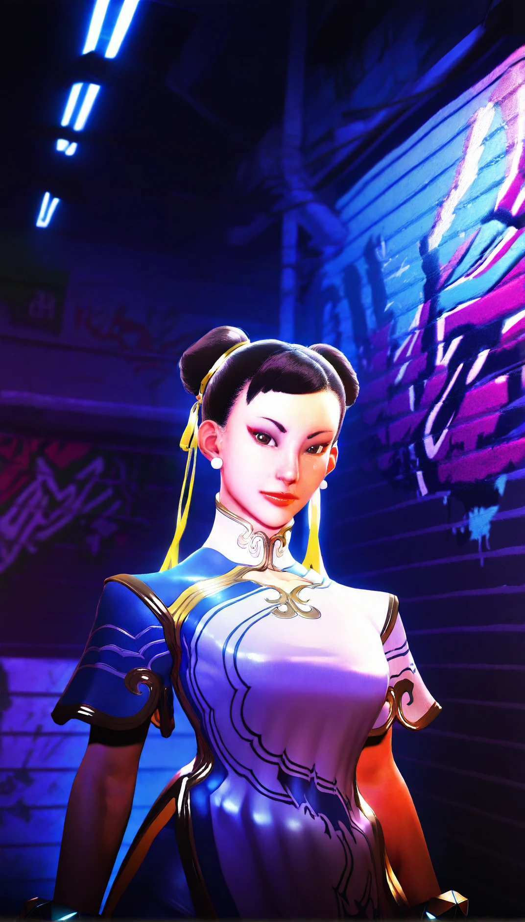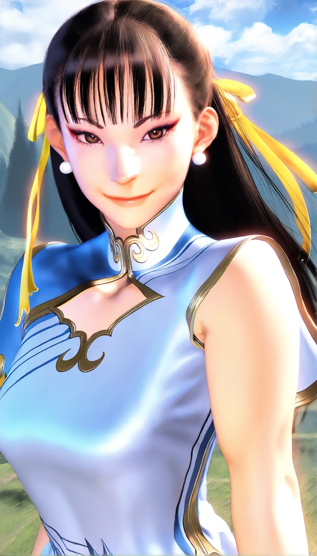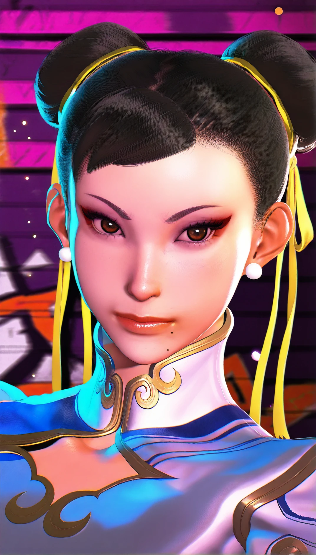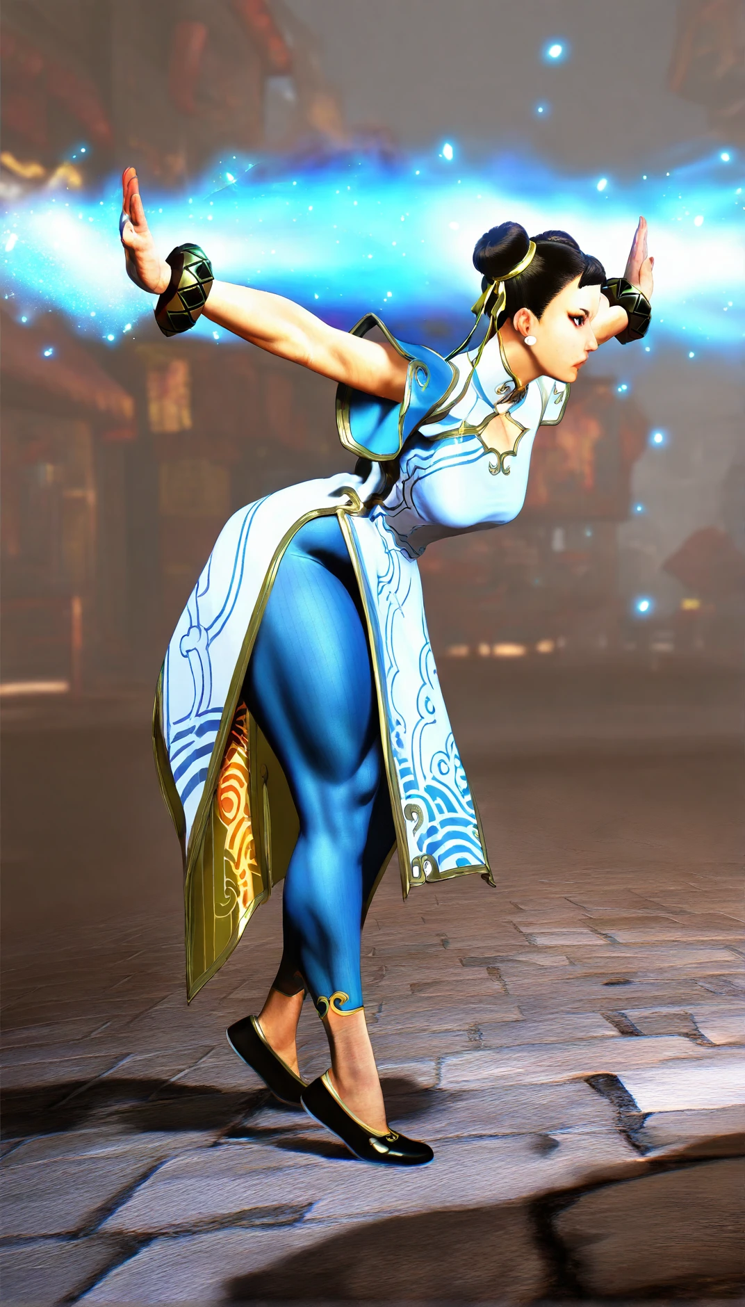 sf6chunli, realistic, 1girl, solo, black hair, double bun, yellow hair ribbon, pearl earrings, brown eyes, light blue qipao, black wrist guards, blue tight pants, black flat shoes,
