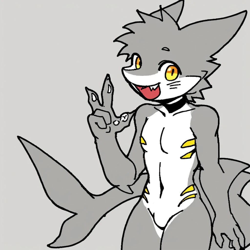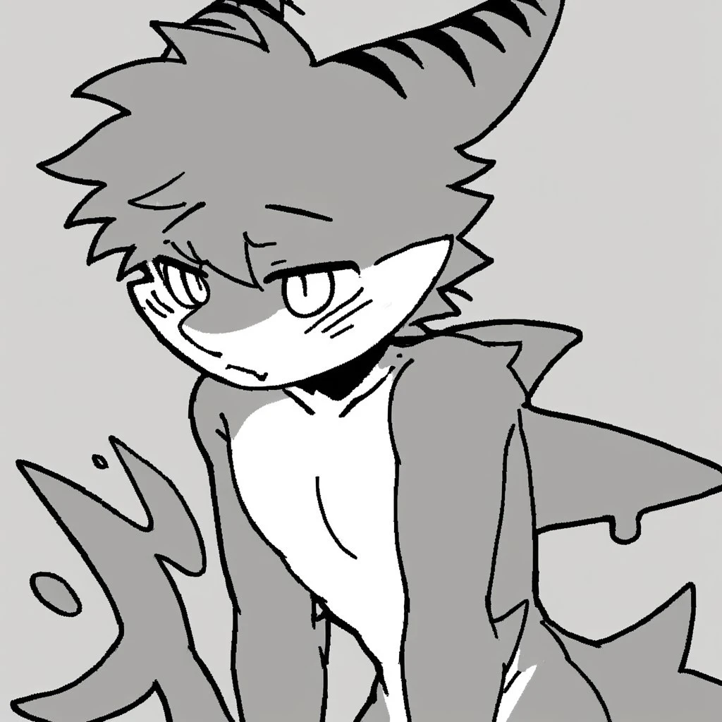 shark, anthro, furry, gray skin, white skin, shark tail, animal ears, gray hair