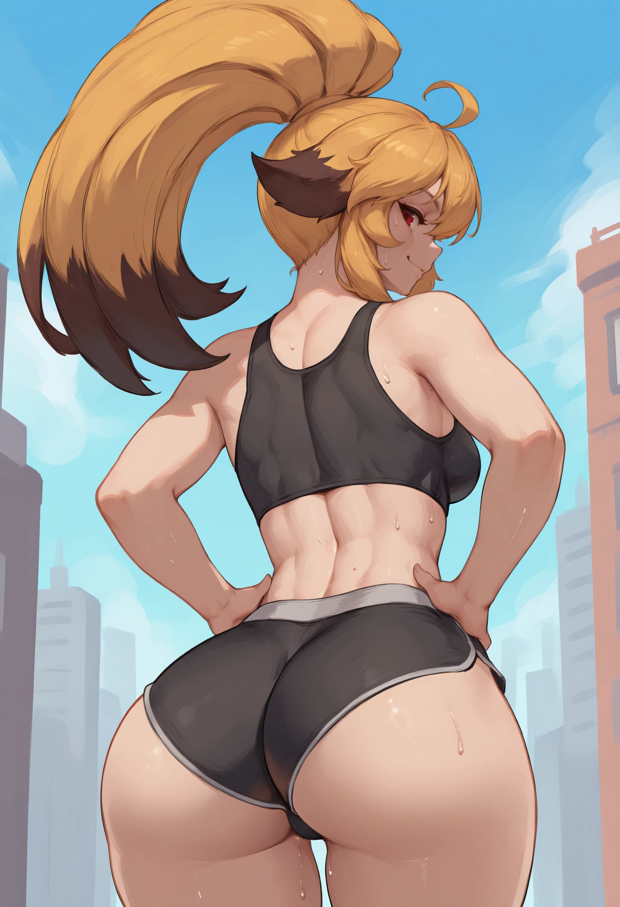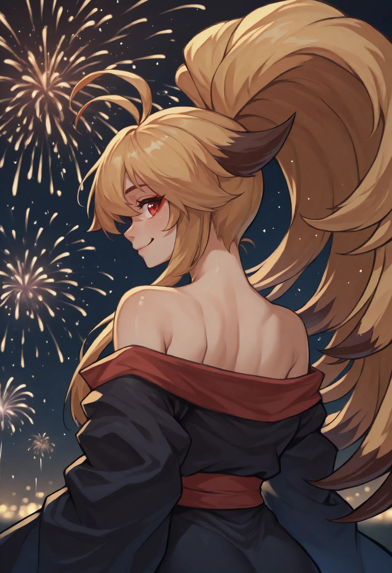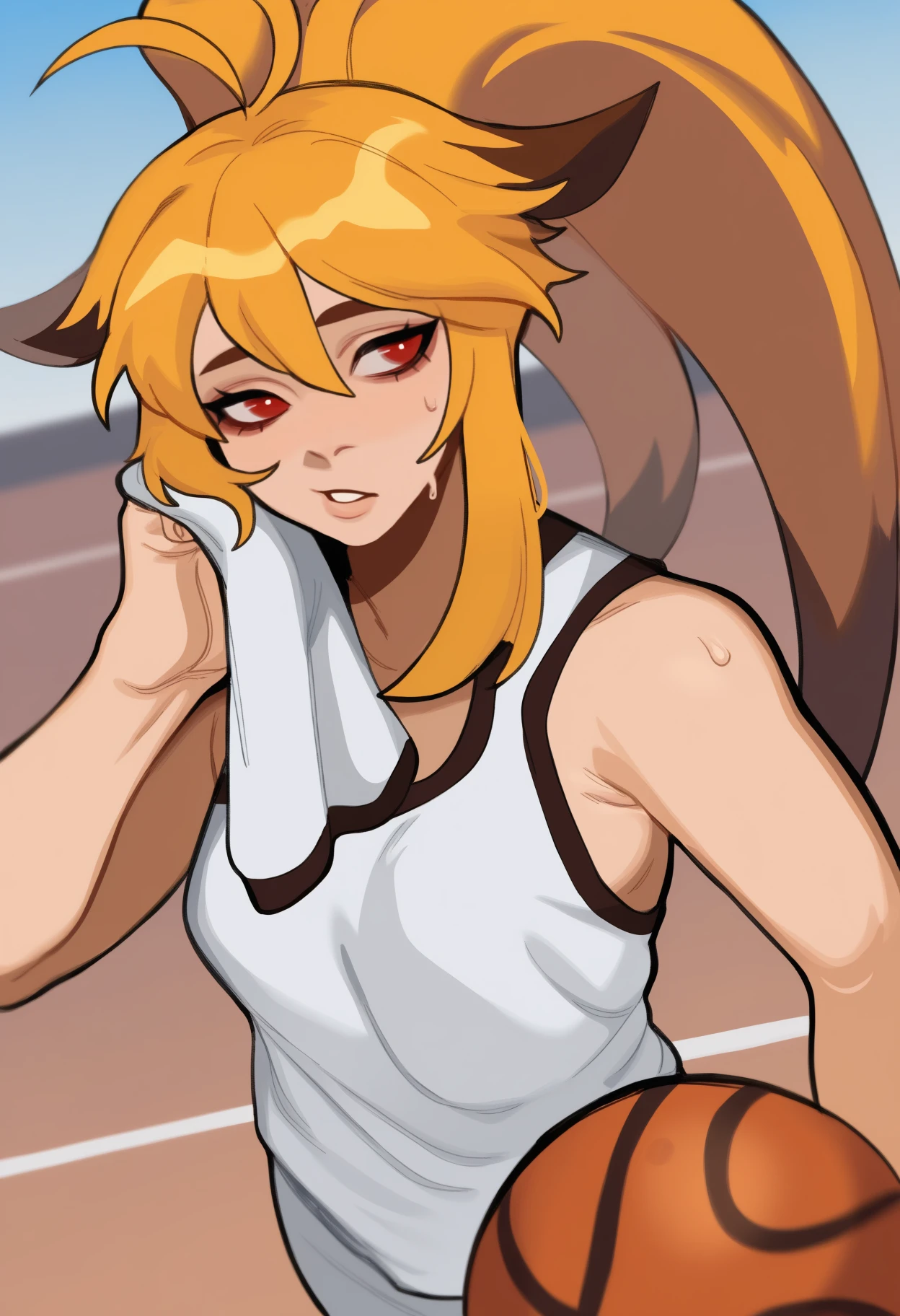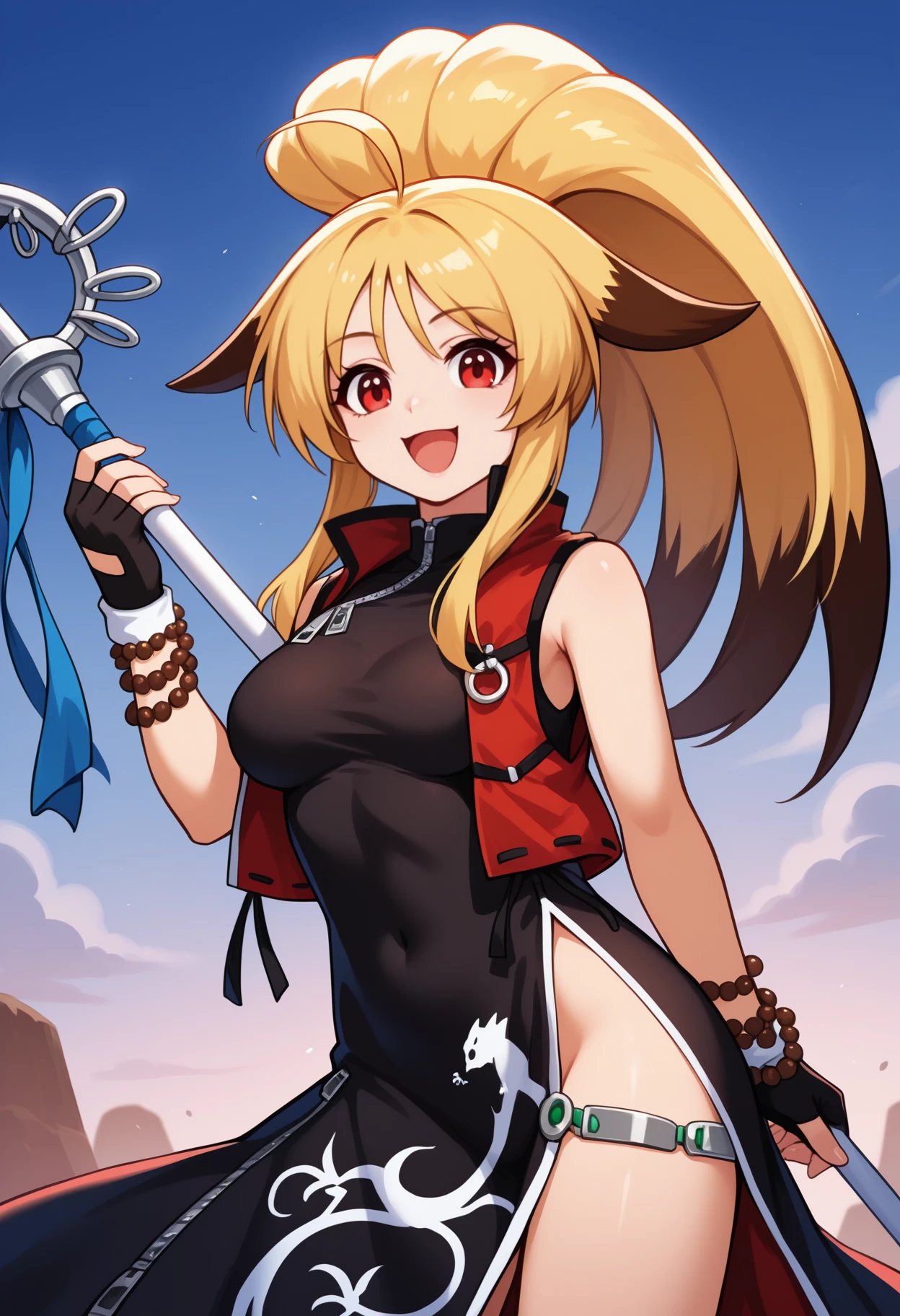 xiaomu, long hair, two-tone hair, blonde hair, ahoge, ponytail, animal ears, red eyes