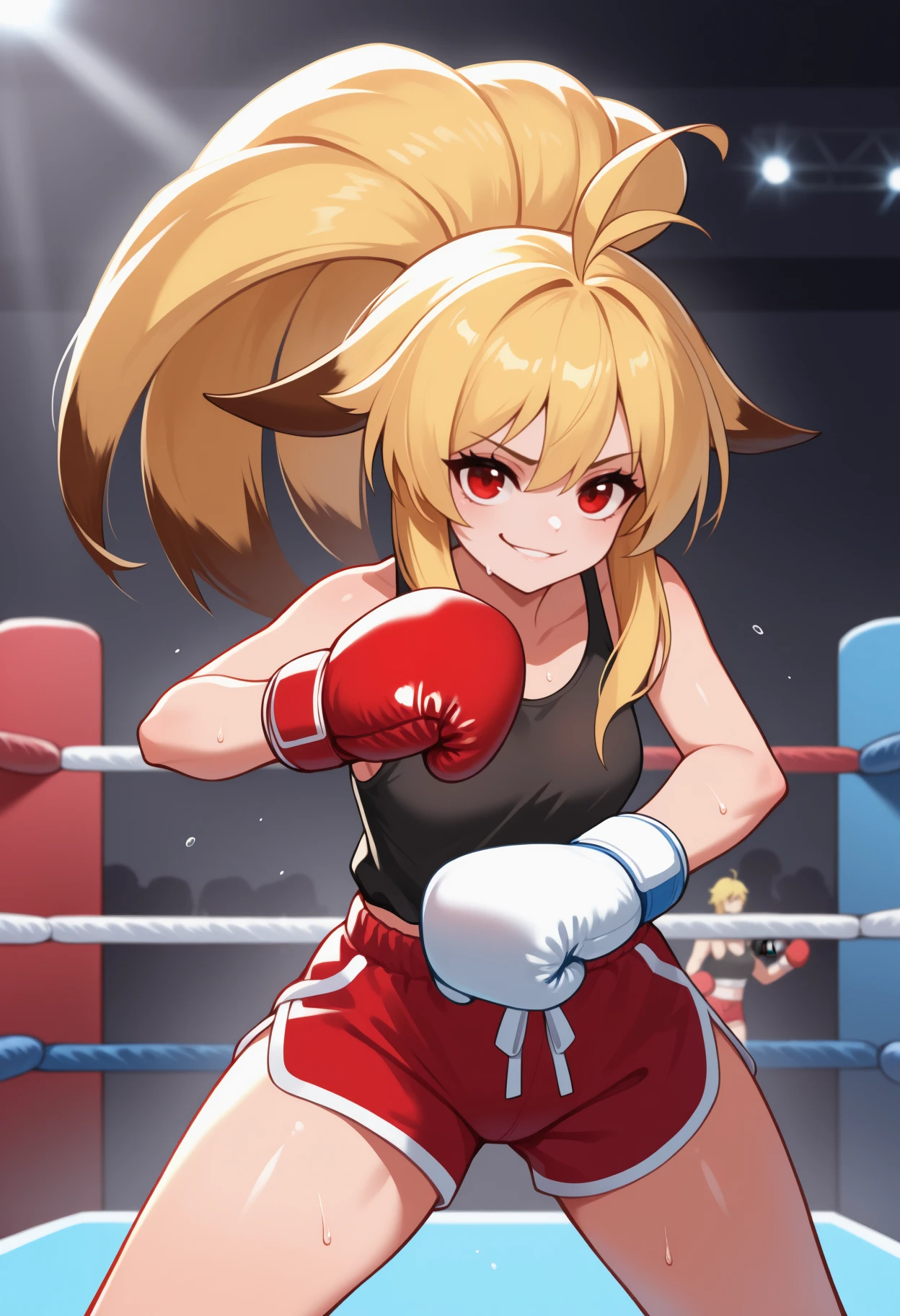 Trigger + Appearance: xiaomu, long hair, two-tone hair, blonde hair, ahoge, ponytail, animal ears, red eyes