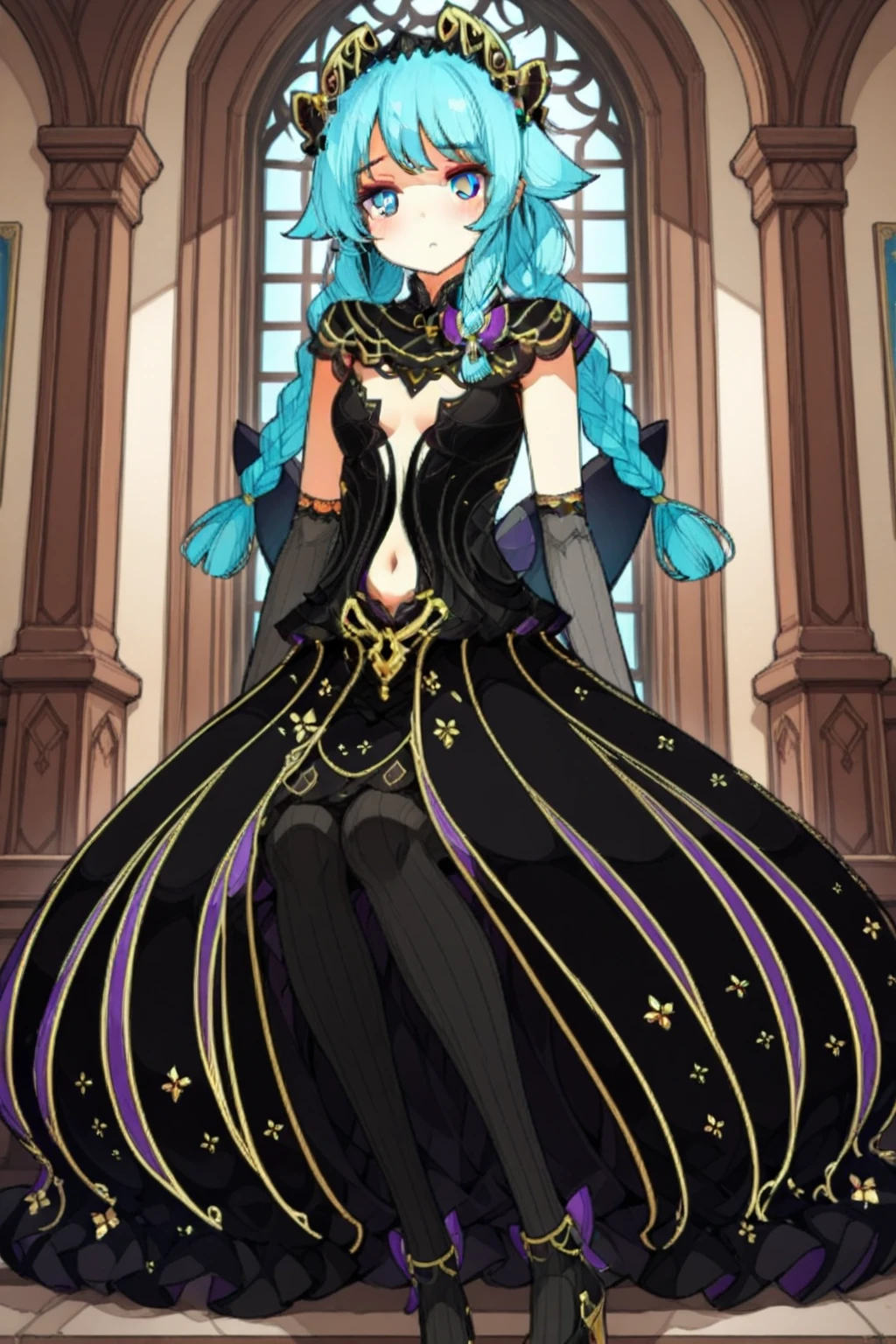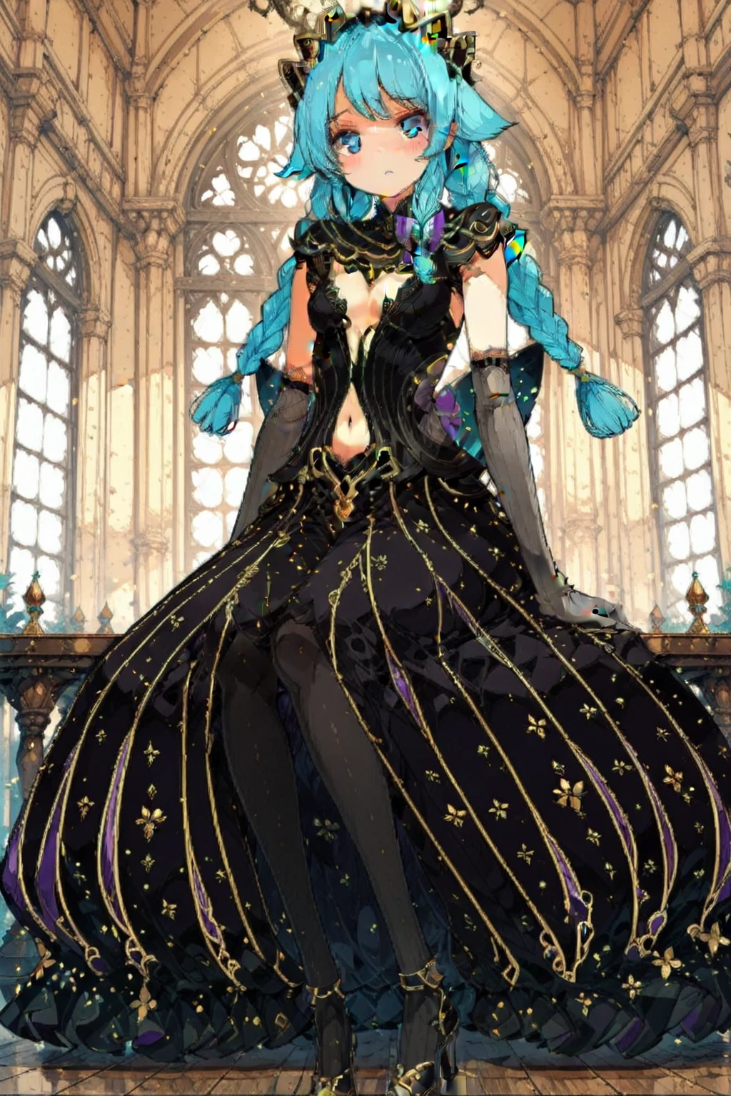 score_9, score_8_up, score_7_up, masterpiece, best quality, 1girl, solo, mordimort \(stella glow\), mordimort \(goddess\), long blue hair, twin braids, blue eyes, black dress, center opening, navel cutout, navel, elbow gloves, grey gloves, black pantyhose, high heels, sitting, blush, indoors, looking at viewer, anime coloring, sharp focus