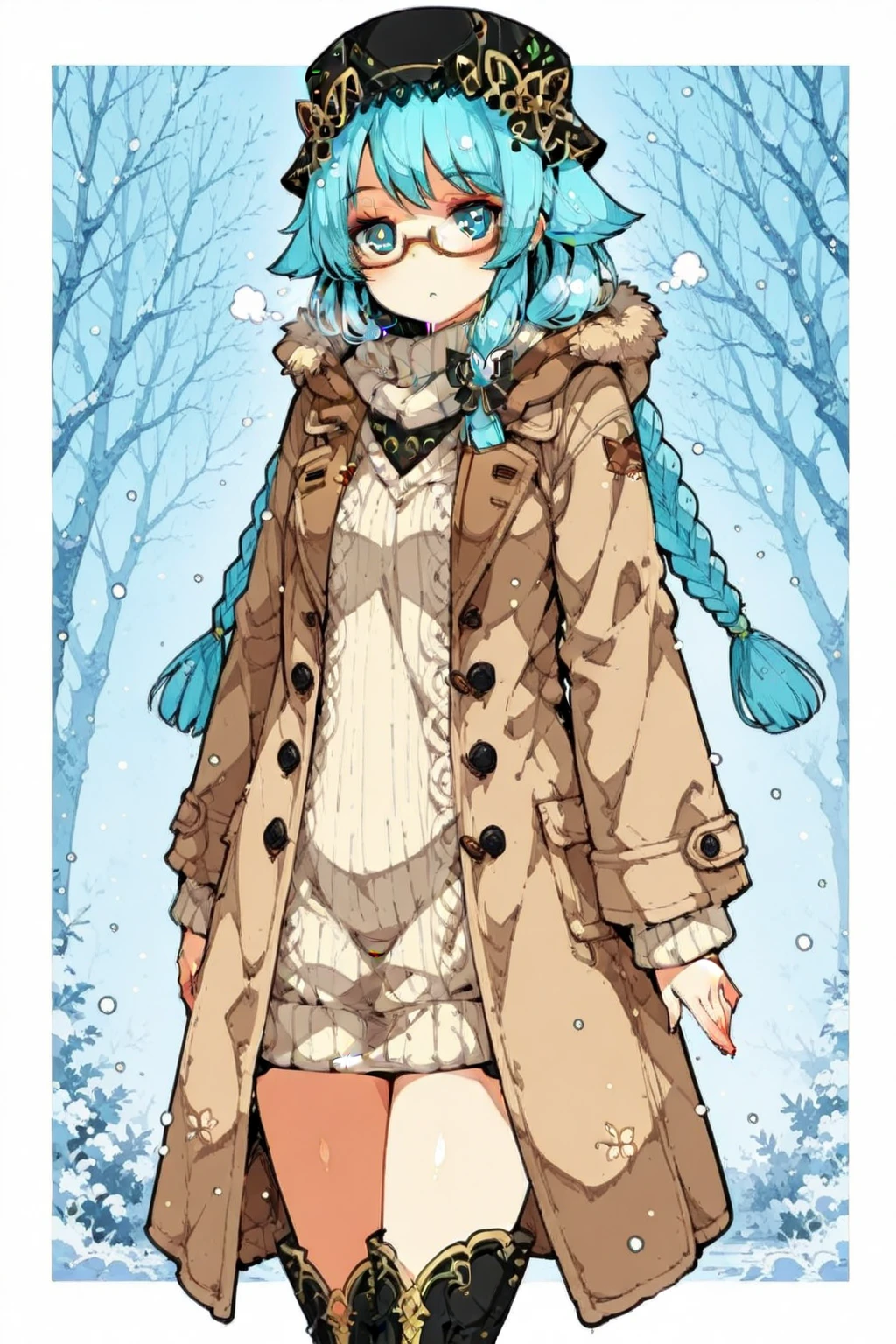 mordimort \(stella glow\), 1girl, solo, winter clothes, coat, jacket, sweater dress, hat, thigh boots, boots, under-rim eyewear, semi-rimless eyewear