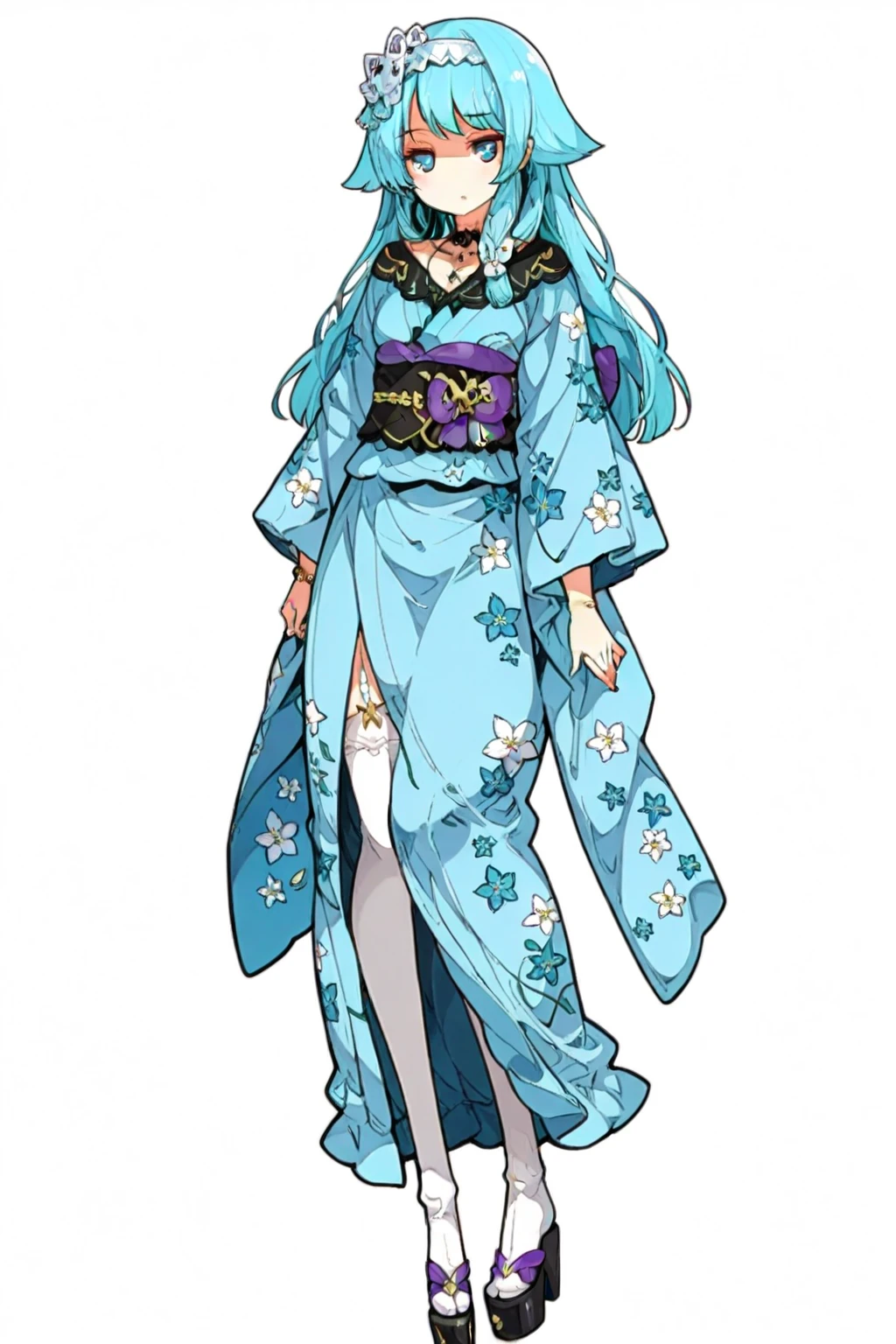 mordimort \(stella glow\), 1girl, solo, japanese clothes, blue kimono, yukata, print kimono, floral print, wide sleeves, necklace, white hairband, white thighhighs, garter straps, tabi, platform footwear, high heels