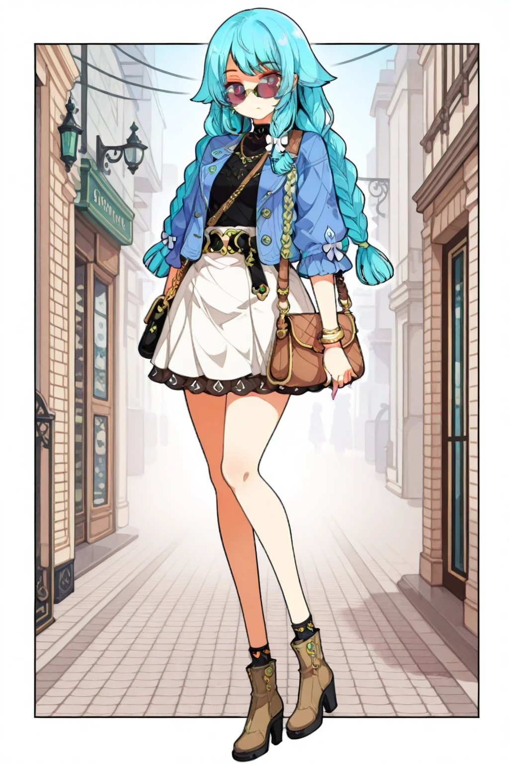 mordimort \(stella glow\), 1girl, solo, blue jacket, open jacket, black shirt, white skirt, high-waist skirt, miniskirt, belt, glasses, round eyewear, tinted eyewear, looking over eyewear, jewelry, handbag, high heel boots, ankle boots