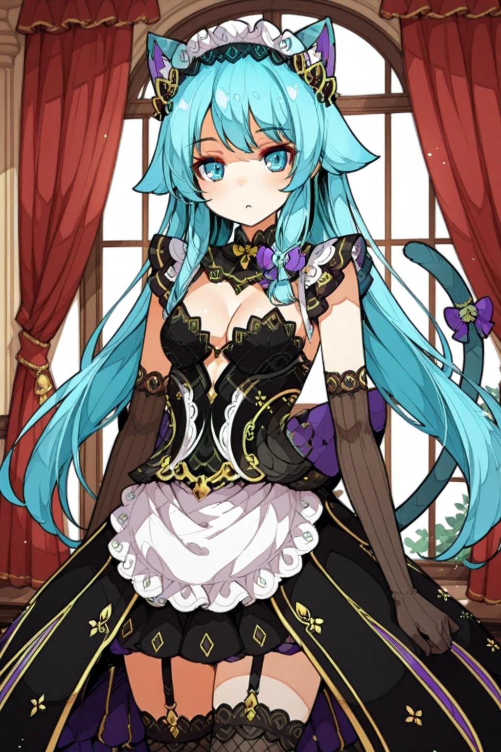 mordimort \(stella glow\), 1girl, solo, black dress, apron, maid apron, maid headdress, cat ears, cat tail, fake animal ears, detached collar, black gloves, elbow gloves, garter straps, fishnet thighhighs, frilled thighhighs, cleavage