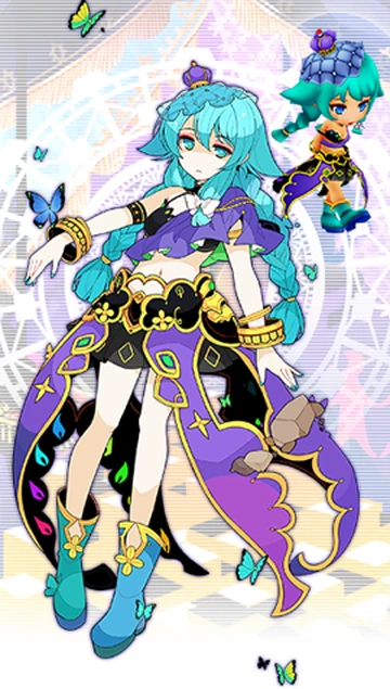Mordimort is the Earth Witch, known for her sluggish, deadpan personality and her unique way of speaking. She is a master of illusions and earth-based magic. Visually, she is defined by her long blue hair styled into thick twin braids and her deep blue eyes. While her canon personality is "lazy," her wardrobe is incredibly diverse, ranging from her sophisticated Goddess form to various thematic costumes like school uniforms, kimonos, and maid outfits. She often wears accessories like hairbands, ribbons, or eyewear (glasses) that complement her sleepy yet intelligent aura.