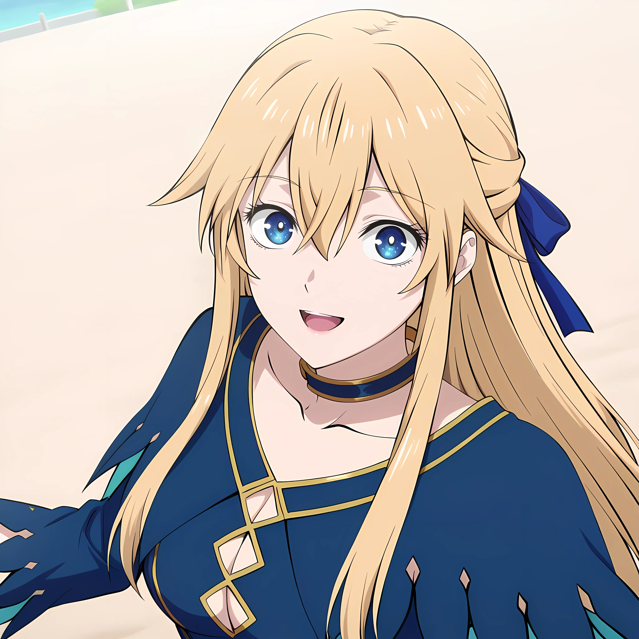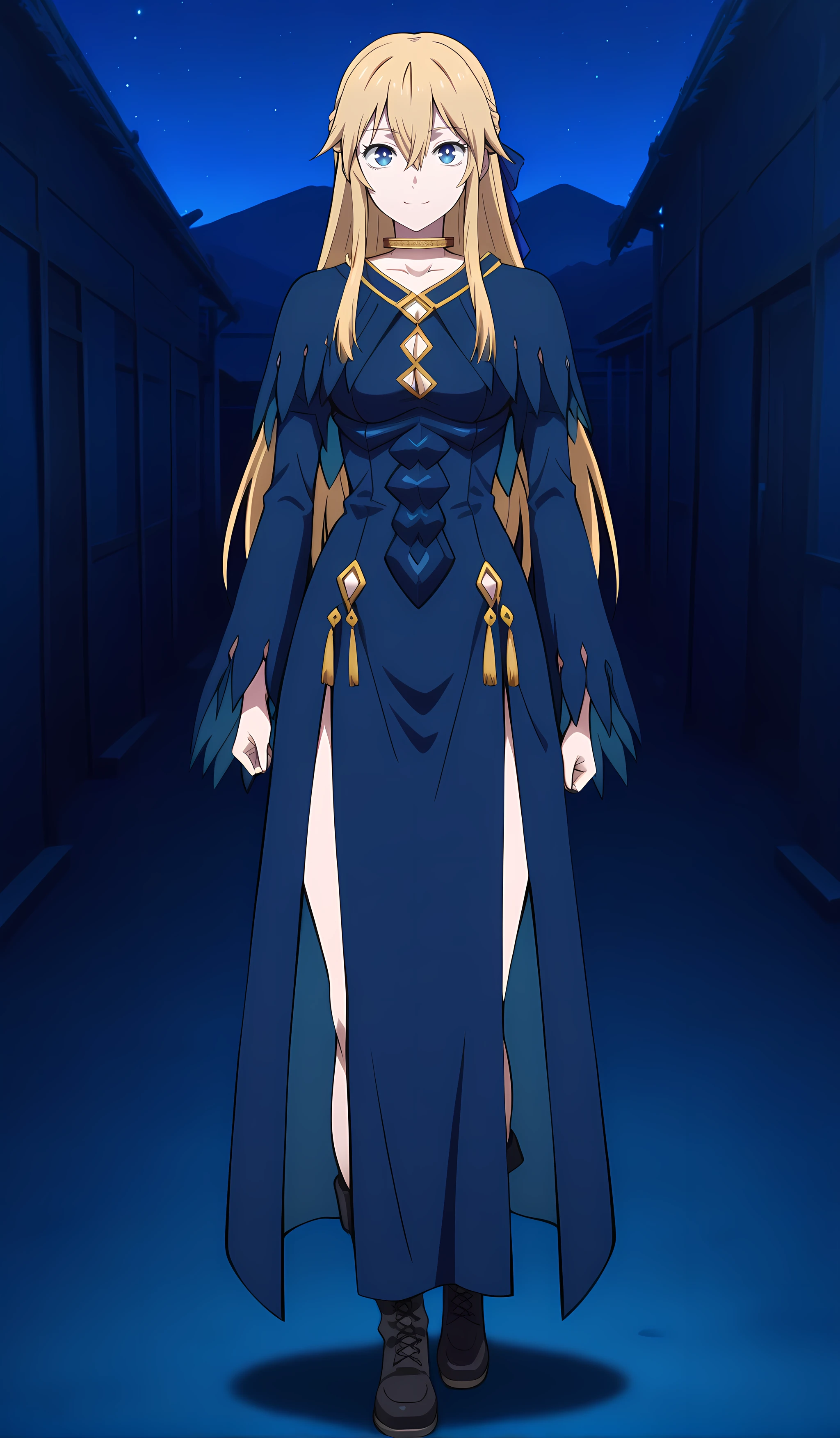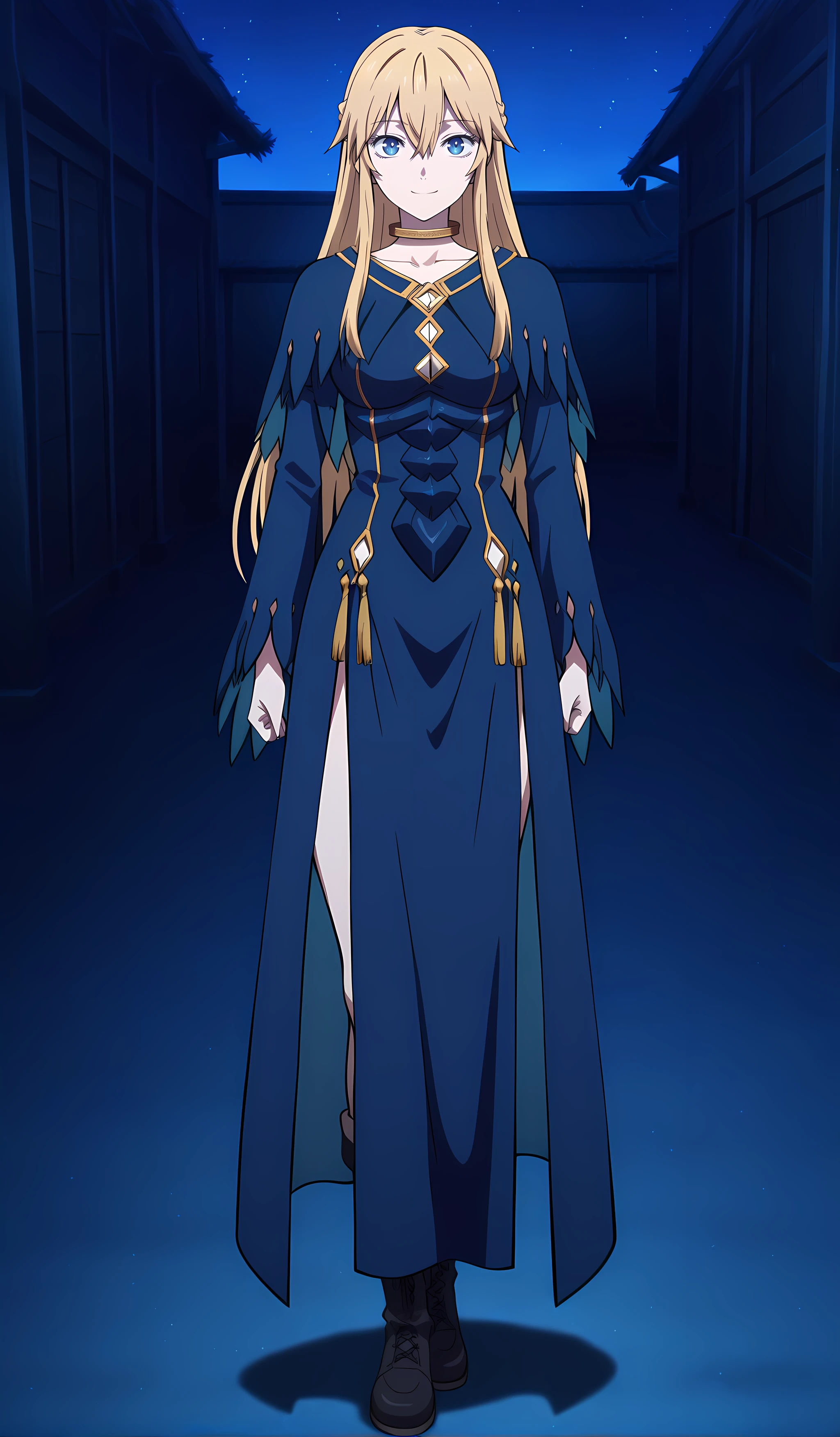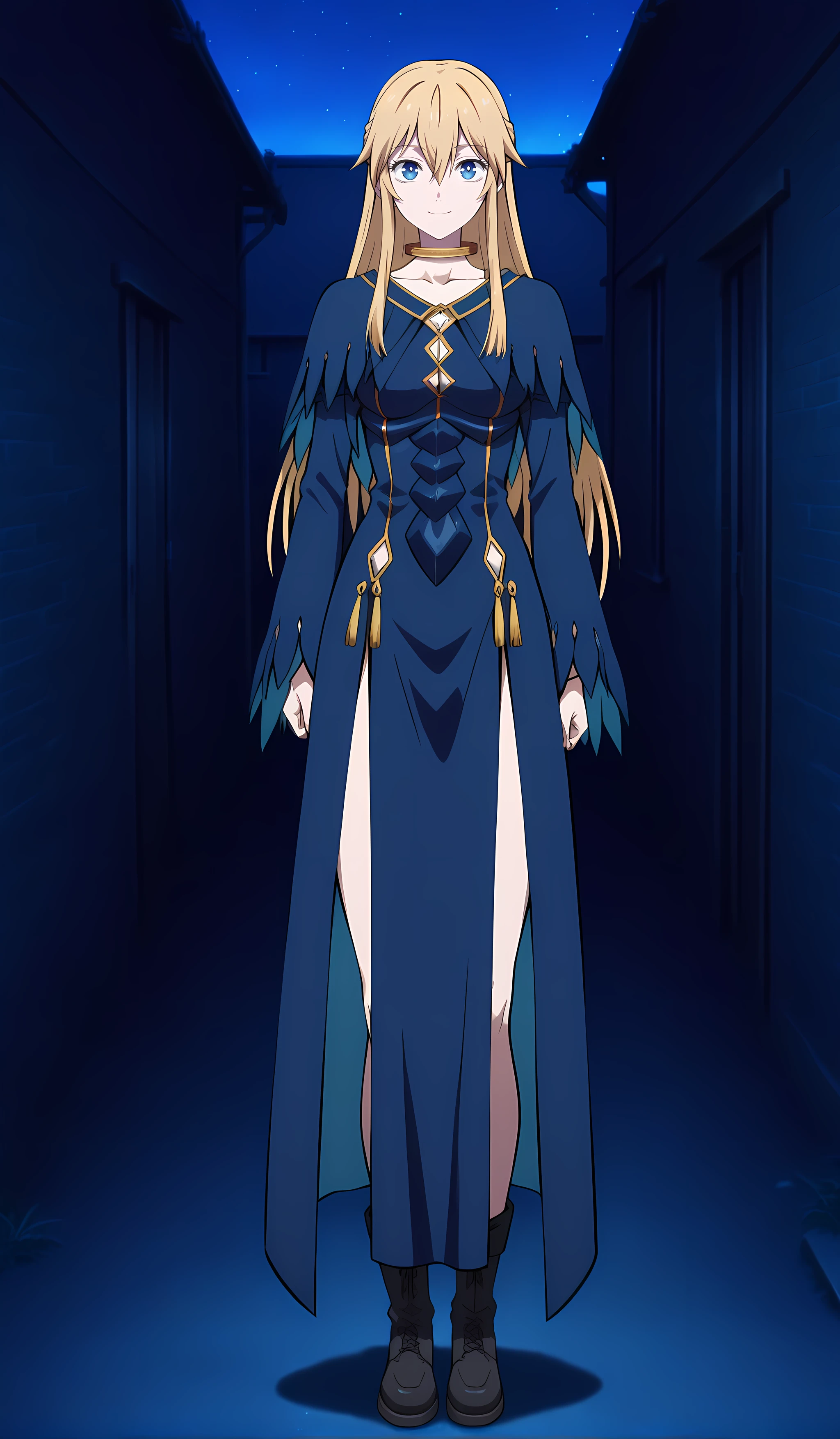 seraphinadelavilant_mdfdver, 1girl, blonde hair, blue eyes, long hair, boots, dress, black footwear, medium breasts, standing, blue dress, hair between eyes, genderswap (mtf), genderswap, anime coloring