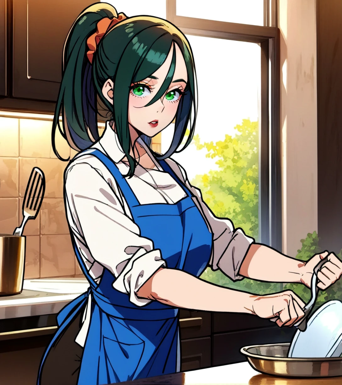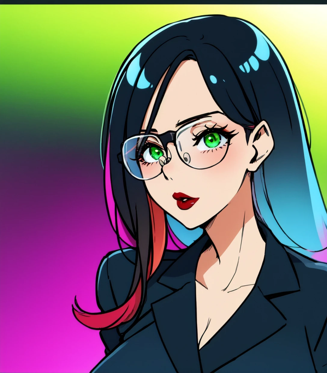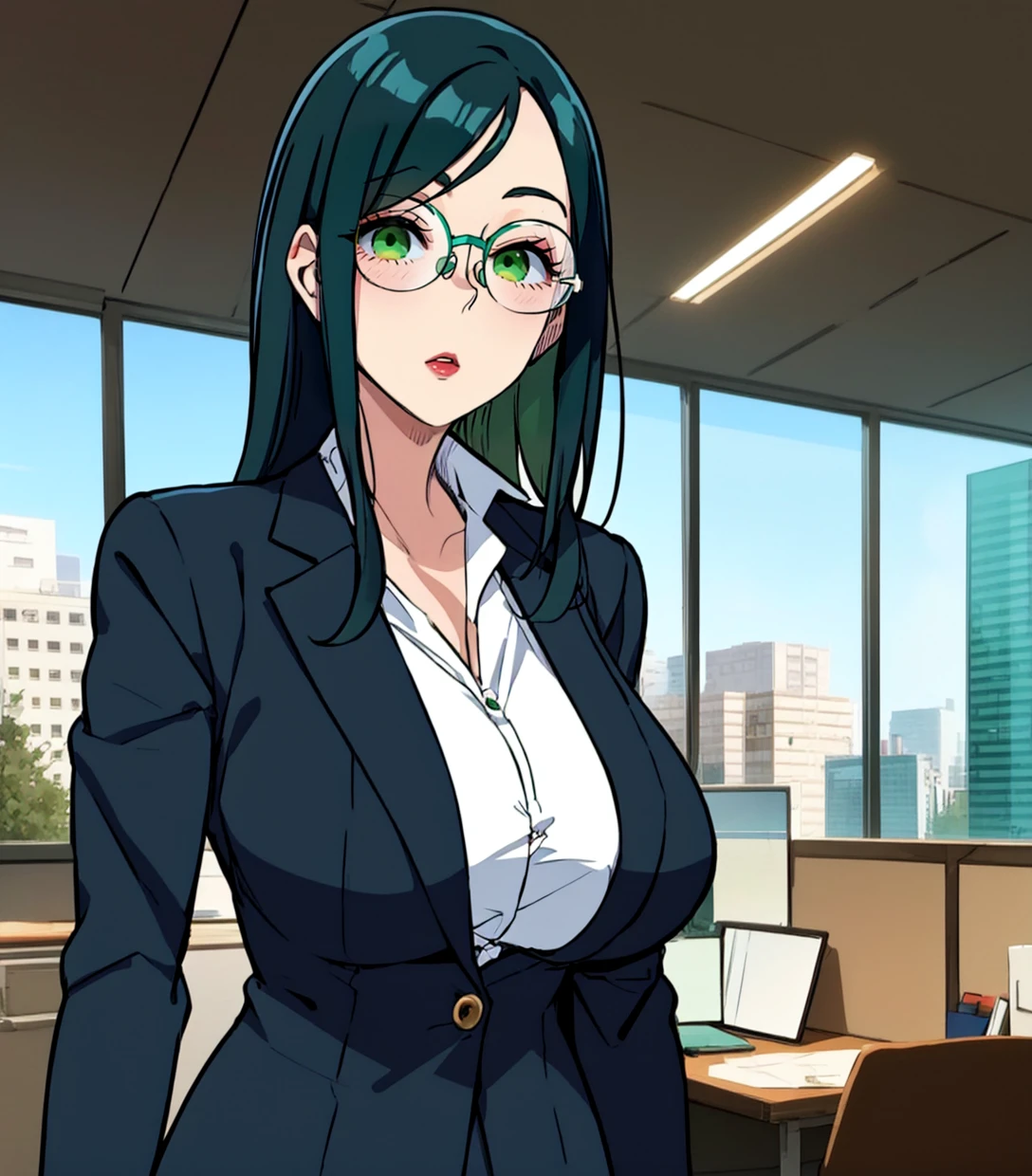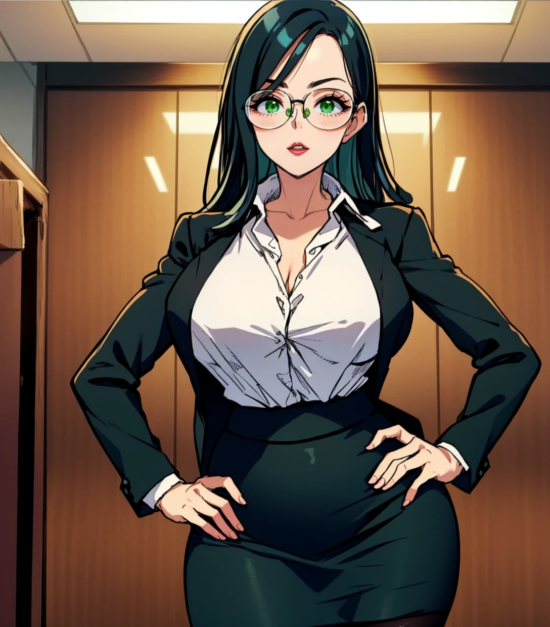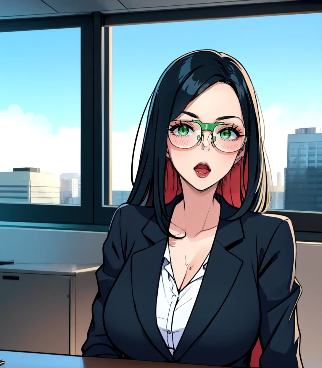 shdwrouge, maturefemale,long hair, lipstick,black hair, hair between eyes,green eyes, glasses,officelady, white shirt, blazer,pencil skirt
