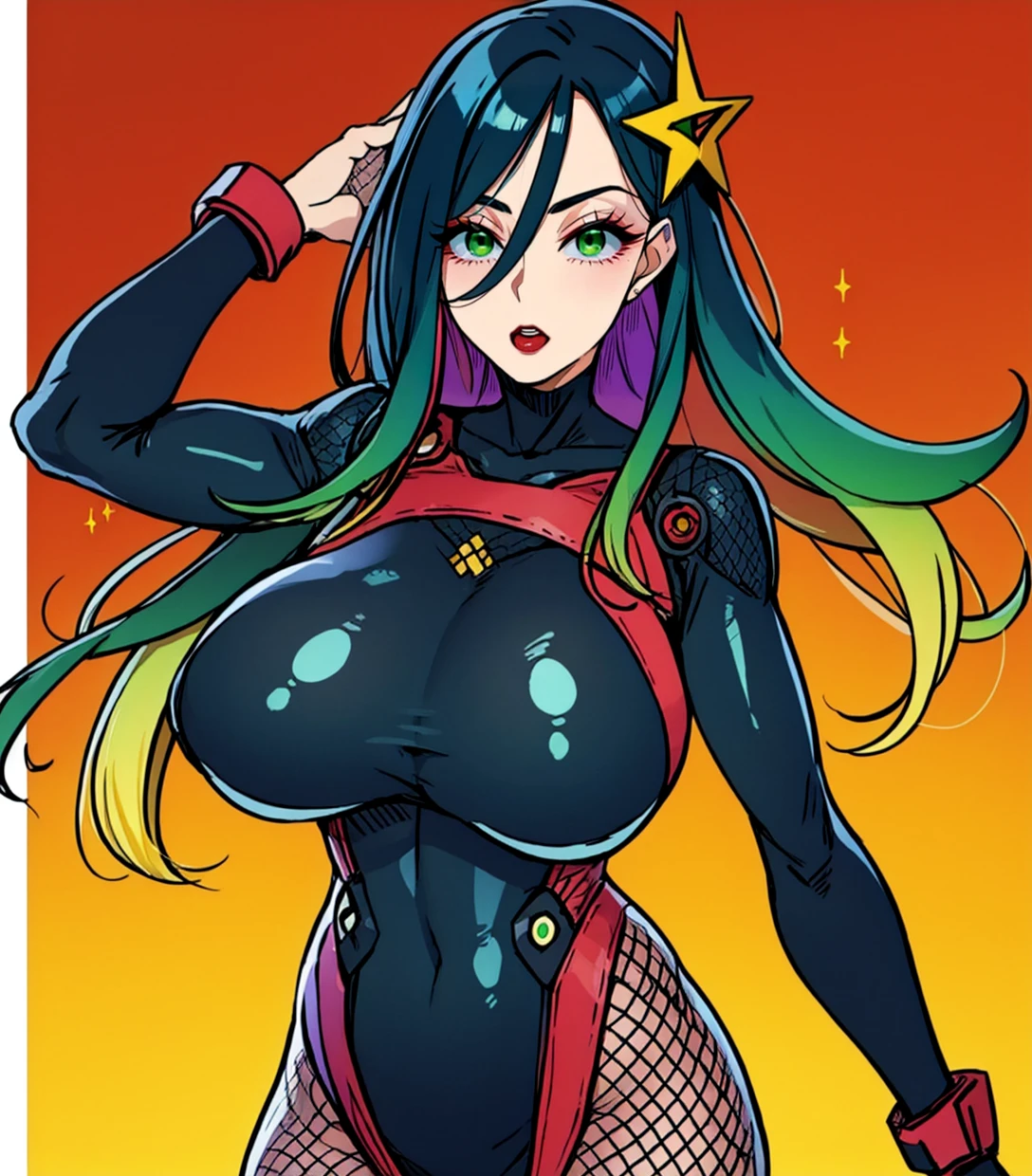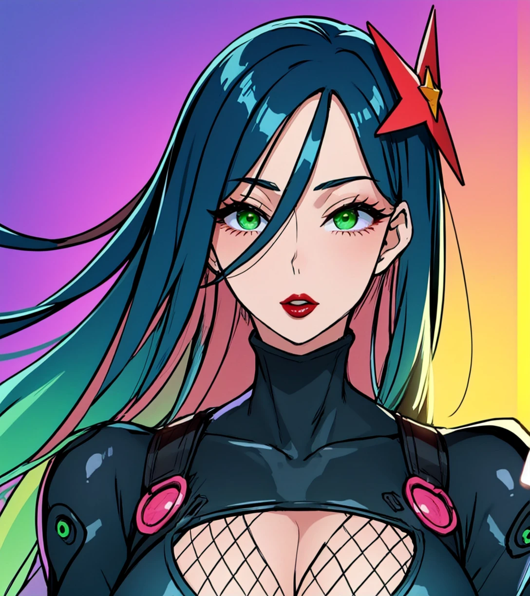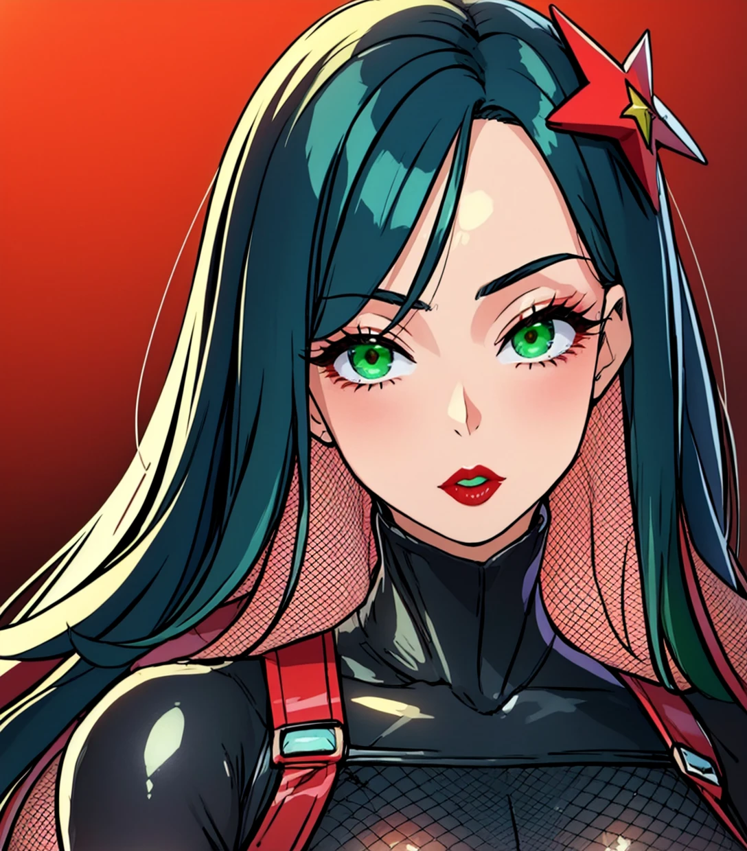 shdwrouge, maturefemale,long hair, lipstick,black hair, hair between eyes,green eyes, star hair ornament, ninja bodysuit,fishnet,cleavage