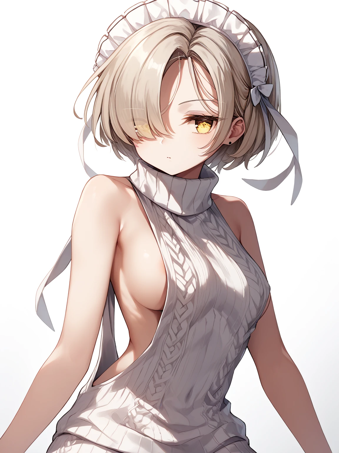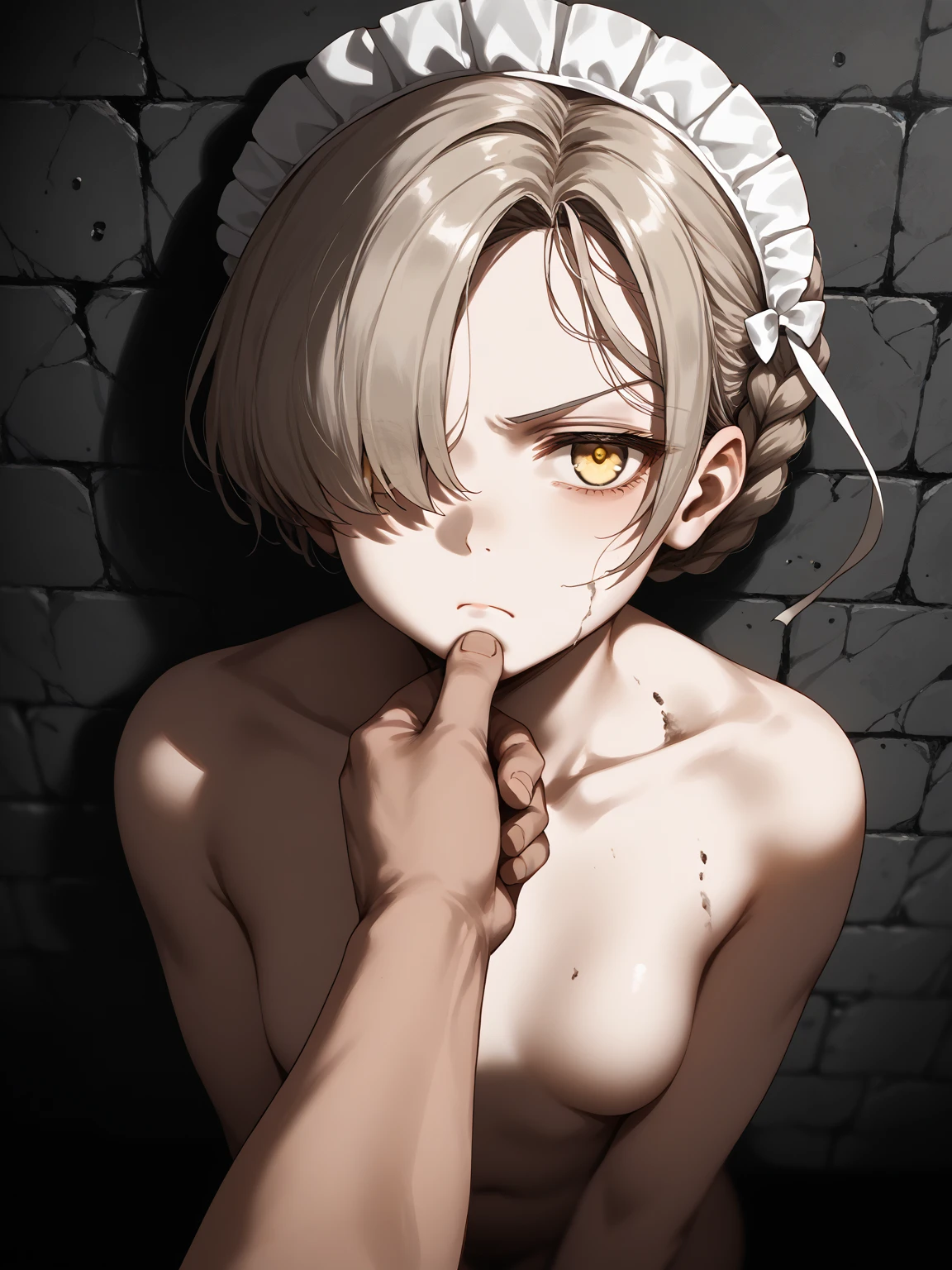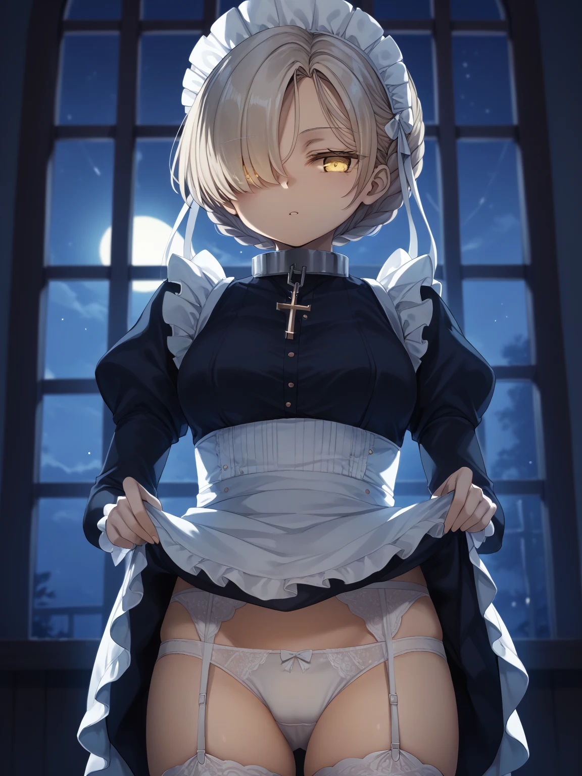 sheffield \(azur lane\), yellow eyes,short hair, hair over one eye,braid, maid headdress,maid,metal collar, cross,apron,