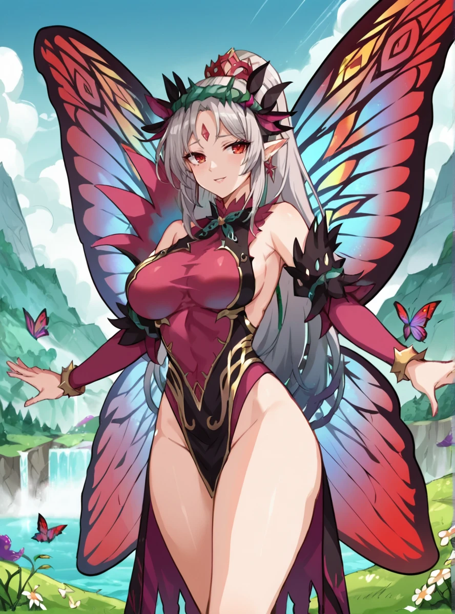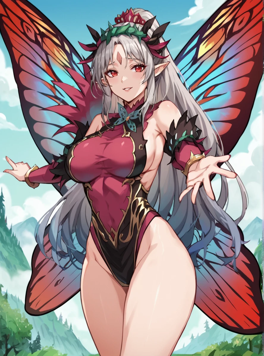 long hair, wings, fairy wings, red eyes, large breasts, grey hair, pointy ears, facial mark, forehead mark, , butterfly wings leotard,