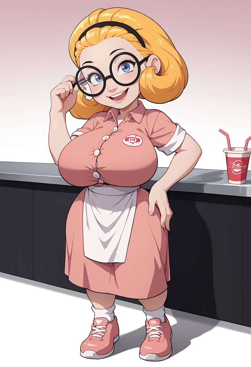 Daisy: daisy, shortstack, blonde hair, blue eyes, huge breasts, wide hips