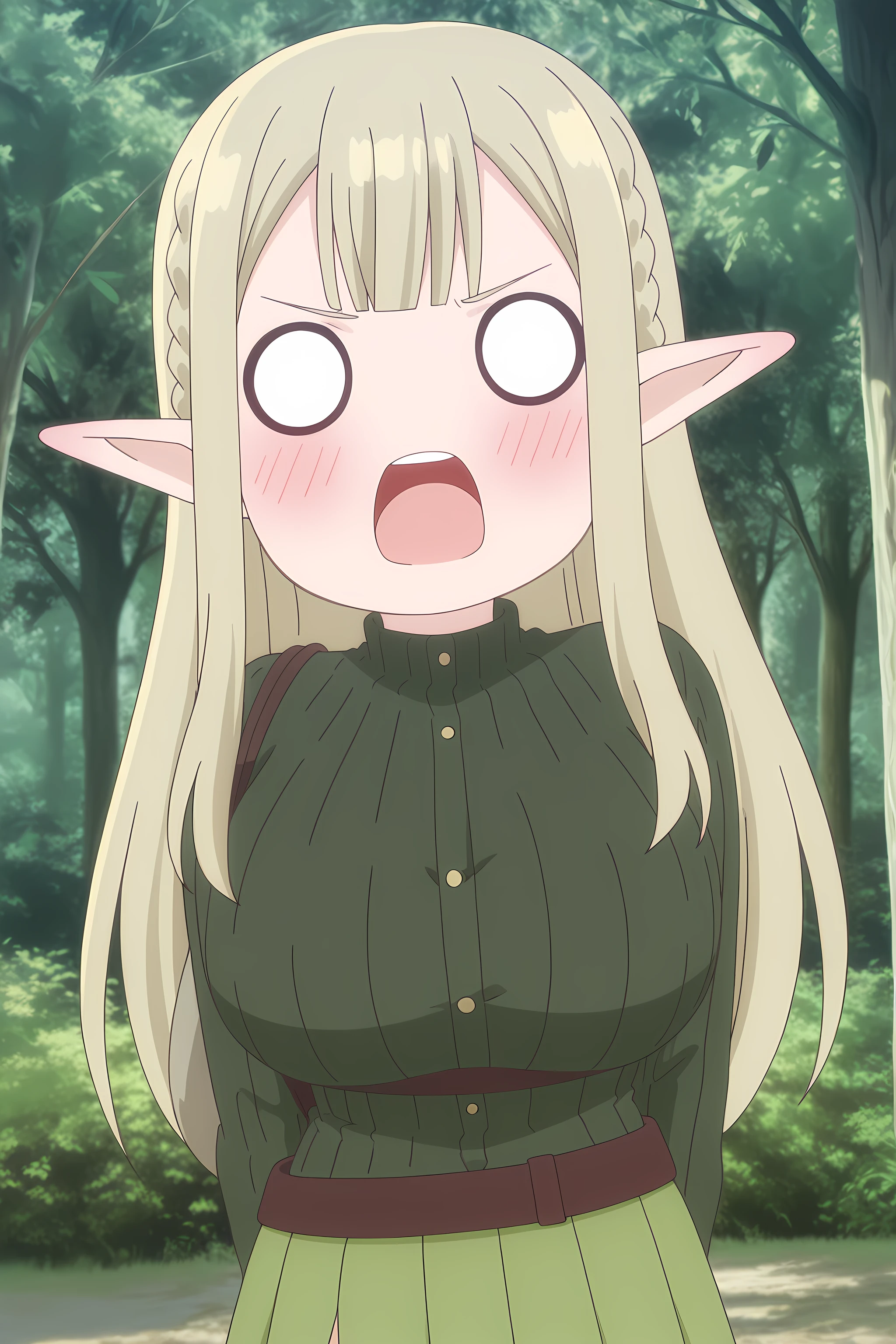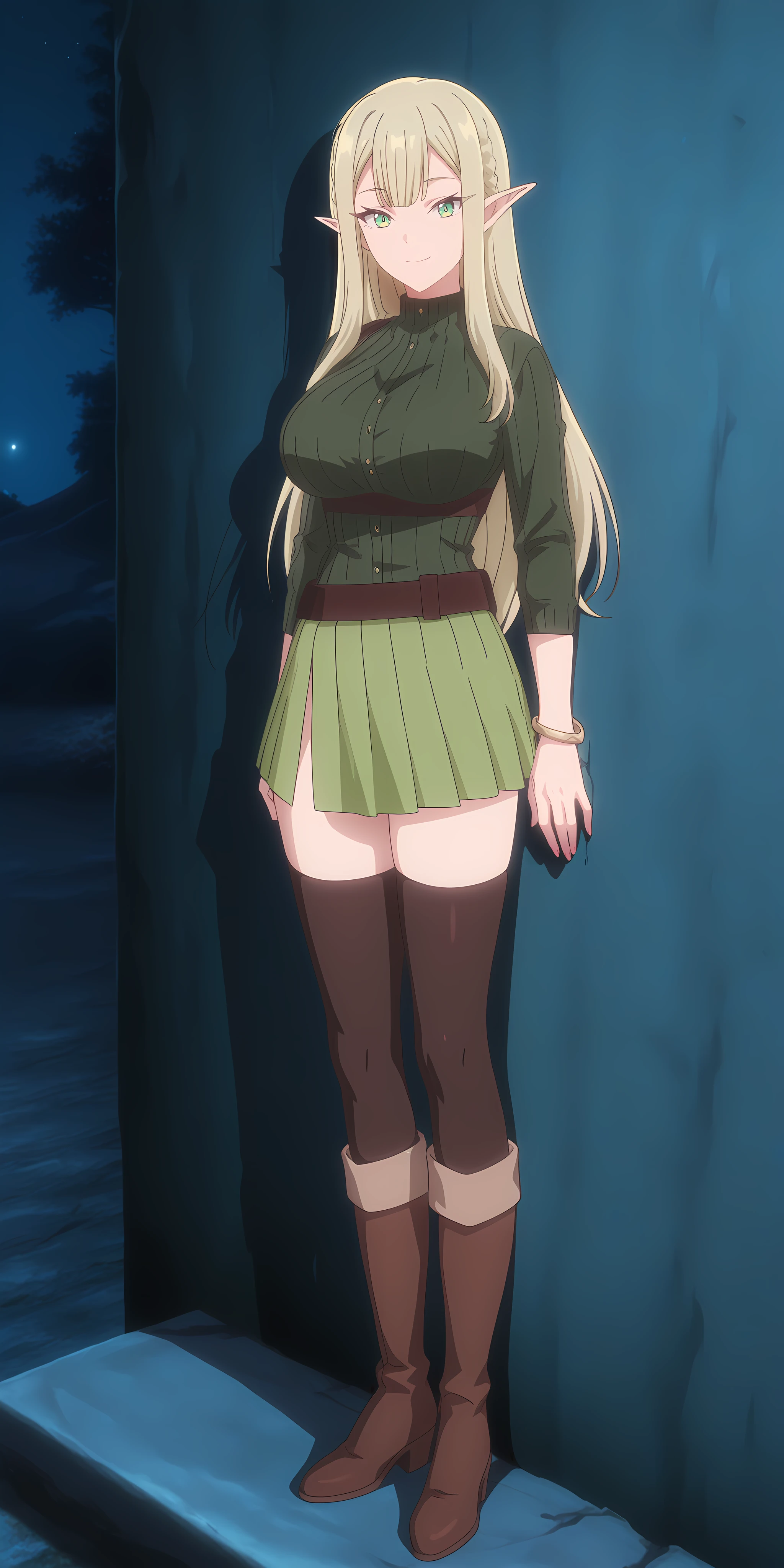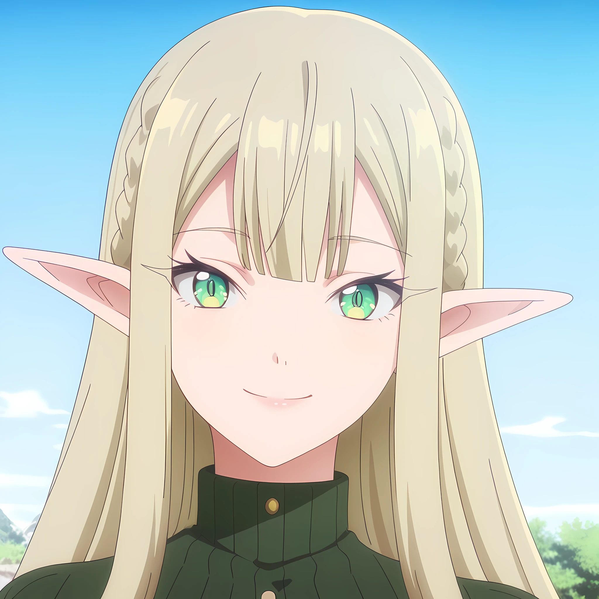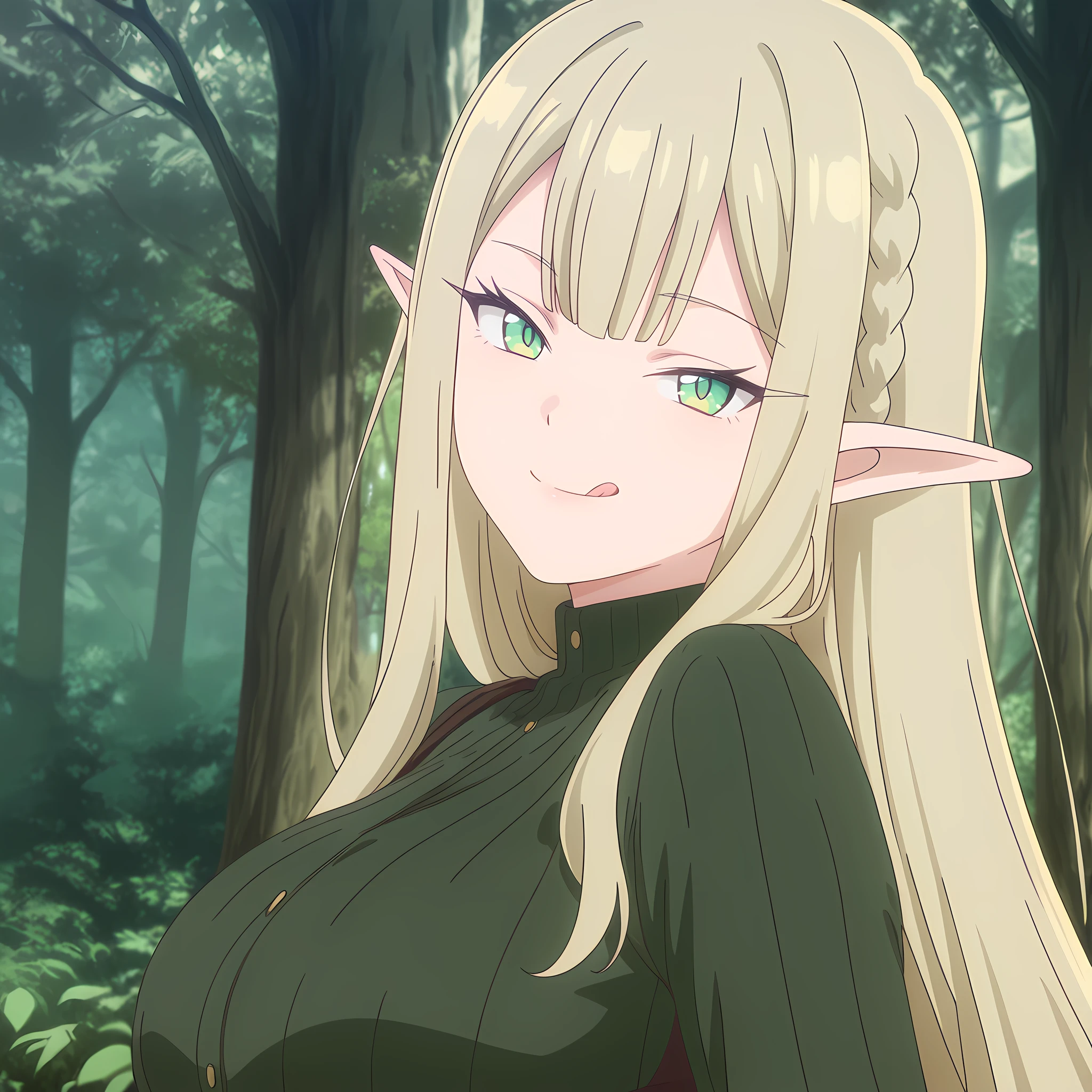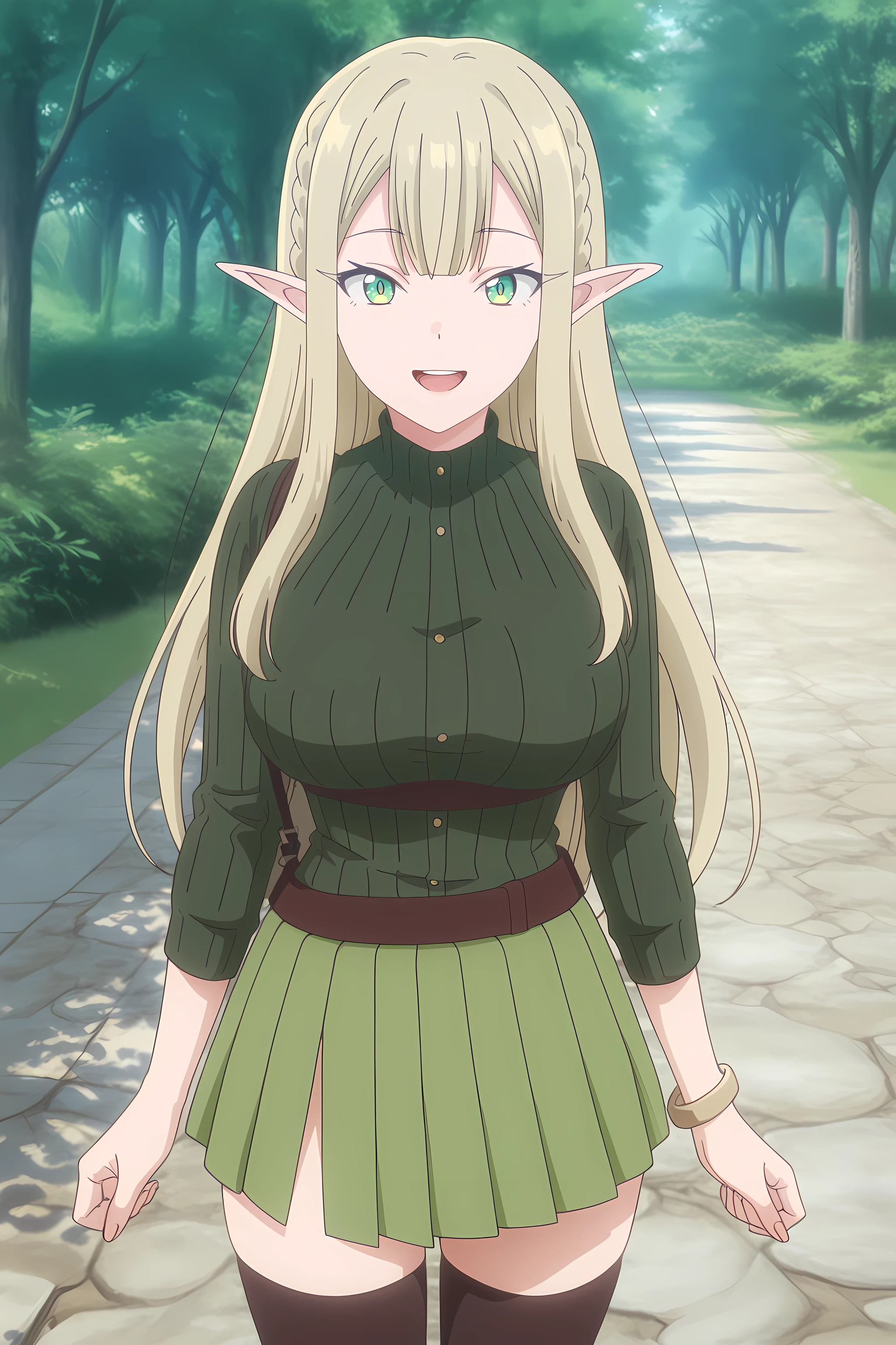 emalia_steinbart(kanteishi-kari), 1girl, elf, pointy ears, long hair, green eyes, blonde hair, large breasts,