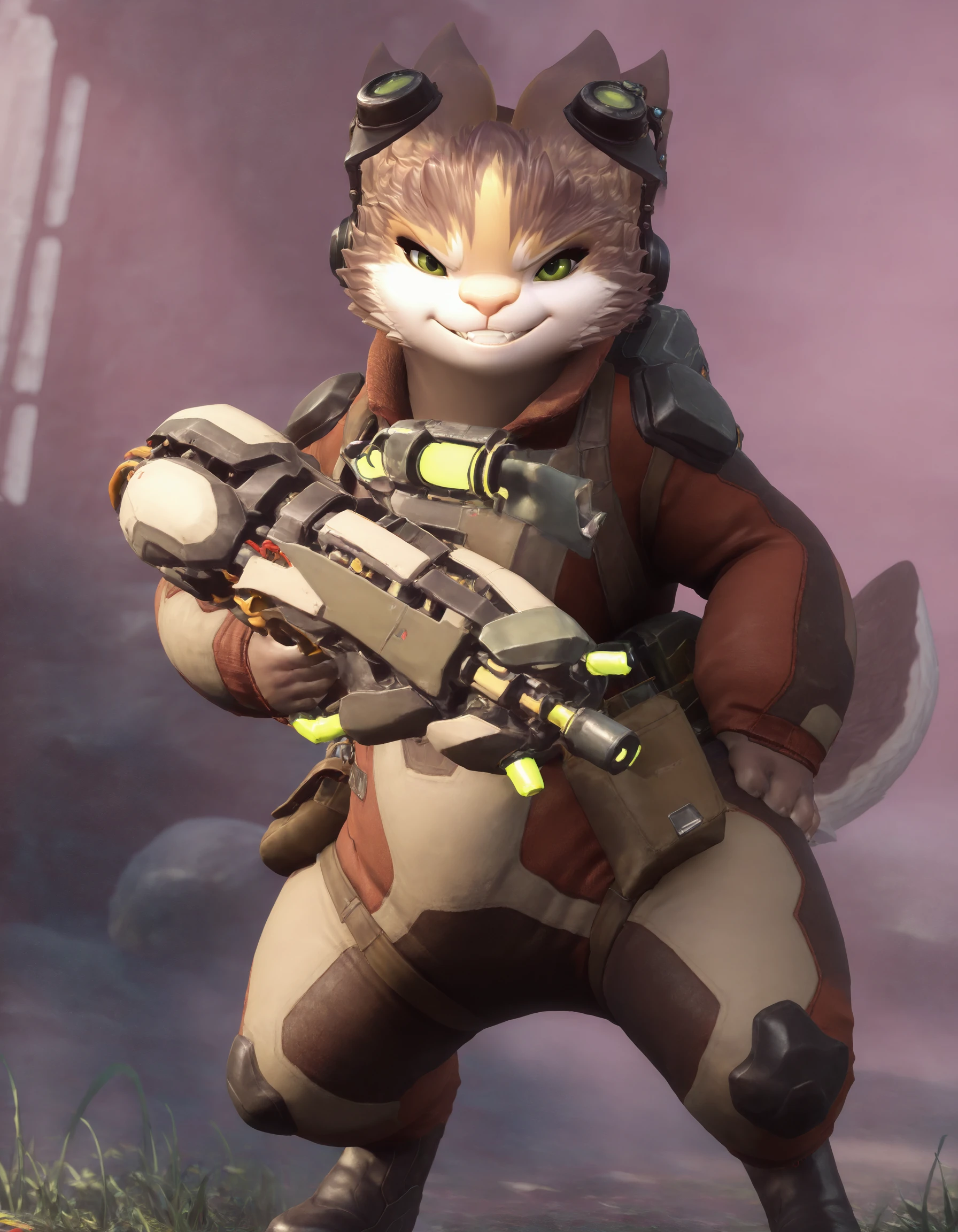 shortstack,female chirt,alien tech outfit,black shoes,goggles on her forehead,brown and white fur skin,tail,green eyes