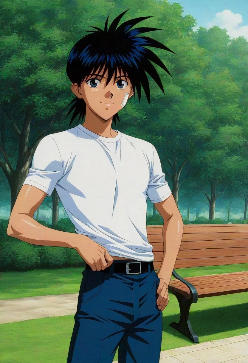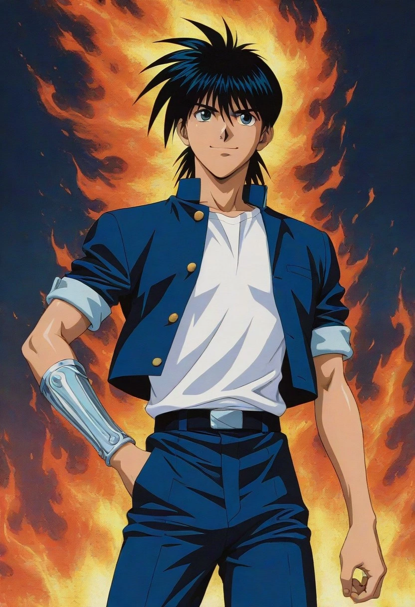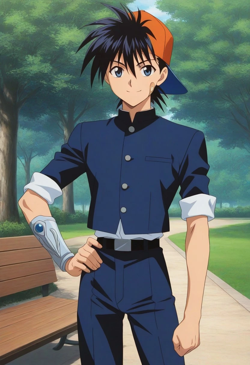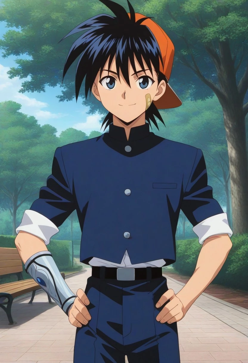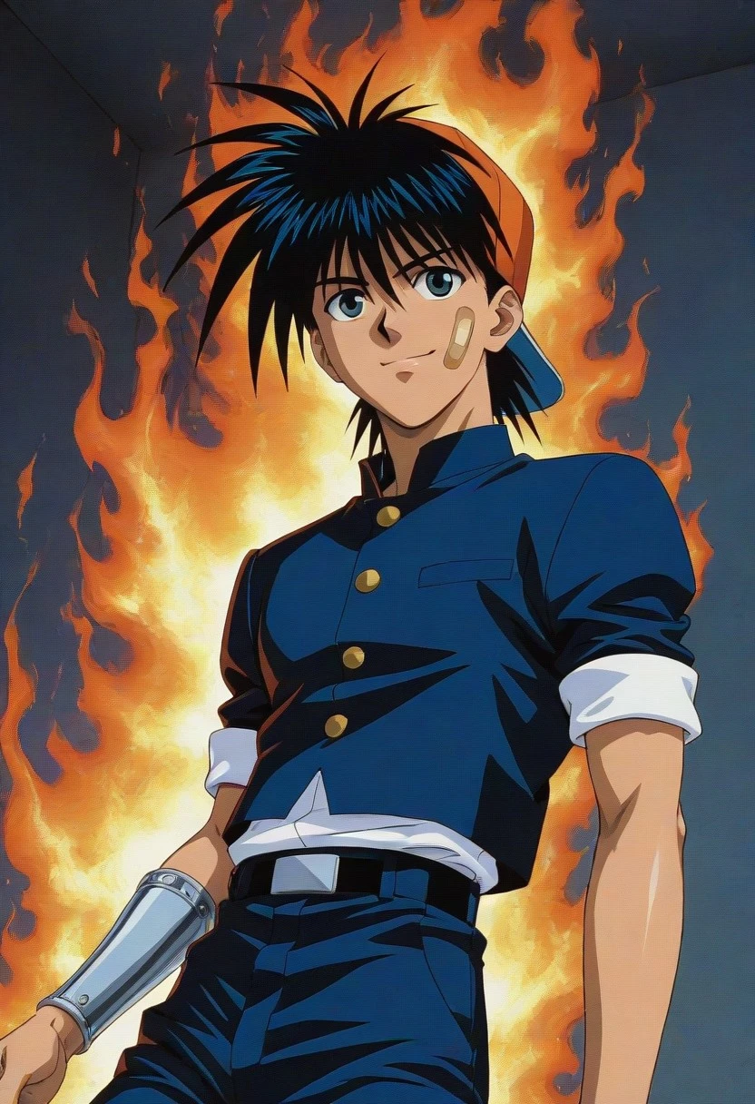 Recca Hanabishi, black hair, black-blue eyes, backwards orange cap, cheek bandaid, blue gakuran uniform, rolled sleeves, white shirt, single vambrace, belt, blue and white shoes