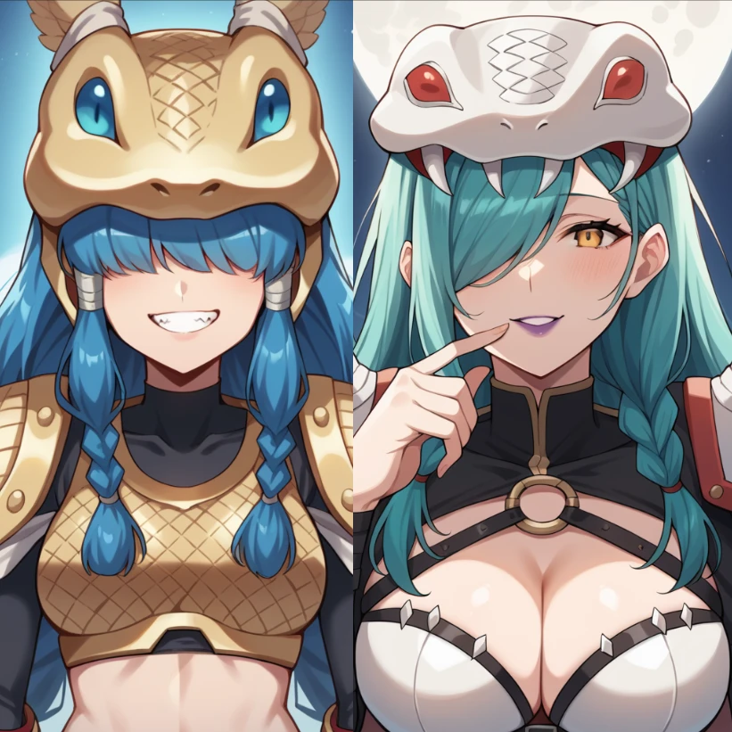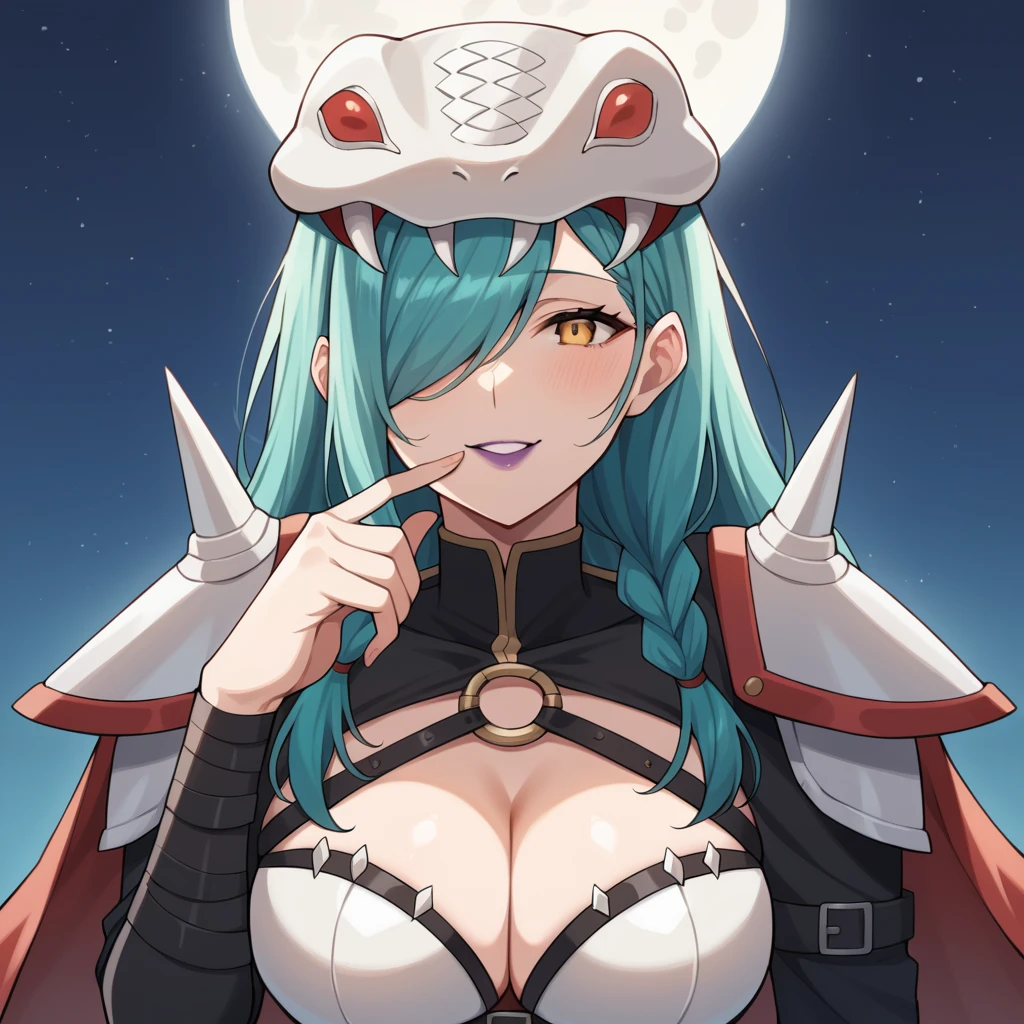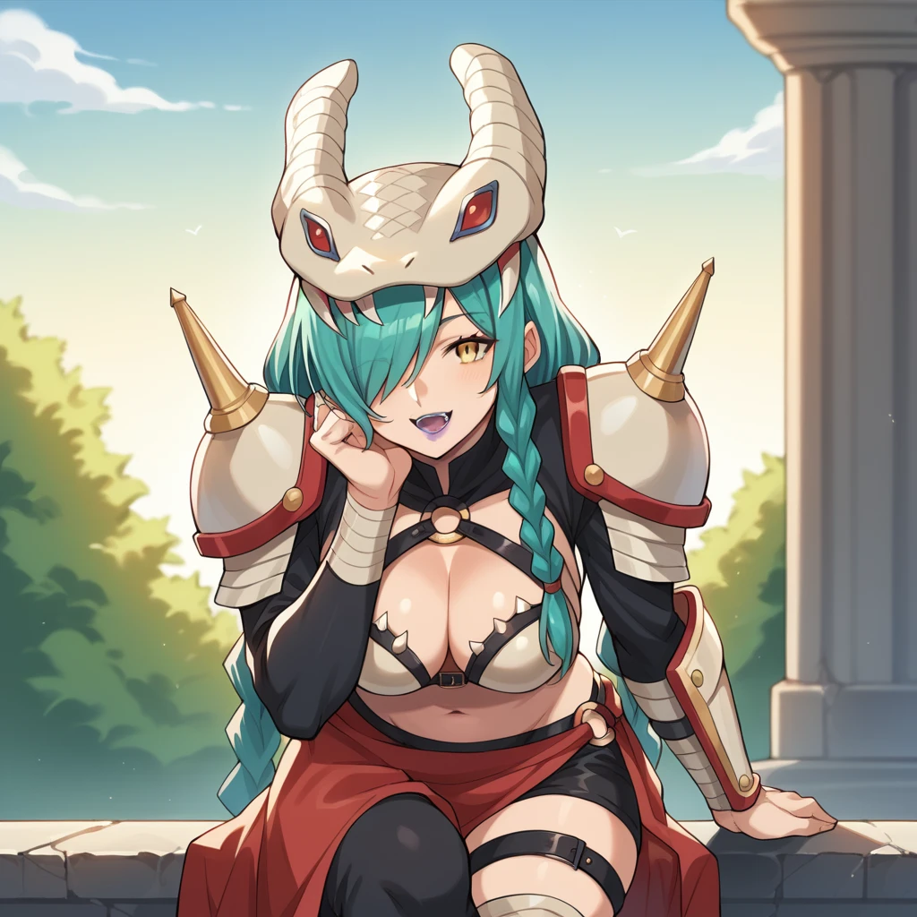 Mvon, Mervamon, long hair, aqua hair, braided ponytails, twin braids, single braid, hair over one eye, purple lipstick, yellow eyes, snake head, helmet,