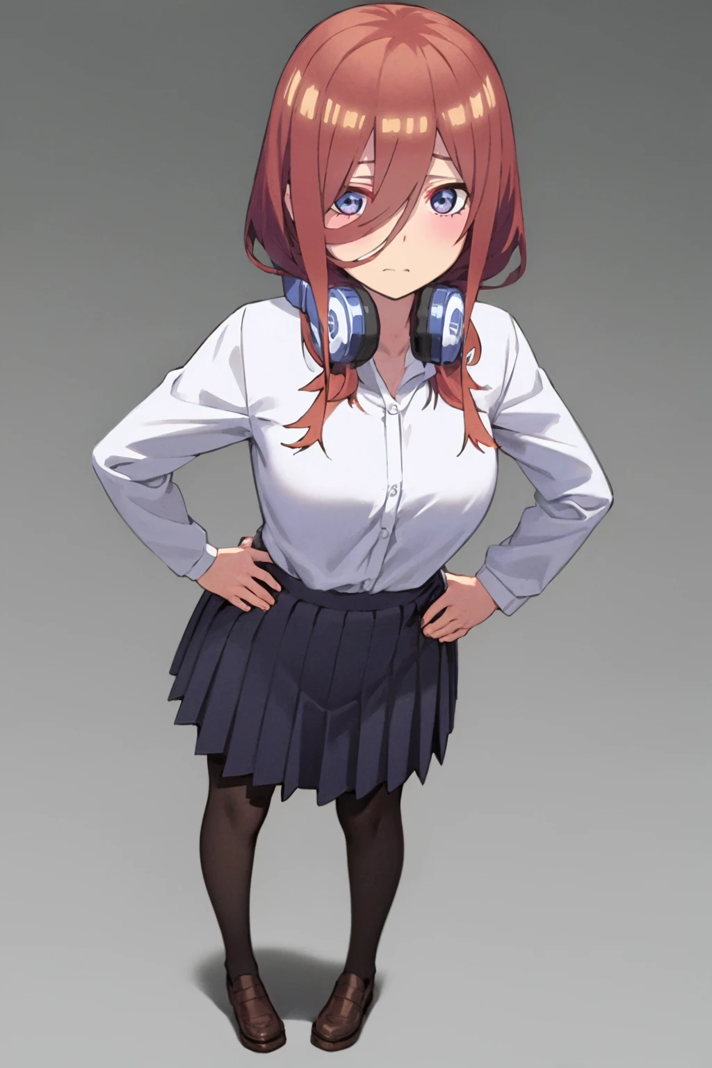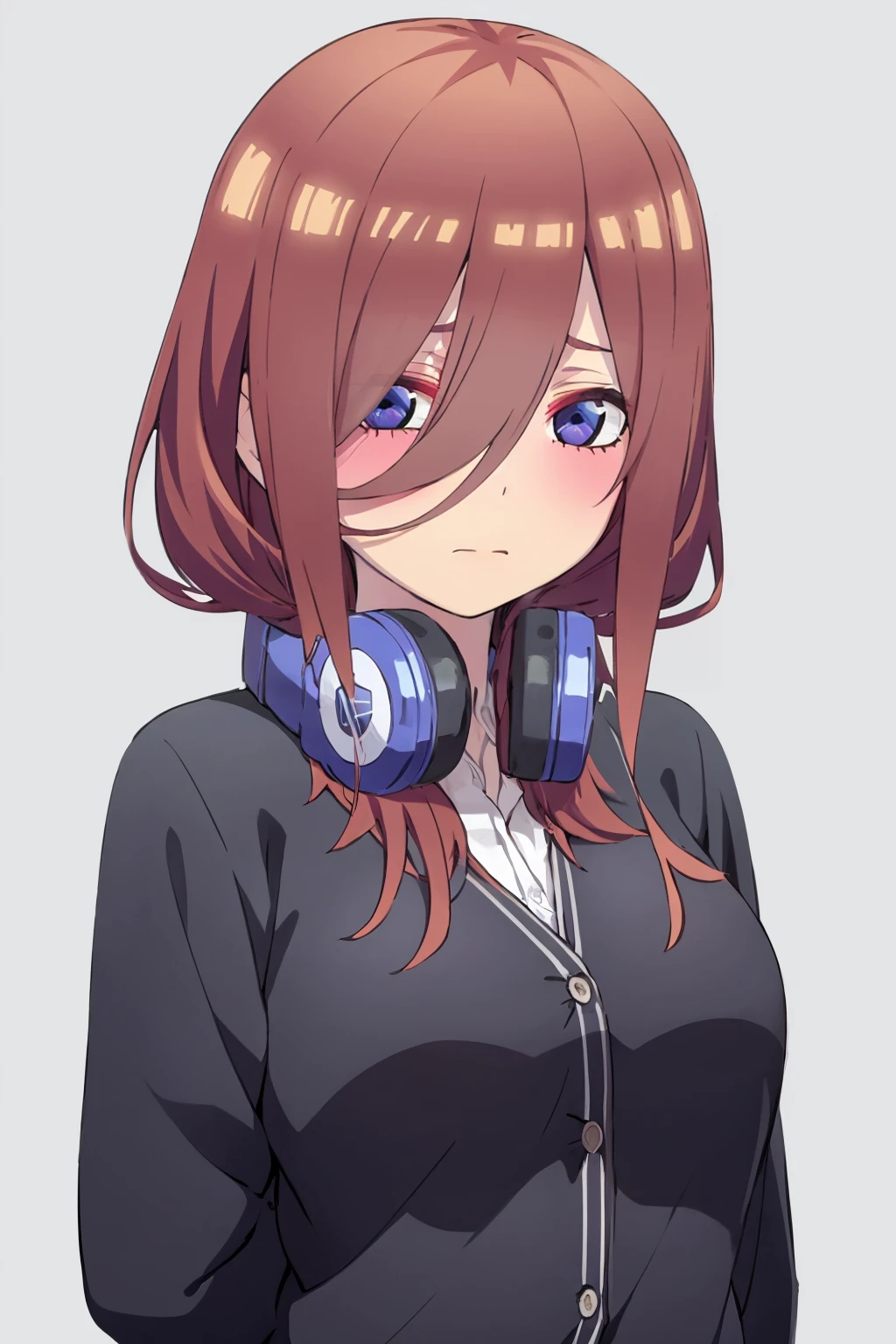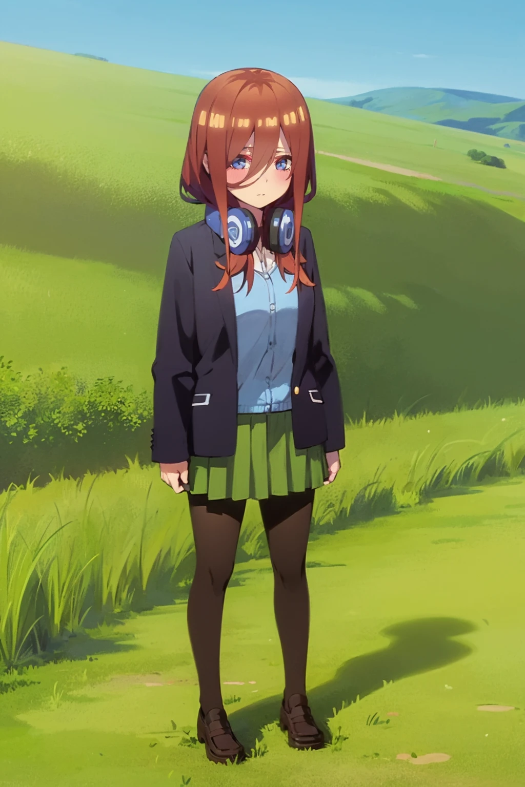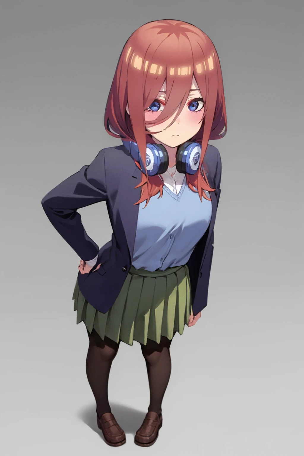 Basic outfit prompts : headphones around neck, blue cardigan, long sleeves, loafers, collared shirt, school uniform