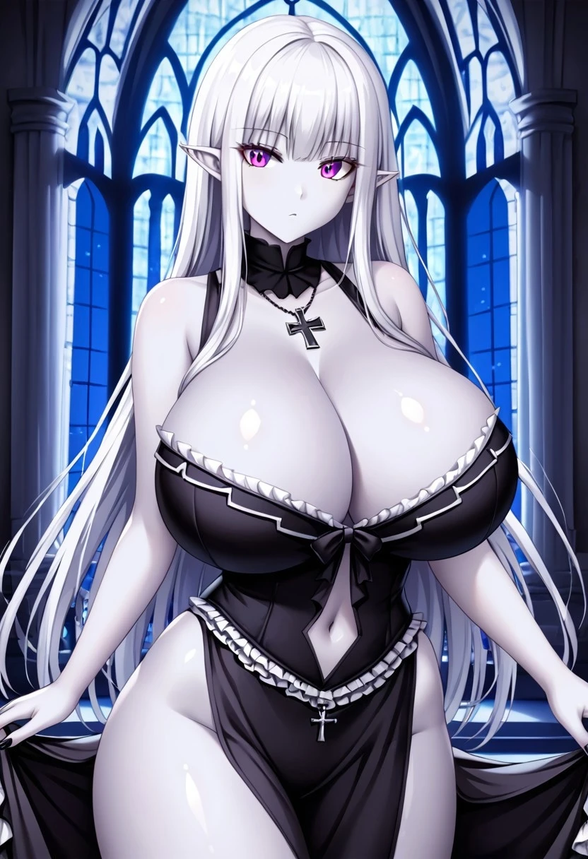 Vampire, Pale Skin, White Hair, White Dress, Gothic Style, Cleavage