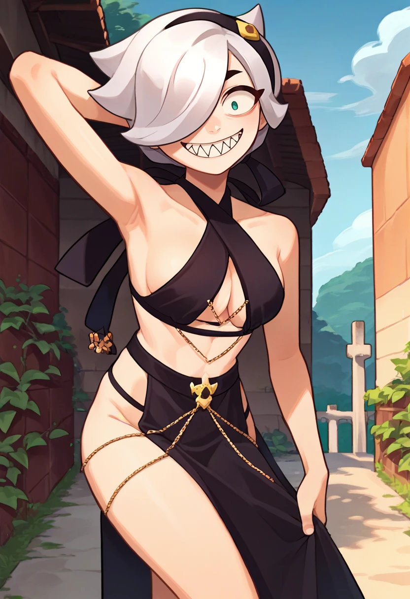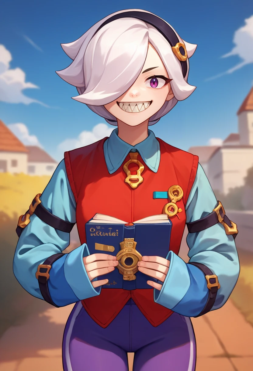 colettedef, sharp teeth, hair over one eye, black hairband, blue shirt, long sleeves, sleeves past fingers, red vest, purple pants