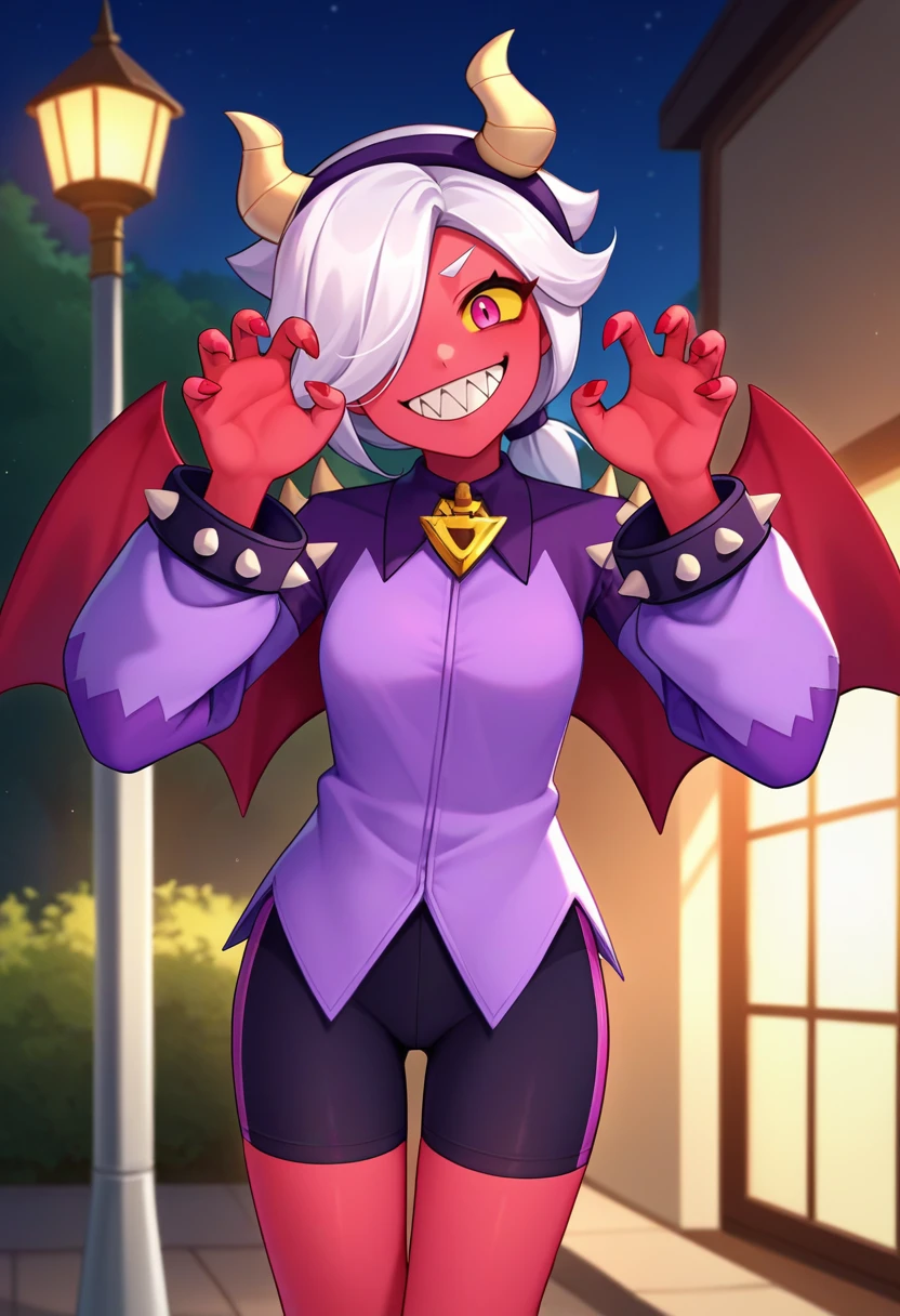 colettetrixie, red skin, sharp teeth, hair over one eye, hairband, demon horns, pink eyes, yellow sclera, spikes, purple shirt, long sleeves, sleeves past fingers, purple shorts, bike shorts, demon wings
