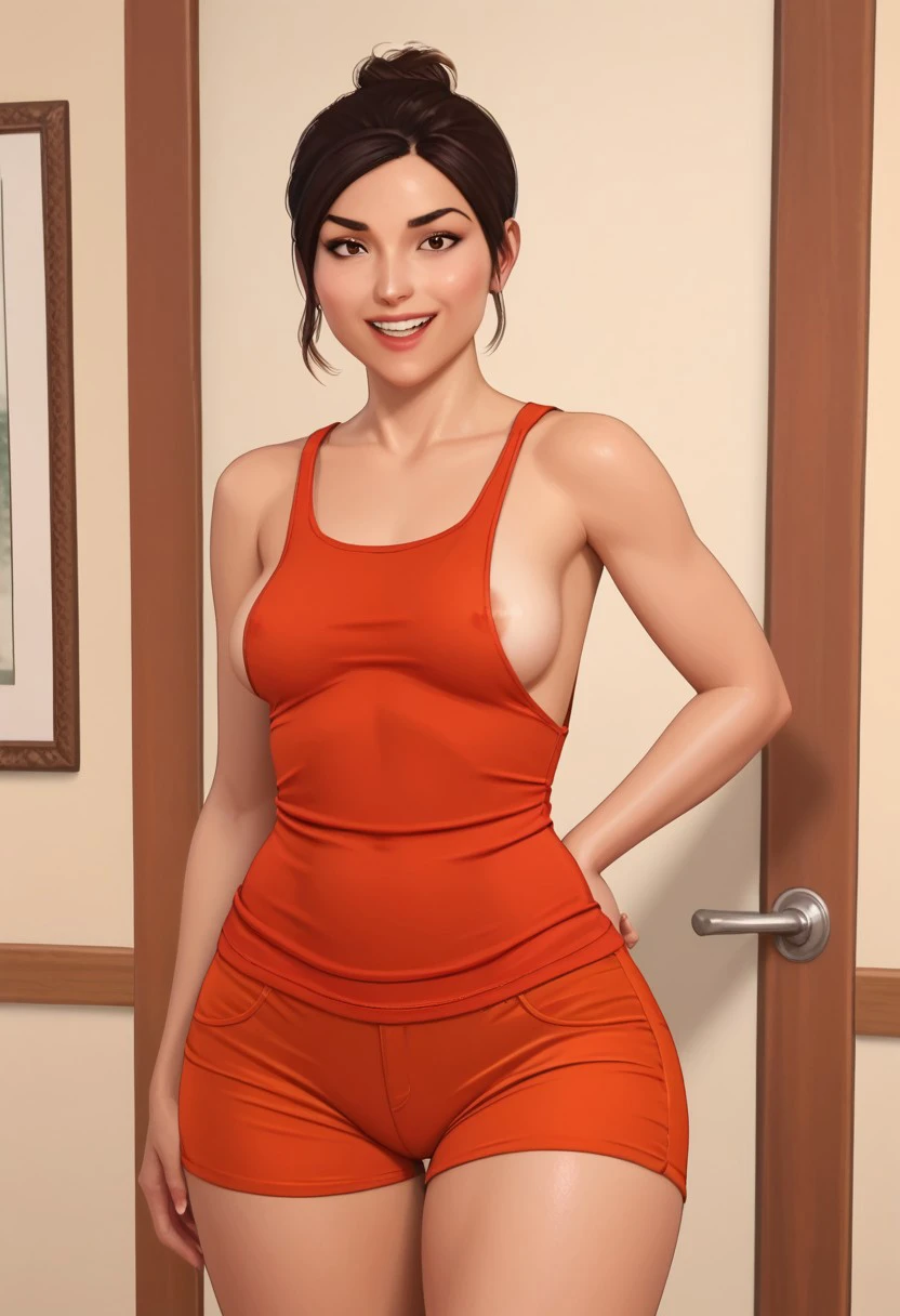 Mo_FA, 1girl, brown hair, swept bangs, hair bun, single bun, brown eyes, medium breasts, orange tank top, sideboob, areola slip, orange shorts