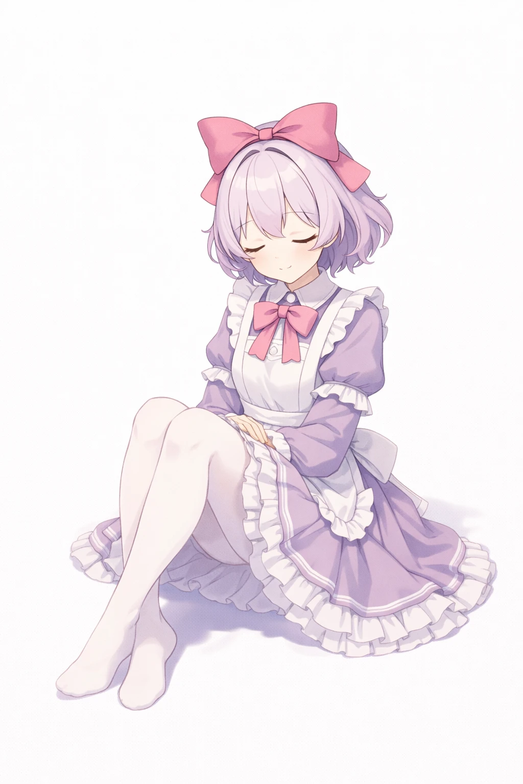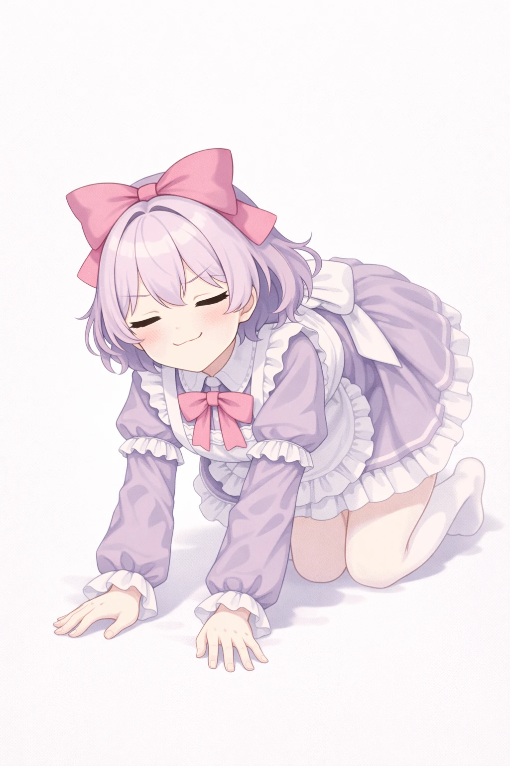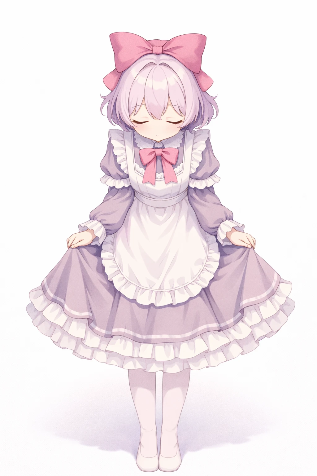 Eyes Closed,Pale purple short bob,,big pink ribbon on head,Pale Purple Maid Outfit,white ruffle apron,ribbons on the chest,long sleeve,Ruffle Skirt,,wears pale purple knee-high socks and lace-up boots,nsfw,( tweak:1.5),(:1.2),( :1.2),( :1.5),(Black :1.2),(spread :1.2), trail,Traces of ,Excitement,Show me and ,pale purple pubic hair,Light Purple Laced Bra,slide down pale purple panties,pale purple garter belt