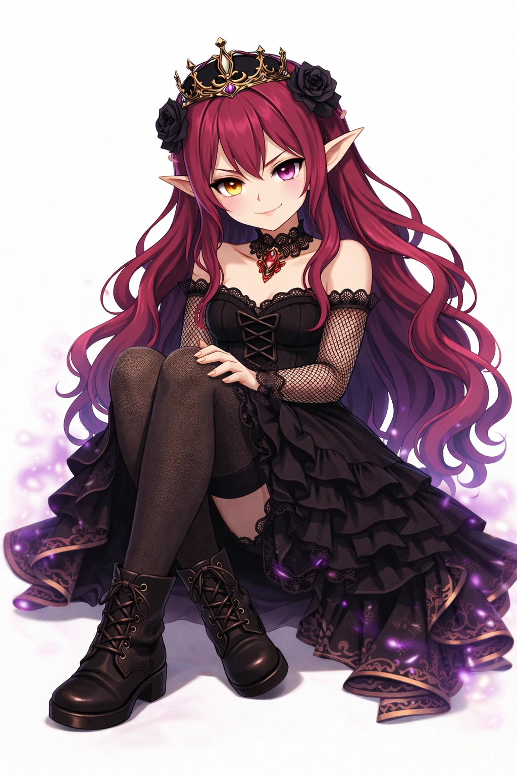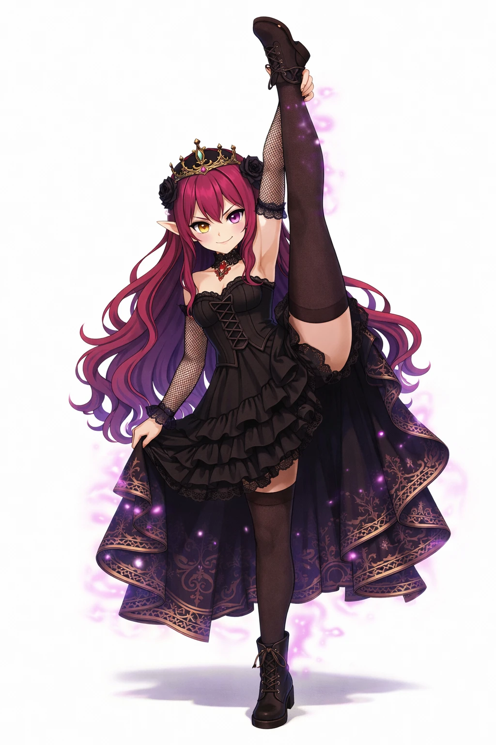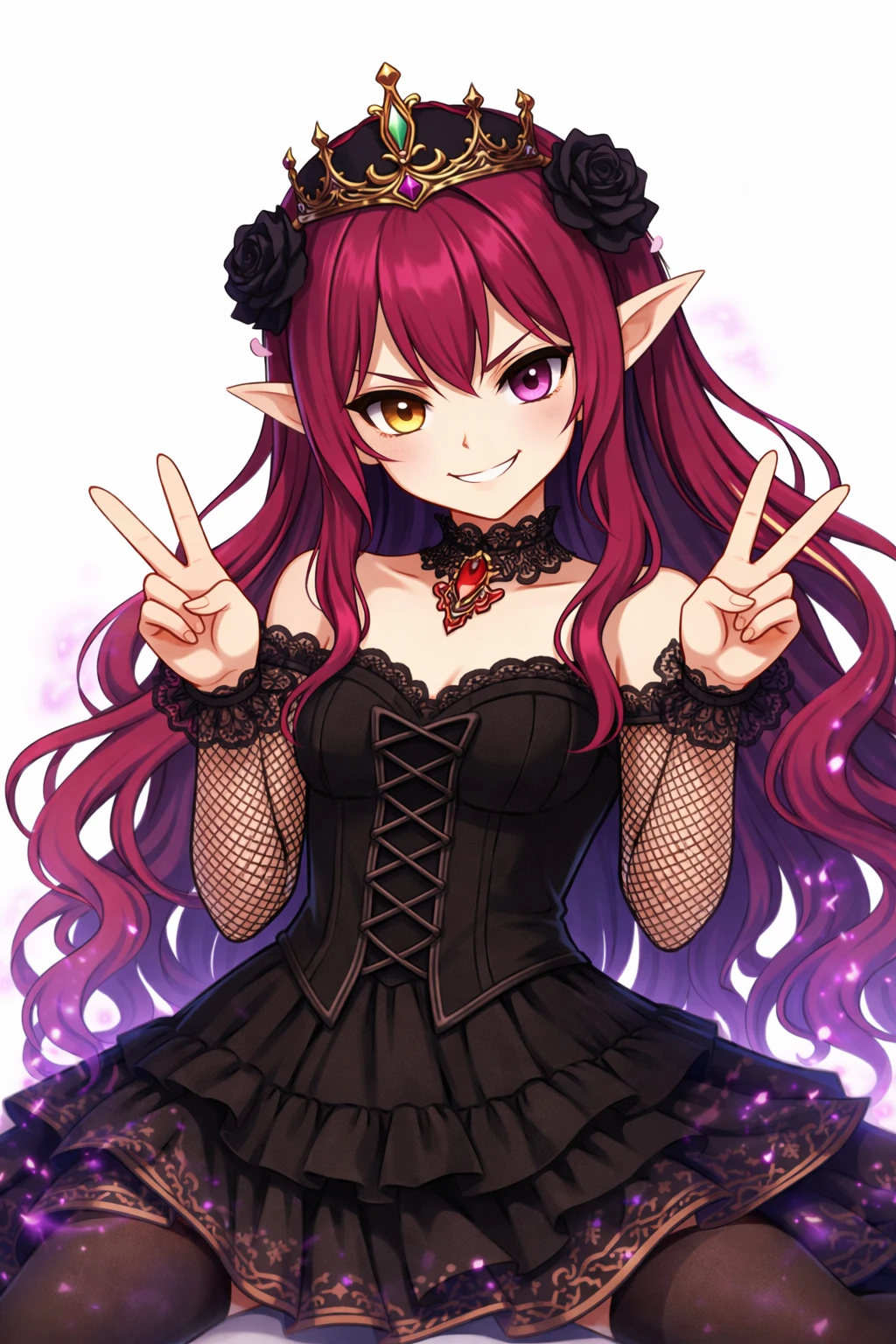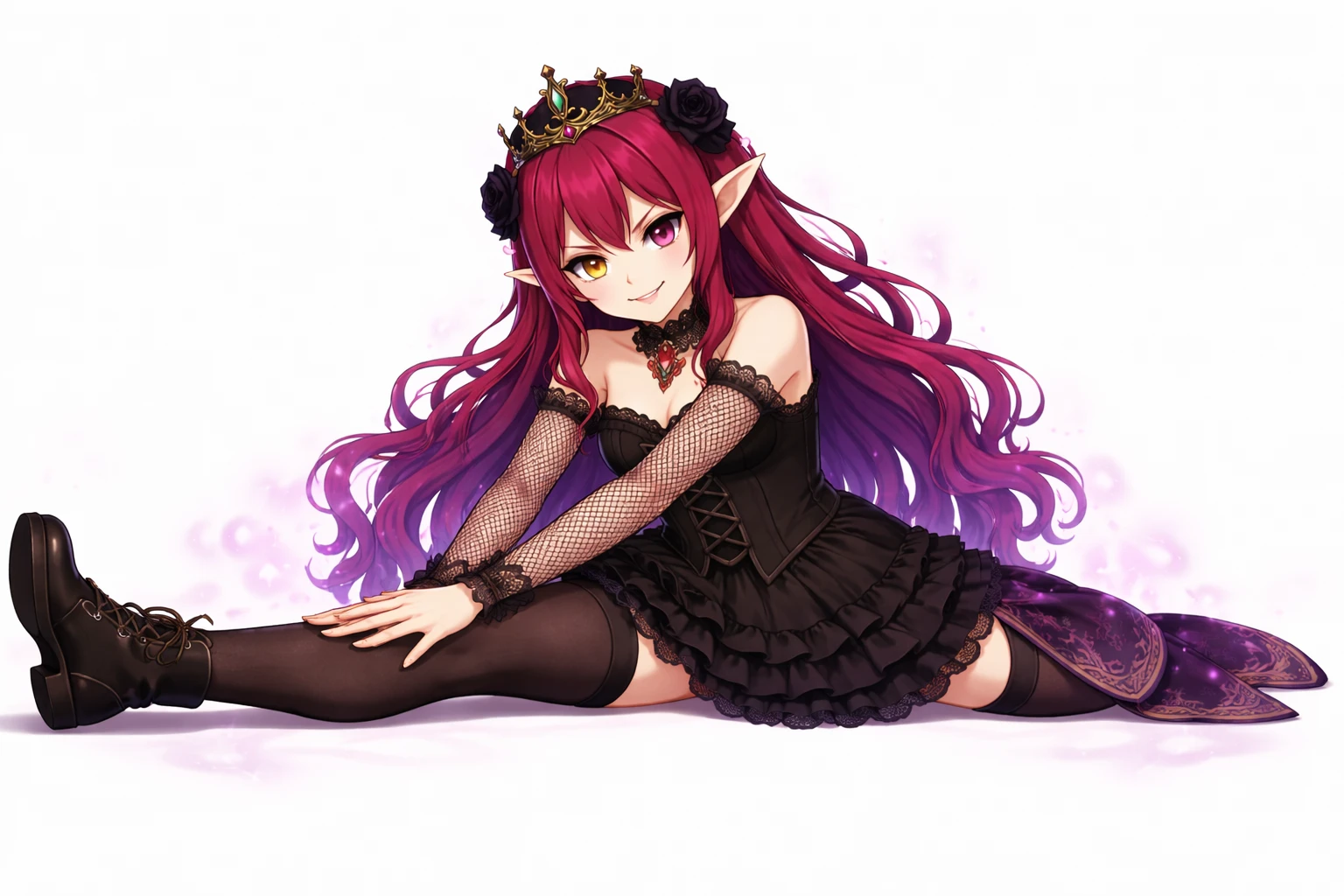 long wavy fuchsia hair,Purple with gradation tips,Pointy elven ears,odd-eye,Right eye is gold,Left eye is purple,sharp gaze,Black Gothic Dress,corset-style design,Lace Embellished ,Ruffle Skirt,see-through netted sleeves,black choker,Jewelry Accessory, black crown,Black Rose Hair Ornament,nsfw,( tweak:1.5),(:1.2),( :1.2),( :1.5),(Black :1.2),(spread :1.2), trail,Traces of ,Excitement,Show me and ,Purple Pubic Hair ,bra with black lace,slide down black panties,black garter belt,