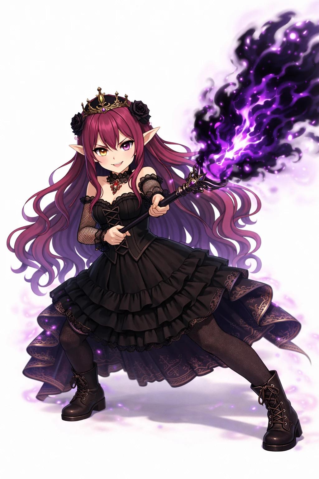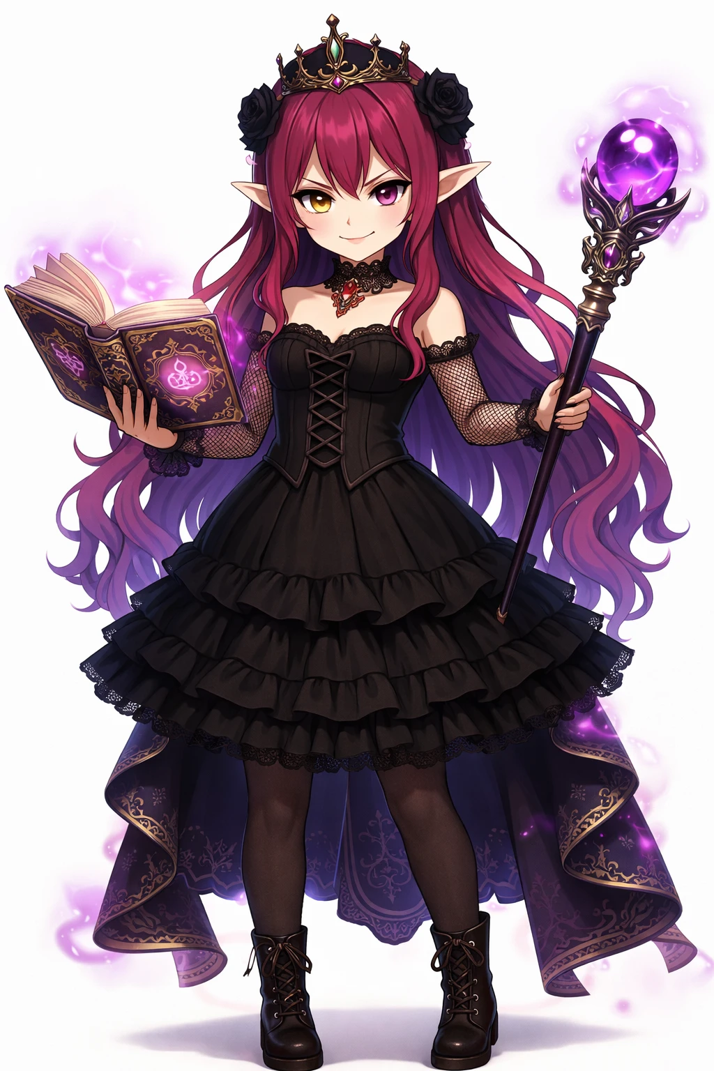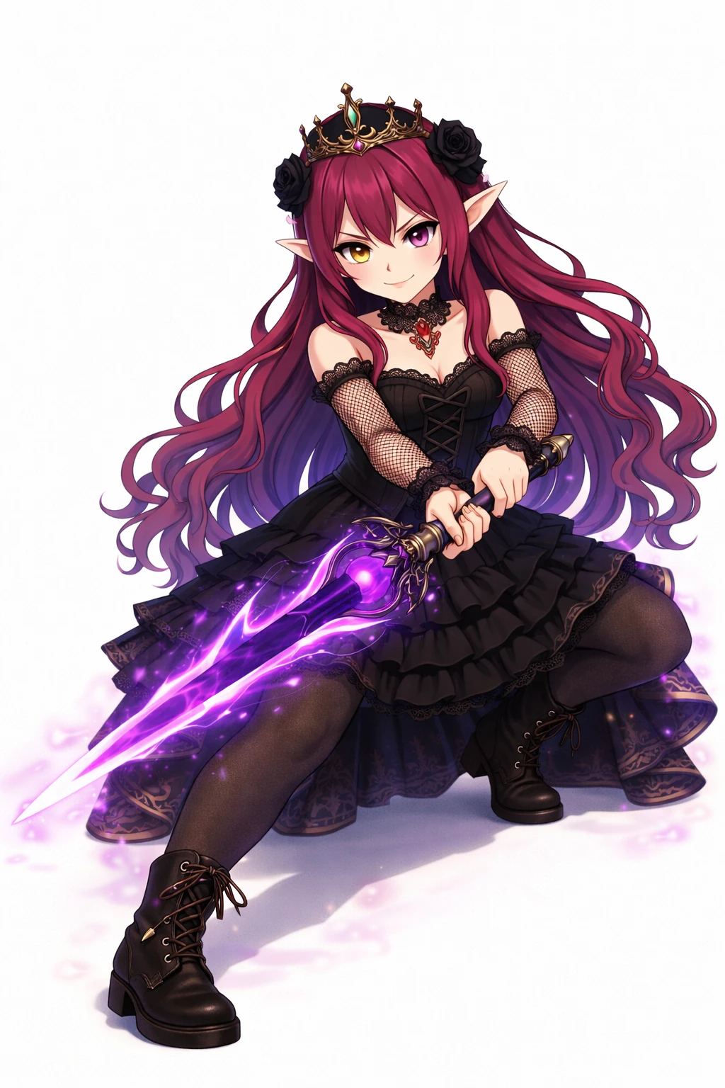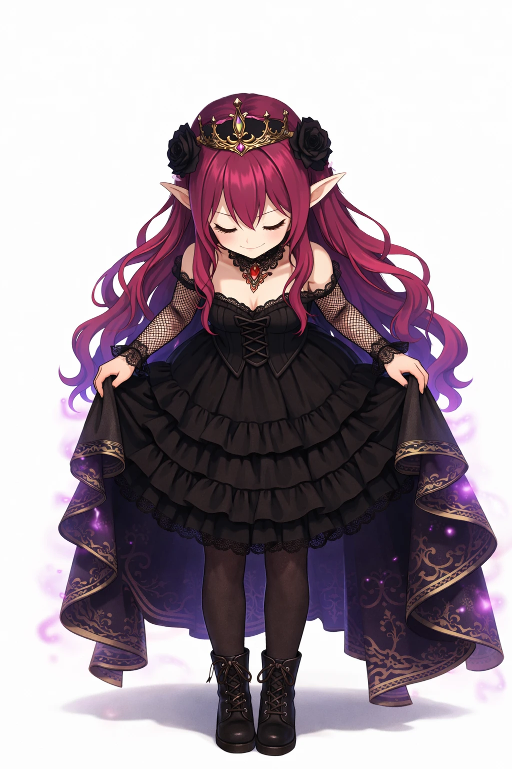 long wavy fuchsia hair,Purple with gradation tips,Pointy elven ears,odd-eye,Right eye is gold,Left eye is purple,sharp gaze,Black Gothic Dress,corset-style design,Lace Embellished ,Ruffle Skirt,see-through netted sleeves,black choker,Jewelry Accessory, black crown,Black Rose Hair Ornament,nsfw,( tweak:1.5),(:1.2),( :1.2),( :1.5),(Black :1.2),(spread :1.2), trail,Traces of ,Excitement,Show me and ,Purple Pubic Hair ,bra with black lace,slide down black panties,black garter belt,