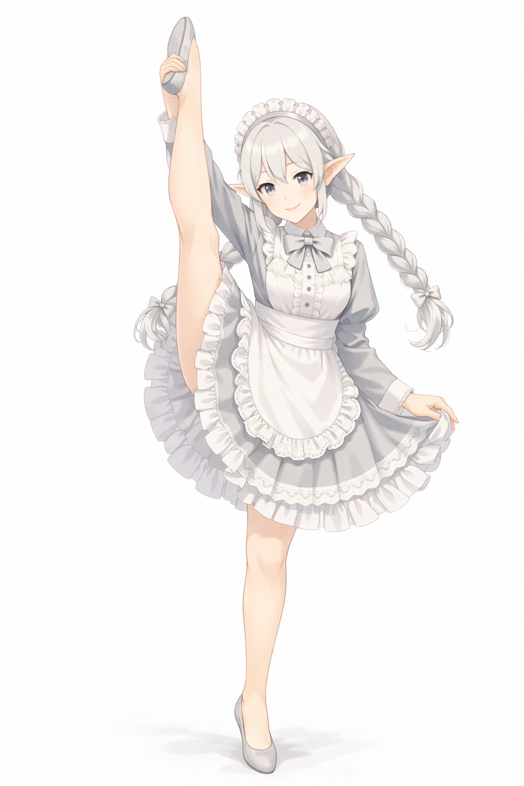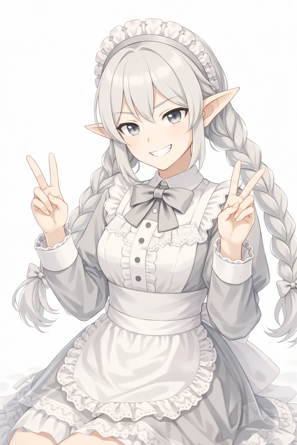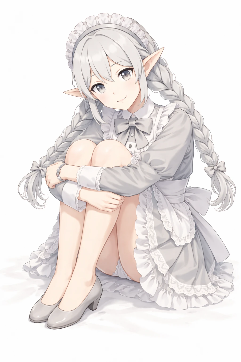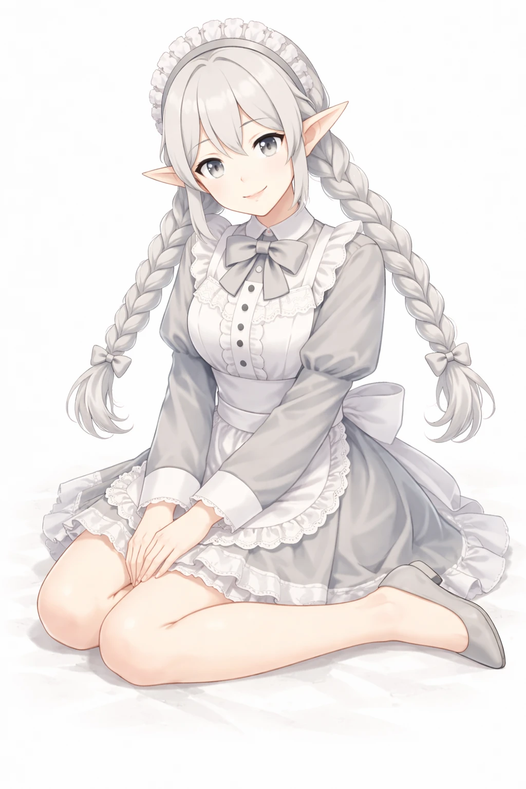 silver hair,twin braids long hair,Well-knit,light gray eyes,elf ears,Silver Maid Clothes,white ruffle apron,Lace Embellished ,ribbons on the chest,long sleeve,elegant and clean design,headdress(frill headband),nsfw,( tweak:1.5),(:1.2),( :1.2),( :1.5),(Black :1.2),(spread :1.2), trail,Traces of ,Excitement,Show me and ,silver pubic hair,Bra with Silver Lace,Slide Down Silver Panties,silver garter belt,