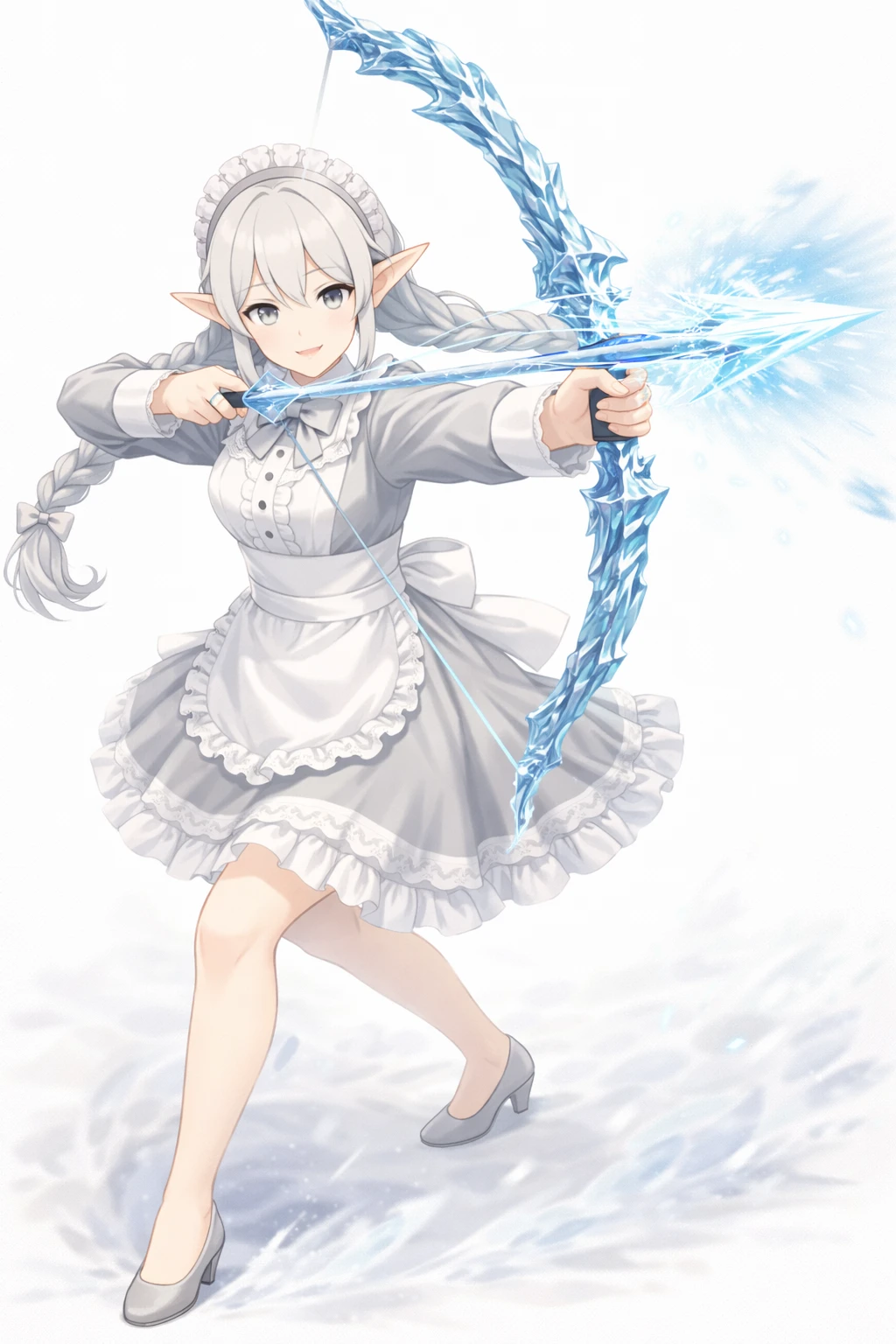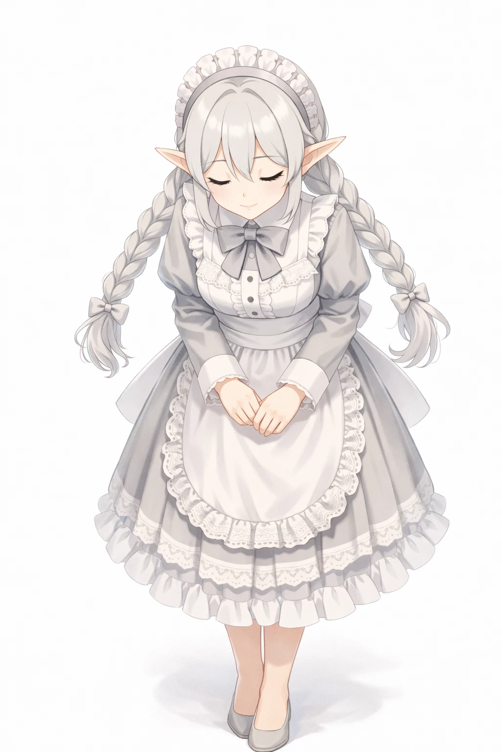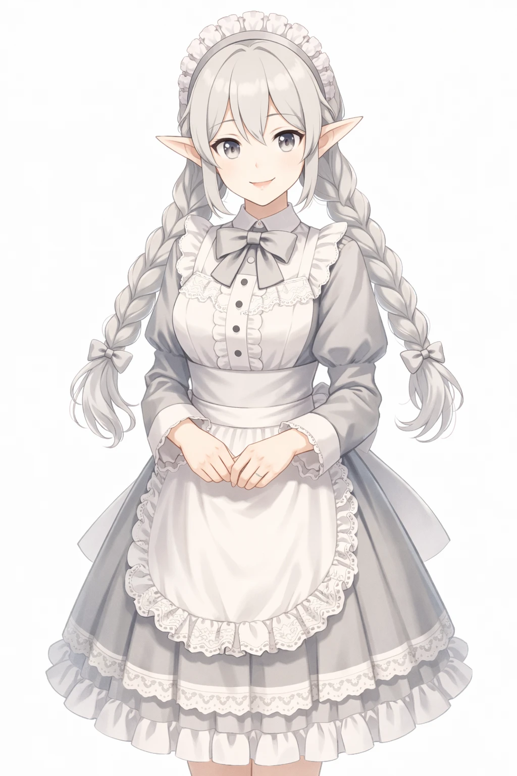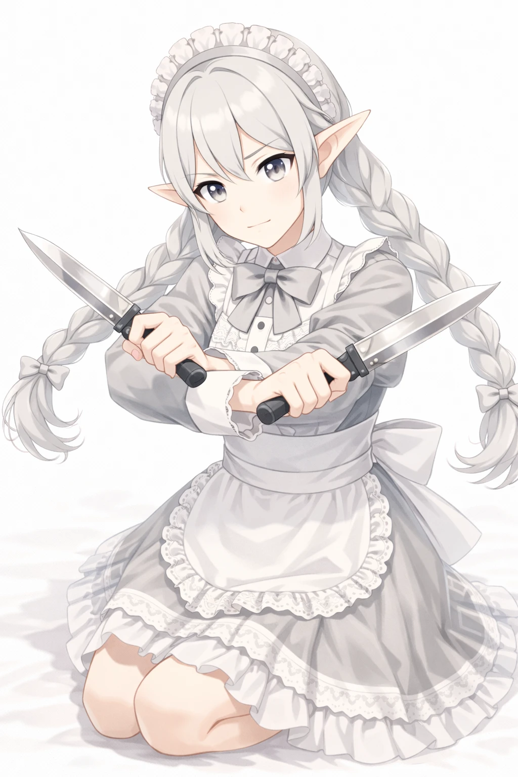 silver hair,twin braids long hair,Well-knit,light gray eyes,elf ears,Silver Maid Clothes,white ruffle apron,Lace Embellished ,ribbons on the chest,long sleeve,elegant and clean design,headdress(frill headband),nsfw,( tweak:1.5),(:1.2),( :1.2),( :1.5),(Black :1.2),(spread :1.2), trail,Traces of ,Excitement,Show me and ,silver pubic hair,Bra with Silver Lace,Slide Down Silver Panties,silver garter belt,