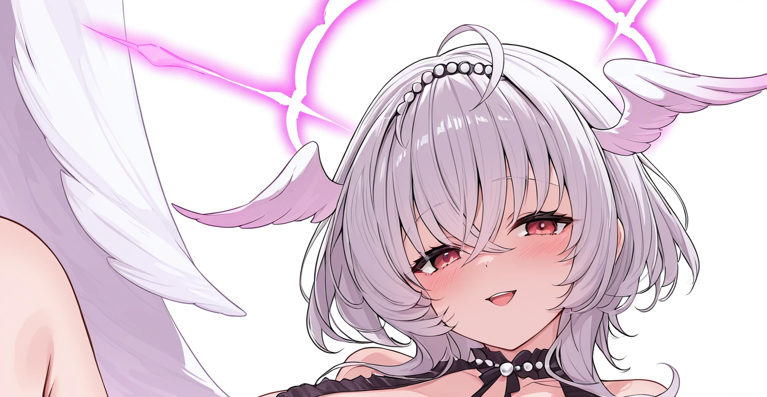 - 堕天使(dark angle):pearl_(fallen_angel_in_the_dark_castle)_(azur_lane), black frilled_cross-laced_underwear, black see-through crotch_curtain, halterneck, pearl_thong, white angel_wings, white head wings, 1girl, ahoge, grey_hair, red eyes, sidelocks, short_hair, large breasts, black single thigh strap, black pearl_armlet, black pearl_ankle_garter, pearl_hairband