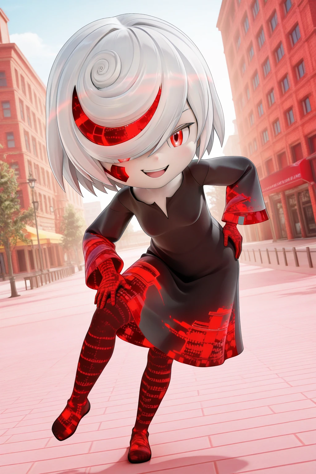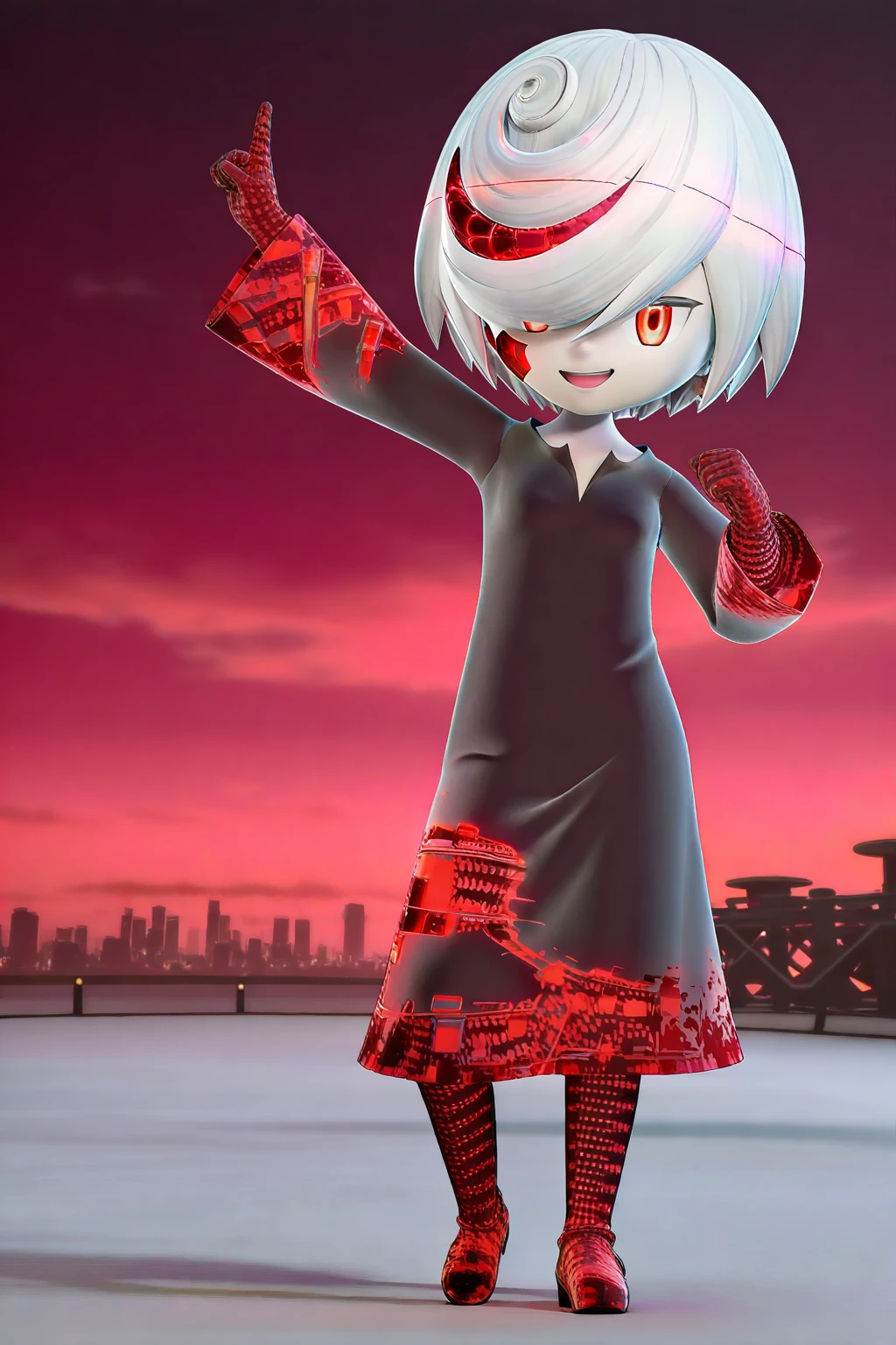 1girl, 3d, chibi, full body, solo, masterpiece, highly detailed, exquisite detail, high definition, best quality, ultra highres, sage (sonic), pale white skin, red eyes, short hair, hair over one eye, white hair, black oversized black dress, barefoot, long pantyhose, long gloves, red binary codes, red glitches, cute, smirked face