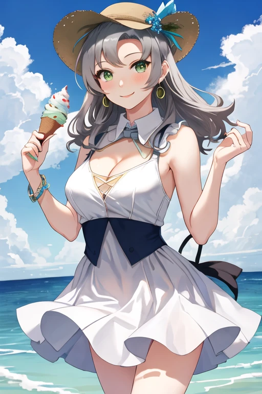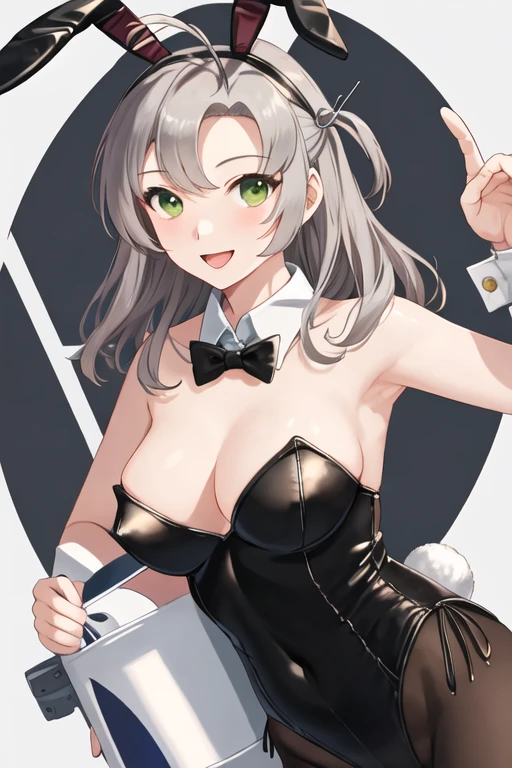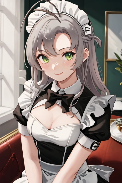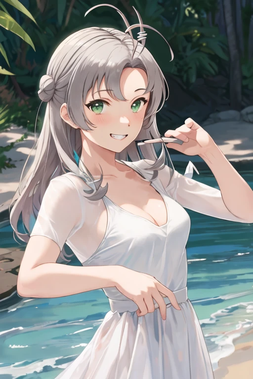 green_eyes, grey_hair, antenna_hair, long_hair, breasts, smile, hair_tie