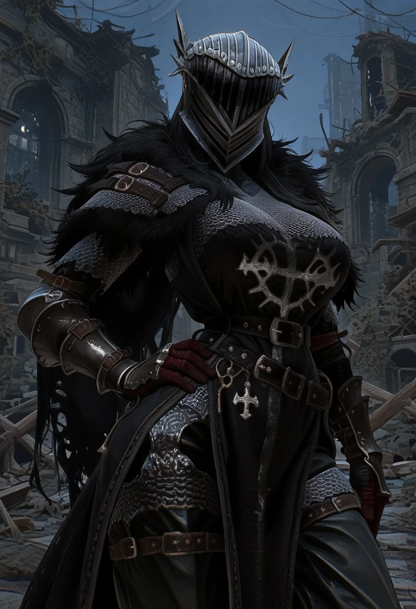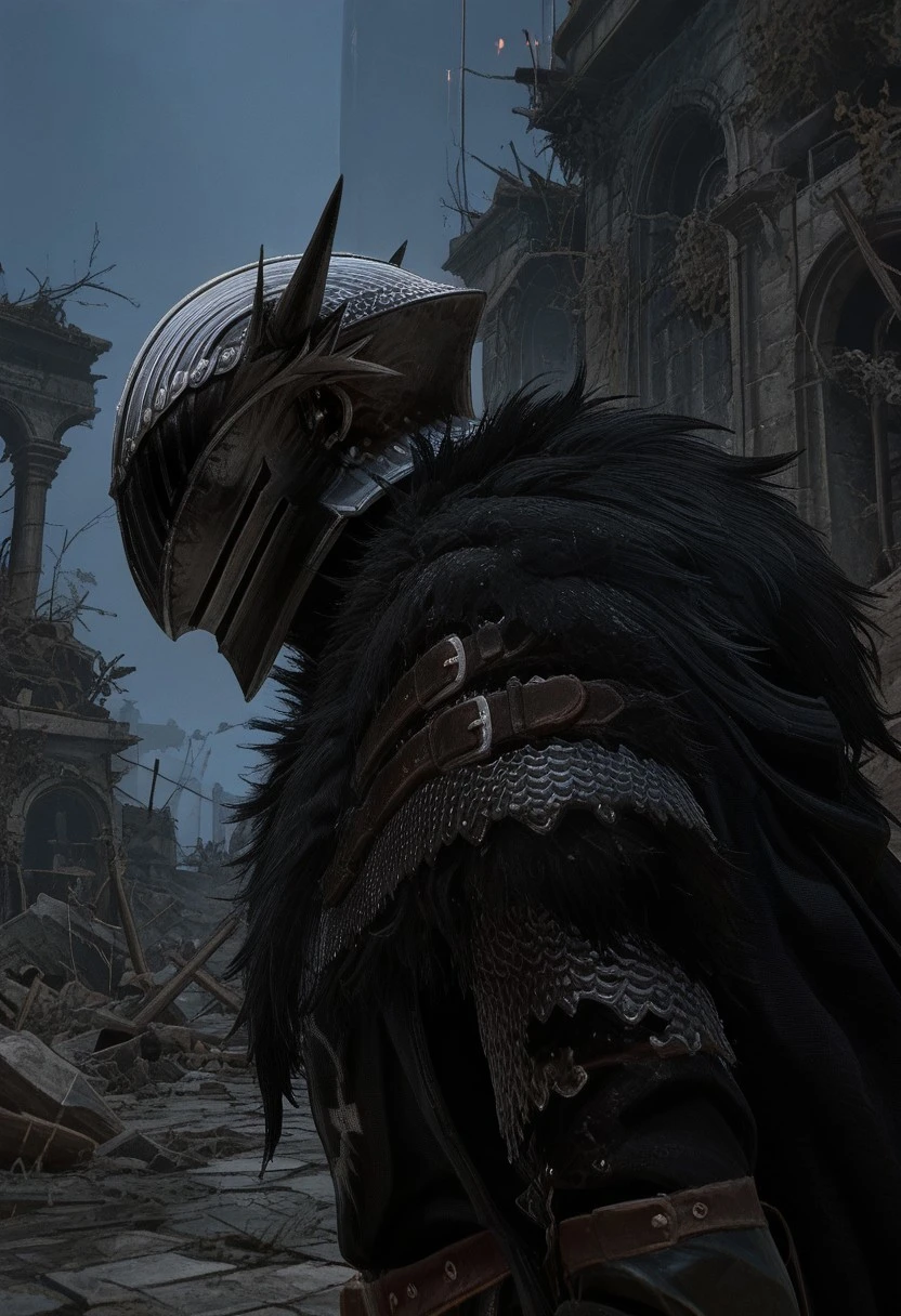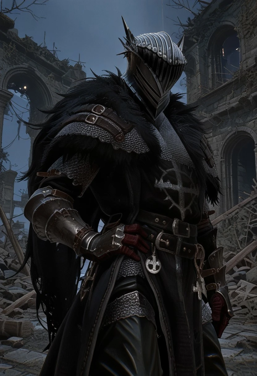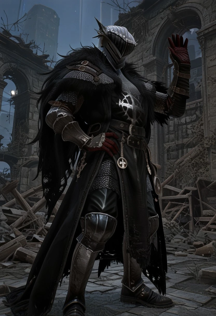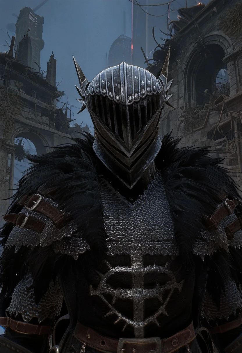 LOTF_vanguard, helmet, chainmail, fur trim, black tabbard, black cloak, gauntlets, black pants, boots