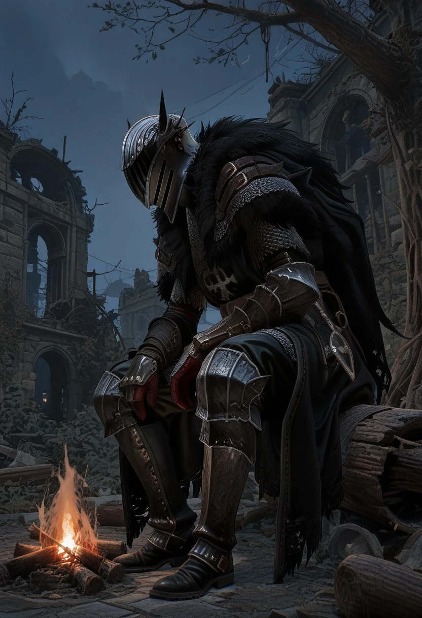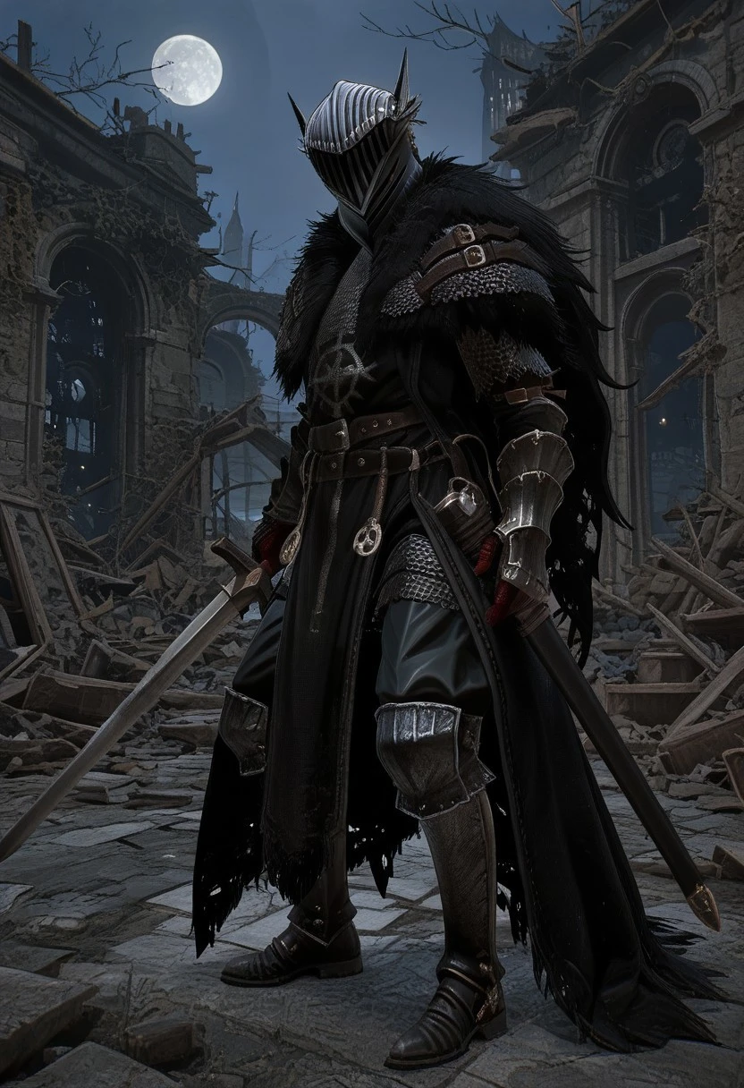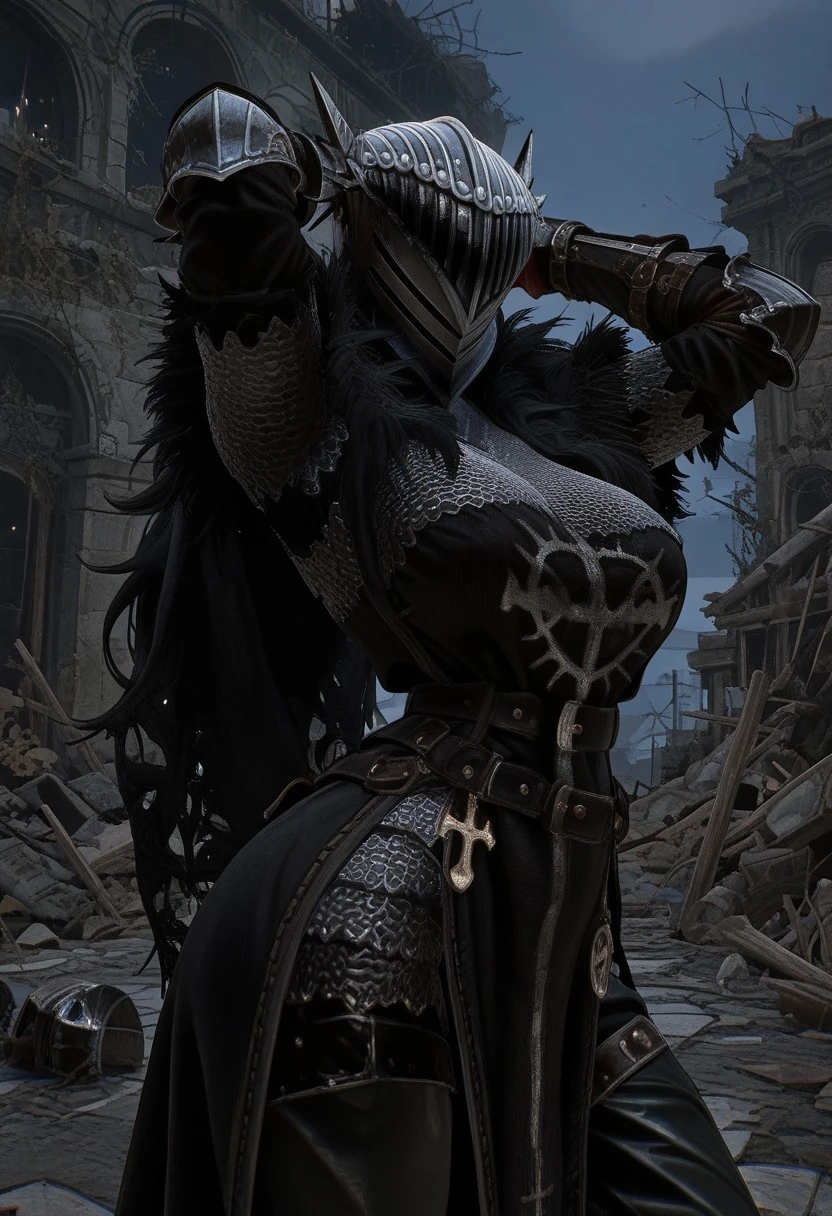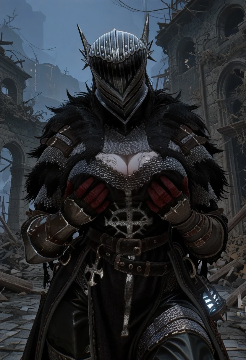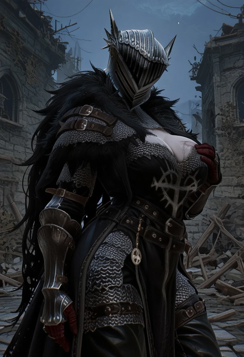 LOTF_vanguard, helmet, chainmail, fur trim, black tabbard, black cloak, gauntlets, black pants, boots