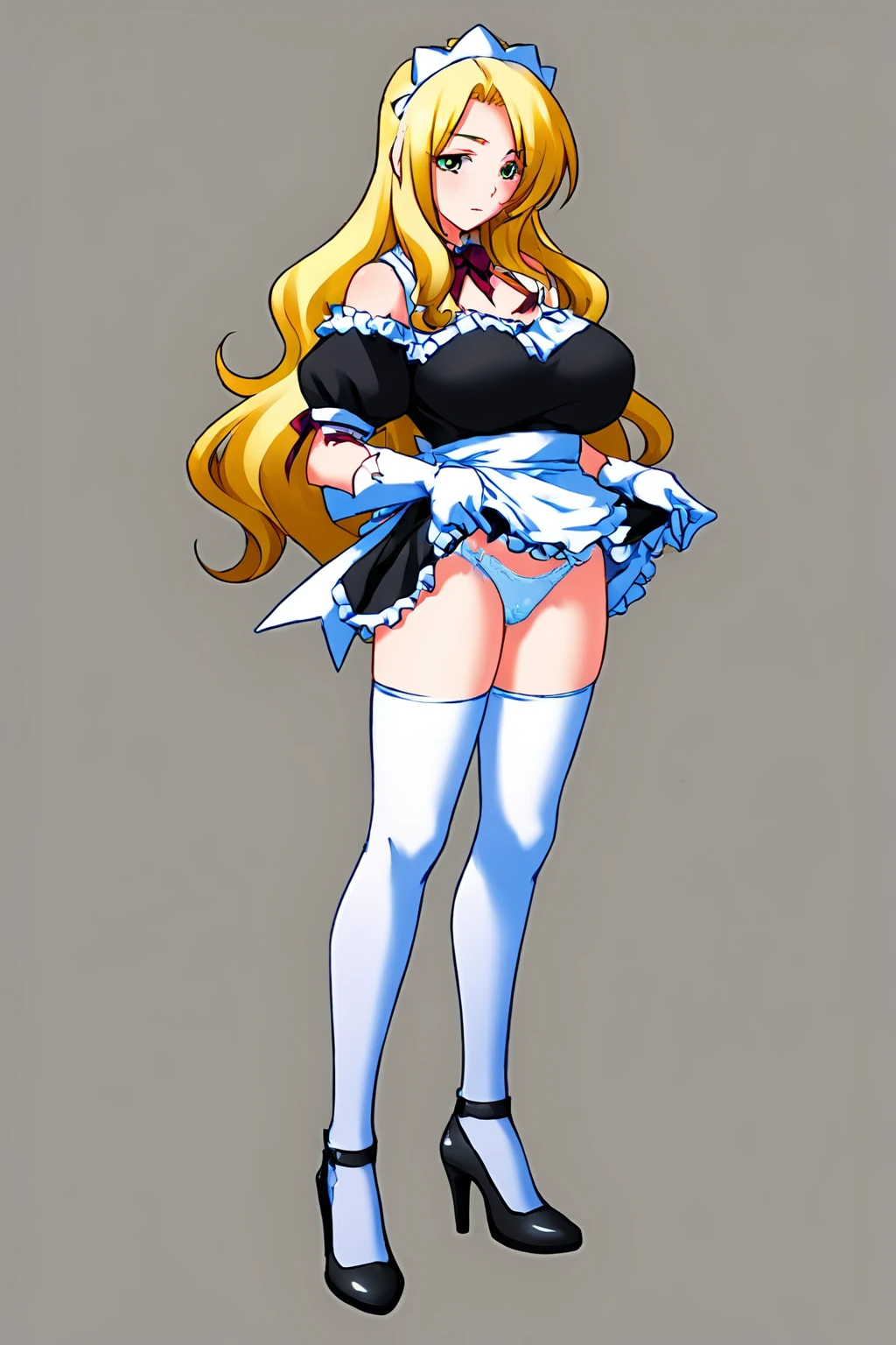 Maid: maid, maid headdress, gloves, bare shoulders, panties, shoes, apron, high heels, white thighhighs,