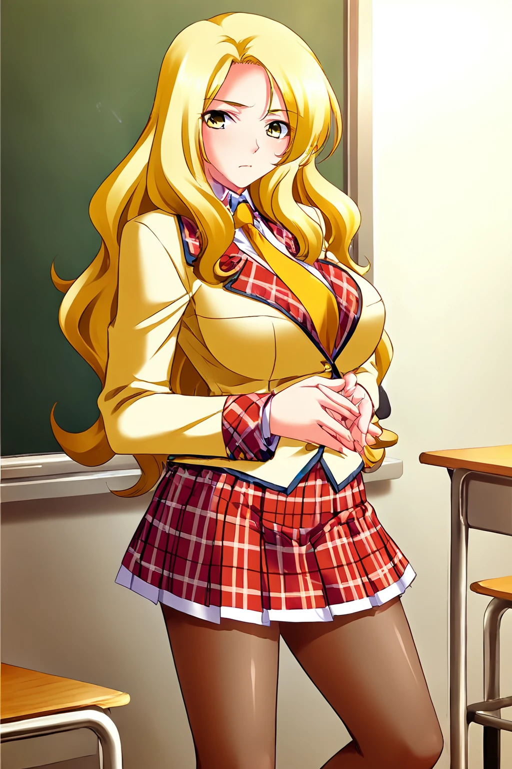 School uniform: school uniform, yellow jacket,pantyhose, necktie, blazer, brown pantyhose, plaid skirt,