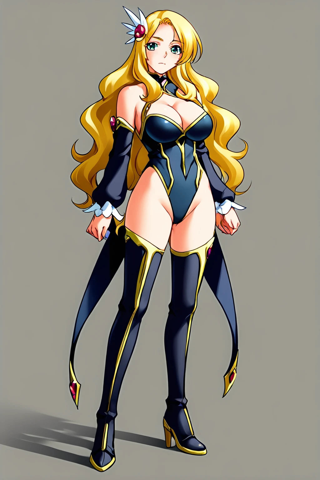 Cosplay: hair ornament, thighhighs, cleavage, boots, leotard, thigh boots