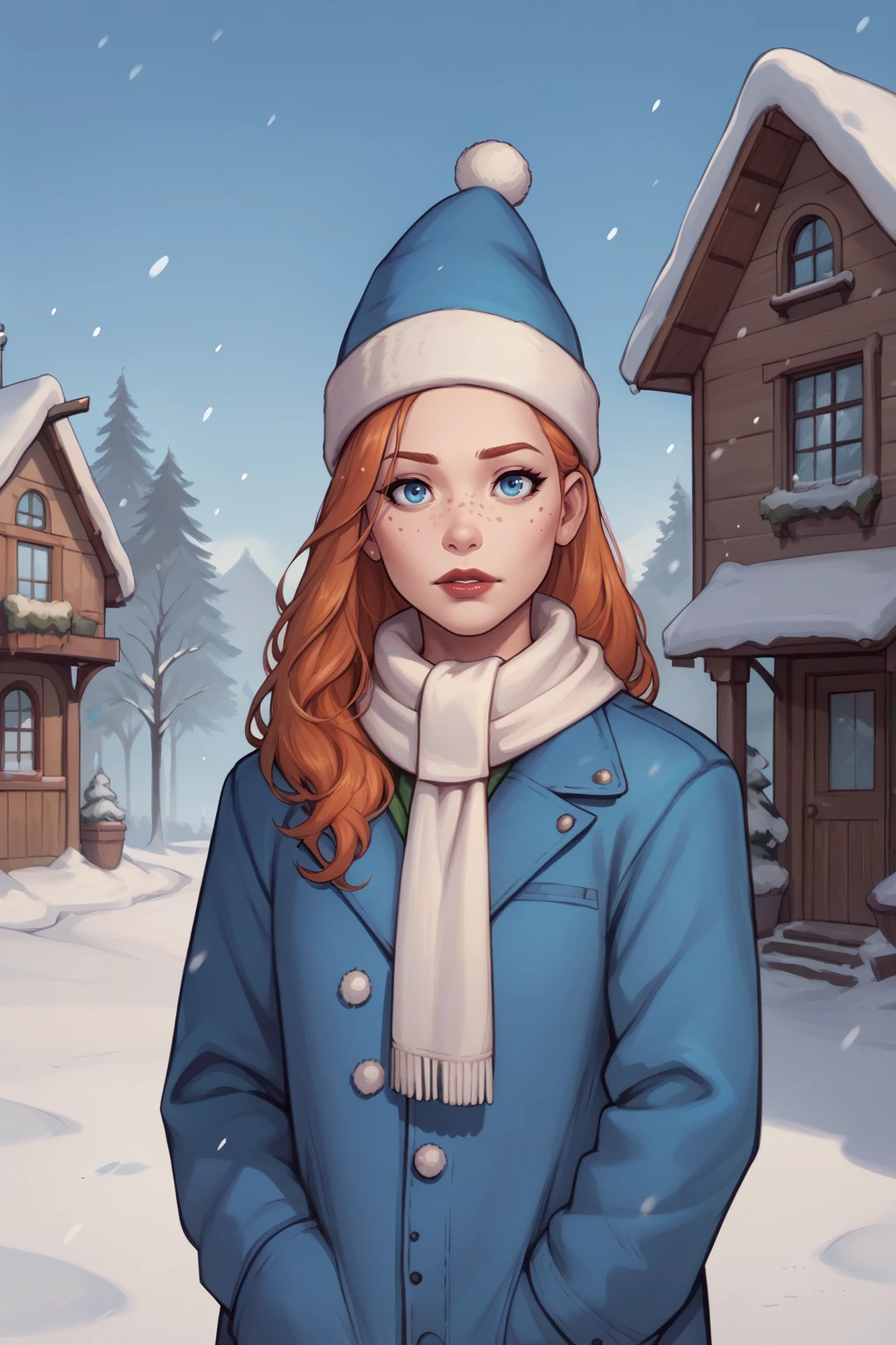For her outfit use: NSMeiPortia, long hair, blue eyes, freckles, lipstick, orange hair, witch hat, collared, blue pants, poncho, brown capelet