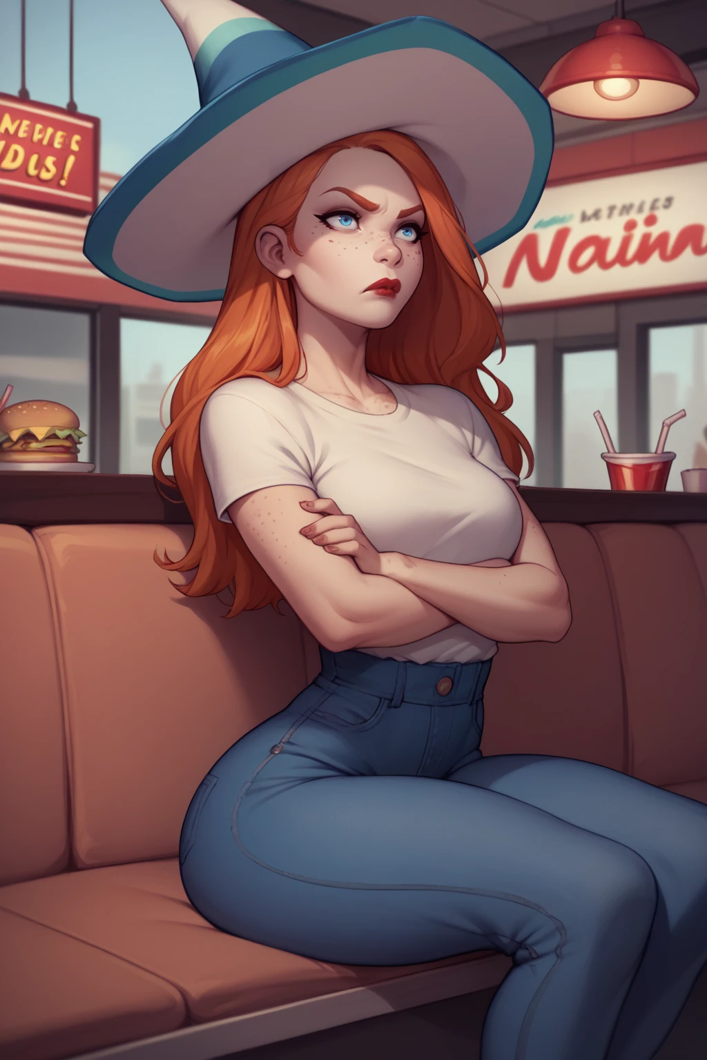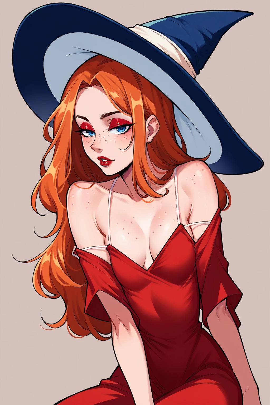 NSMeiPortia, long hair, blue eyes, freckles, lipstick, orange hair, witch hat, collared, blue pants, poncho, brown capelet