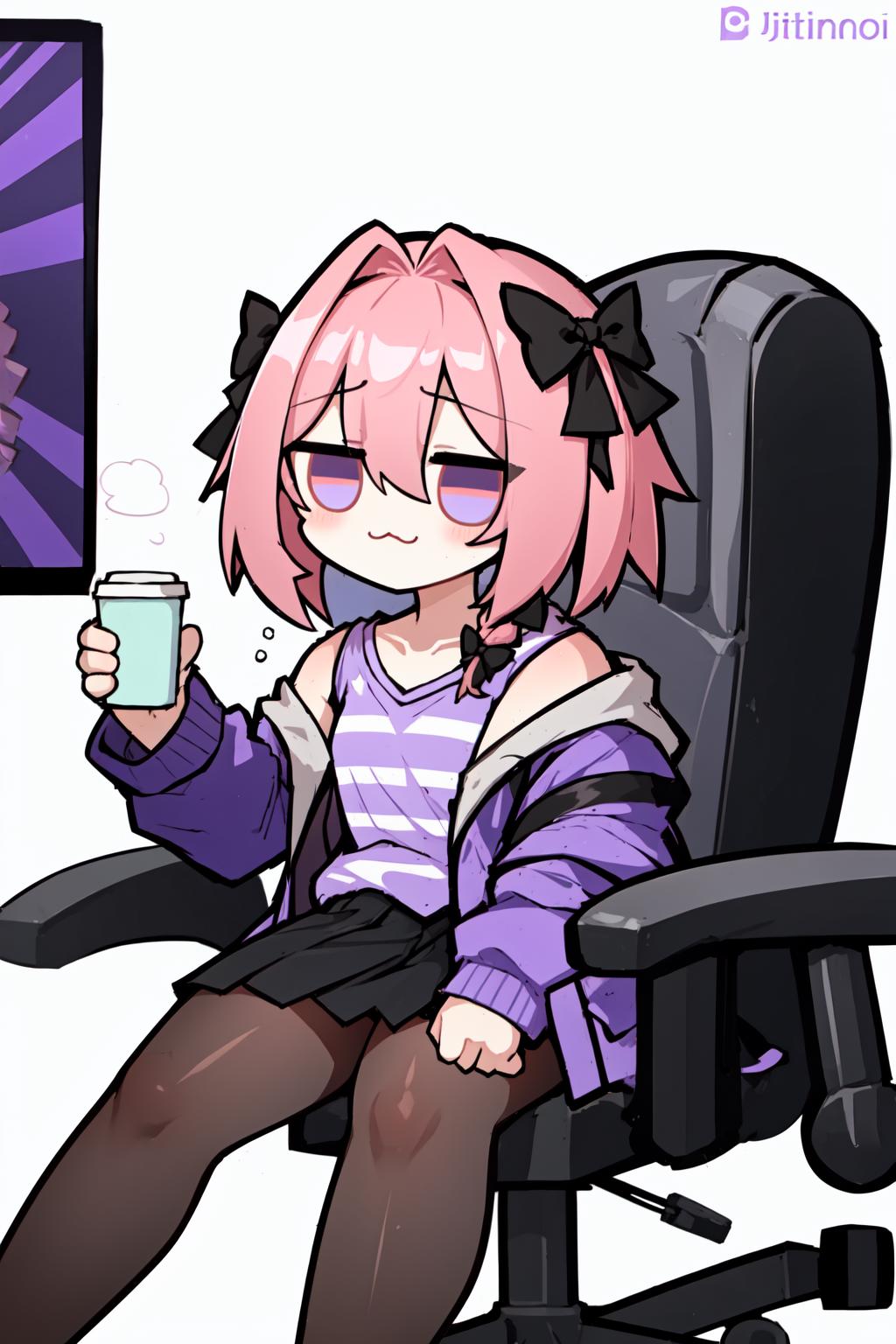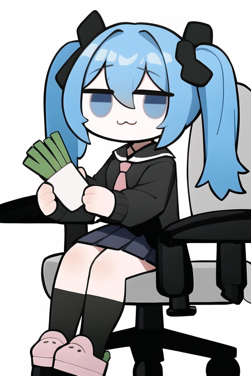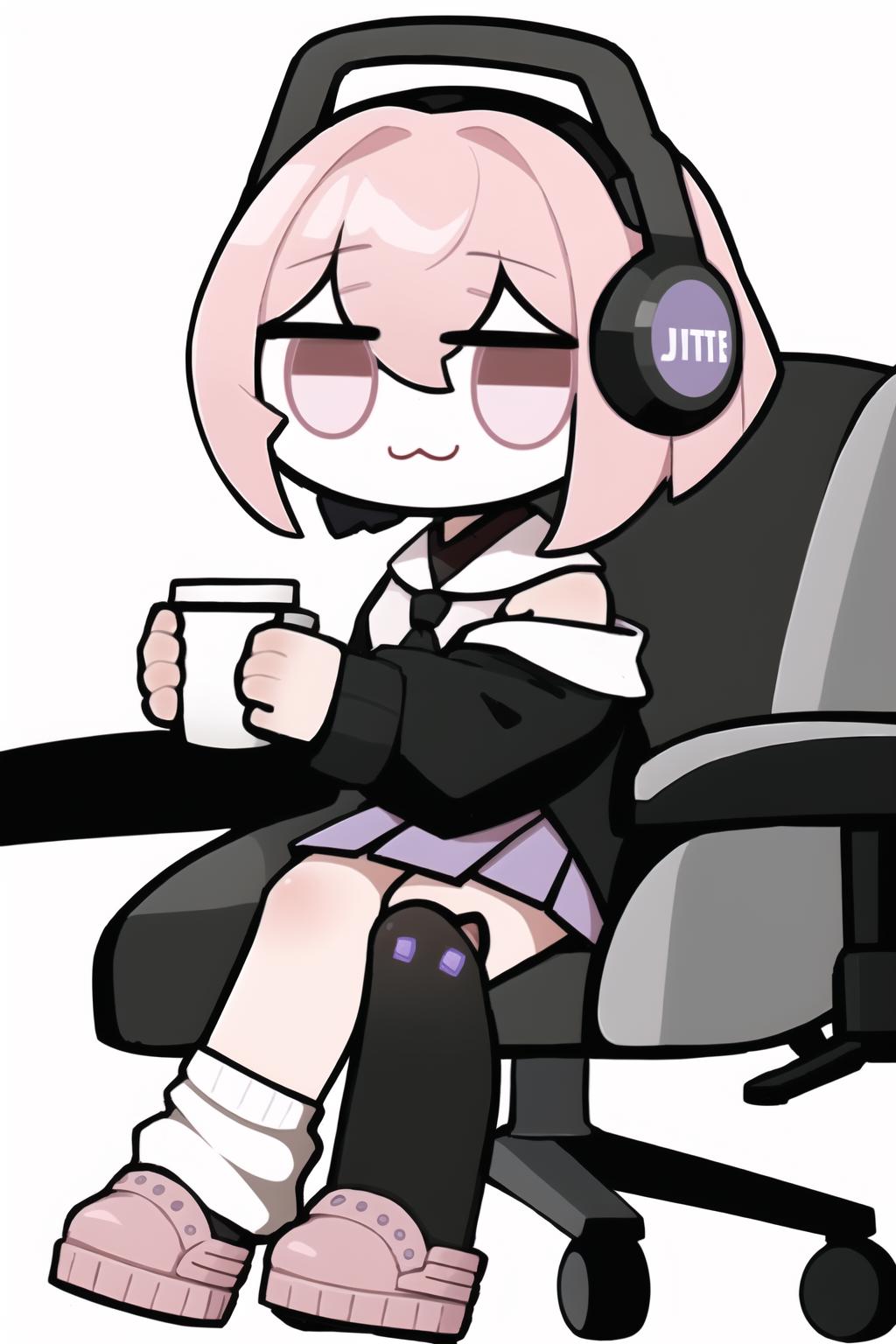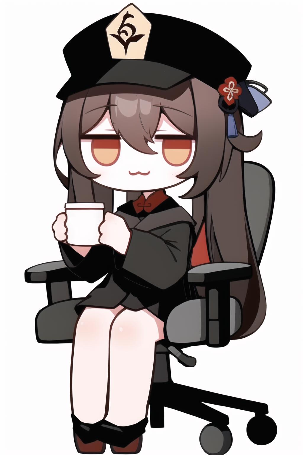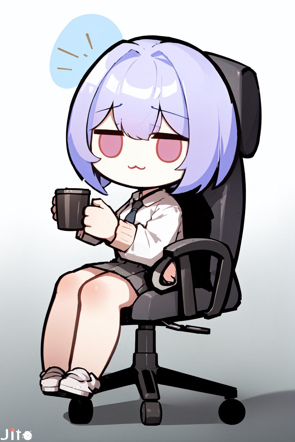chibi, office chair, sitting, full body, :3, jitome, holding cup,(也可以拿其他的物品 )