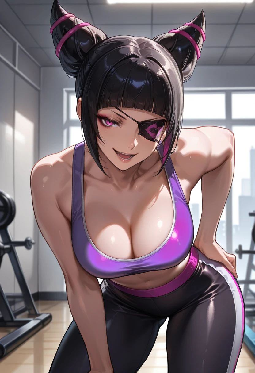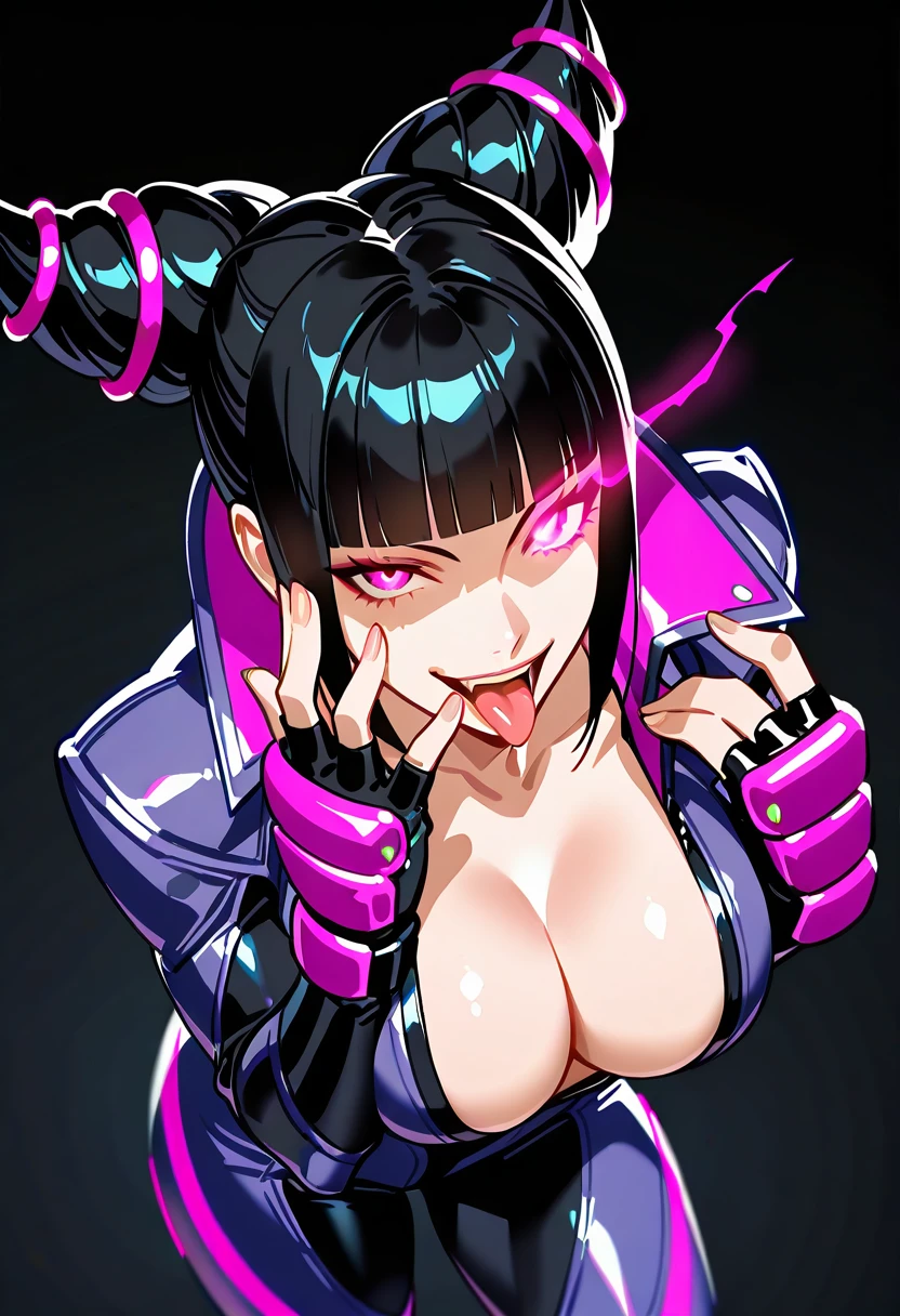 "BKRJHAN, hair horns, black hair, blunt bangs, eyepatch, purple collared bodysuit, unzippped, fingerless gloves"