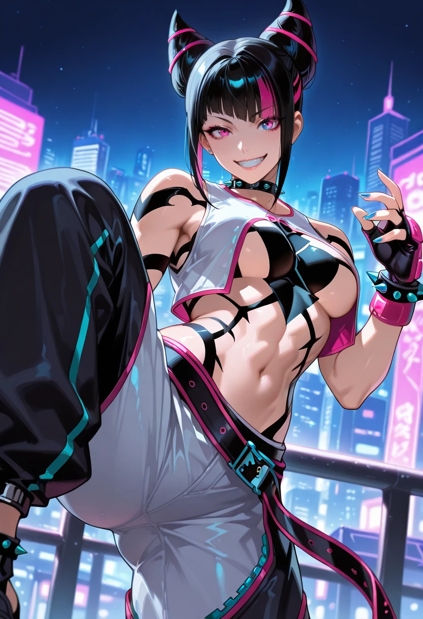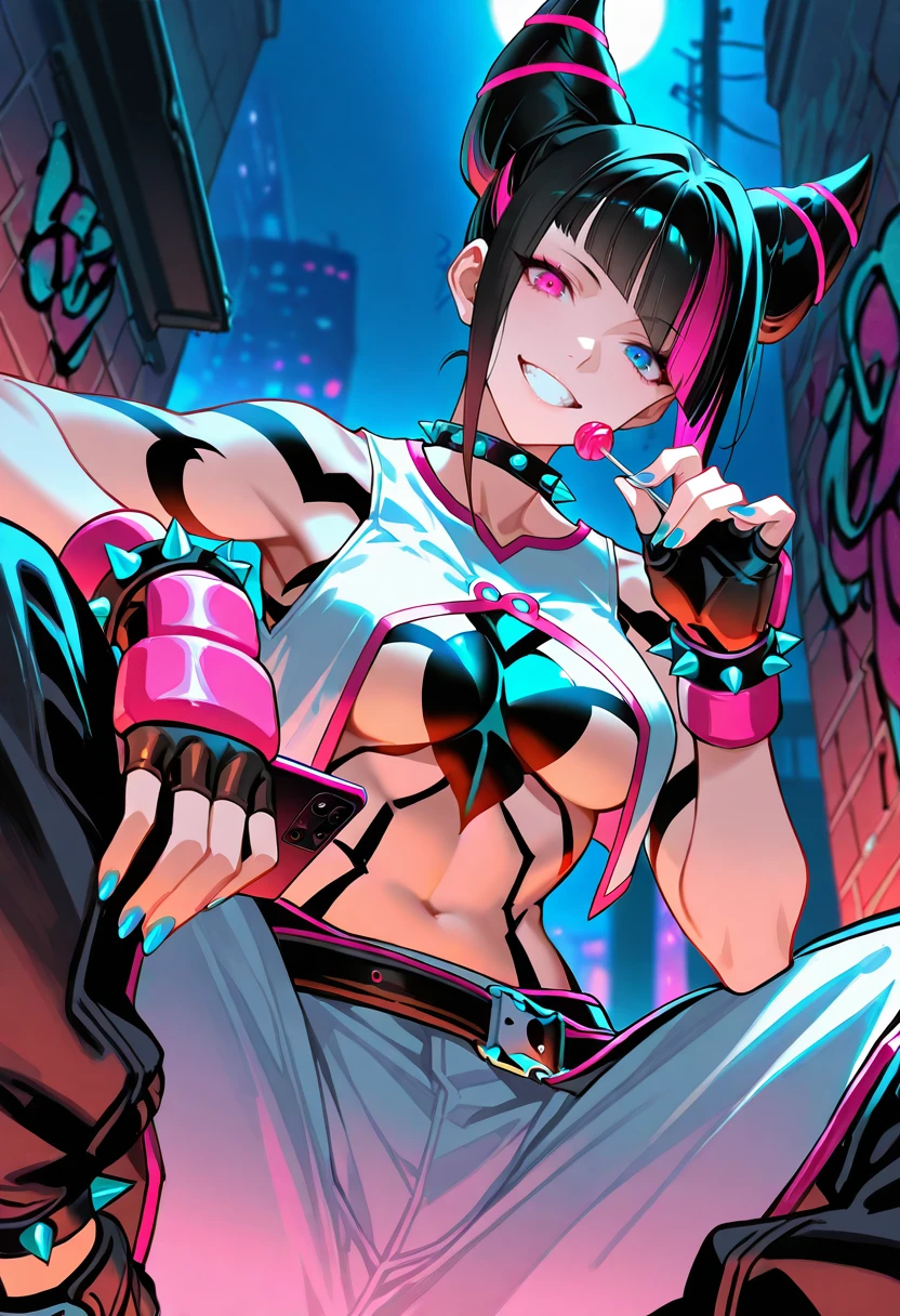 "SF6JHAN, hair horns, black hair, diagonal bangs, streaked hair, spiked choker, multi-colored clothes, white sleeveless open vest, body markings, layered clothing, zipper, baggy pants, belt, black pants, white pants"