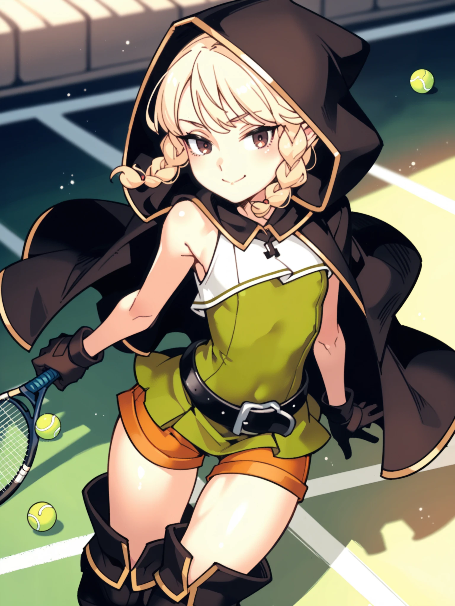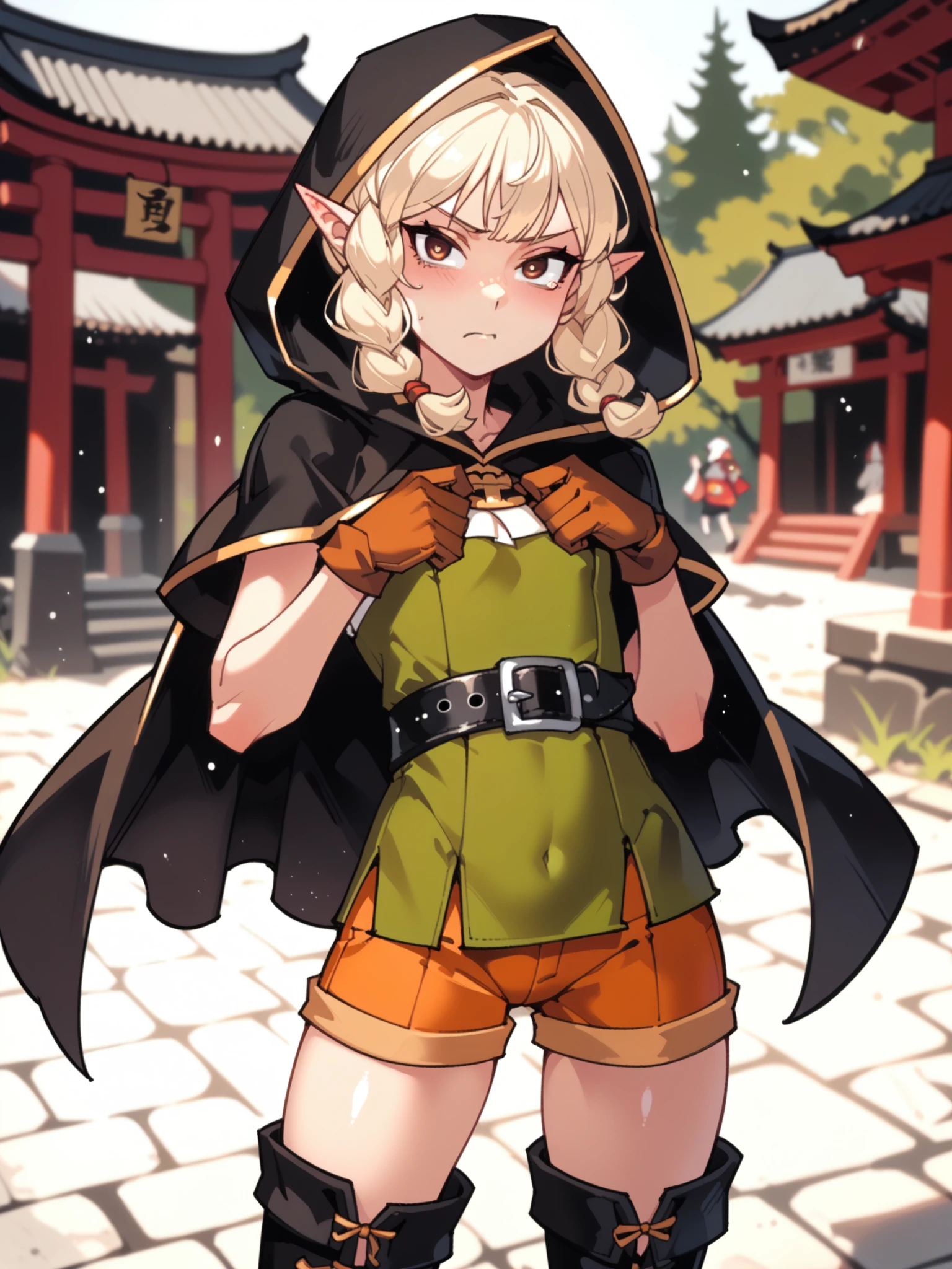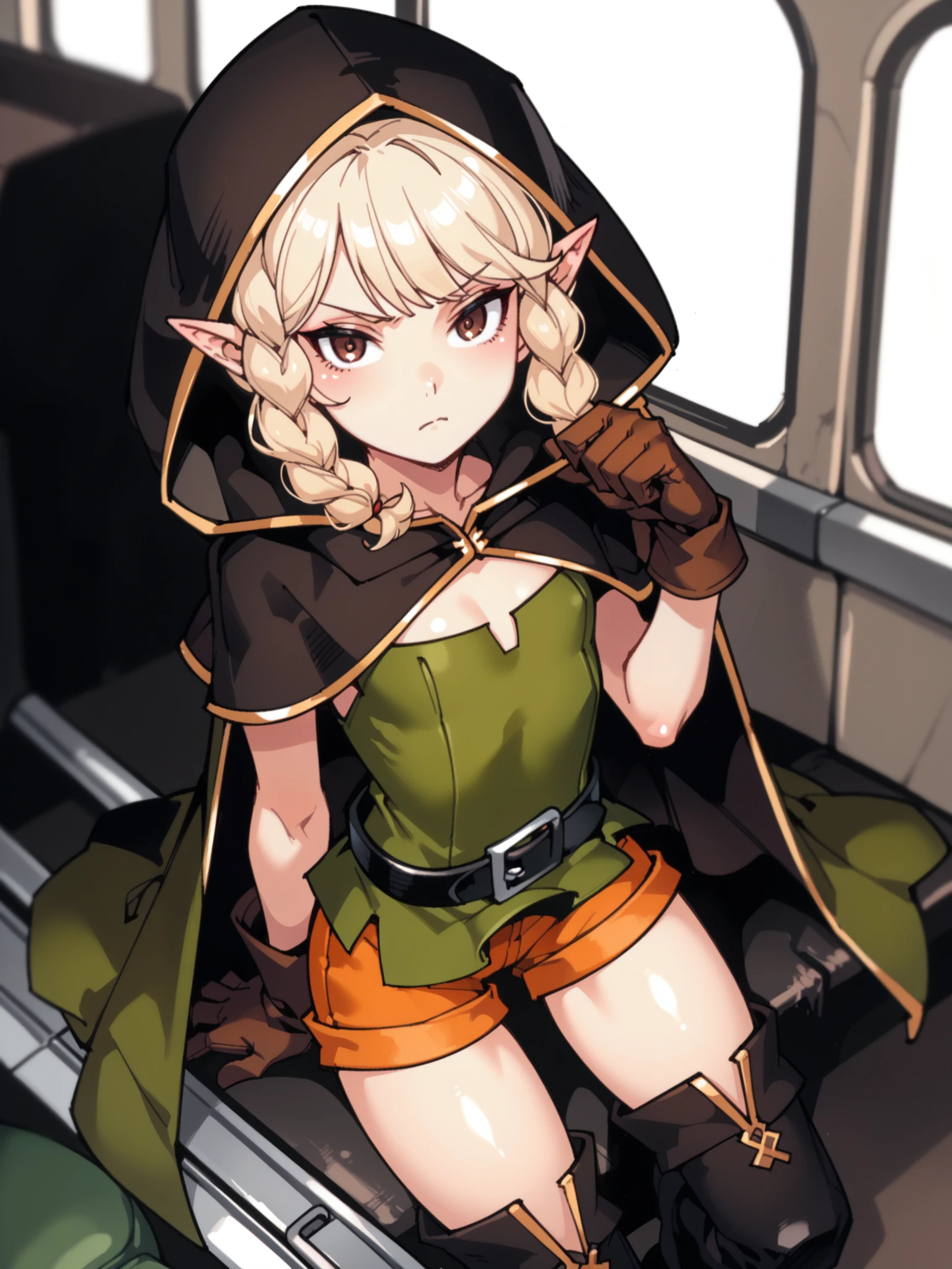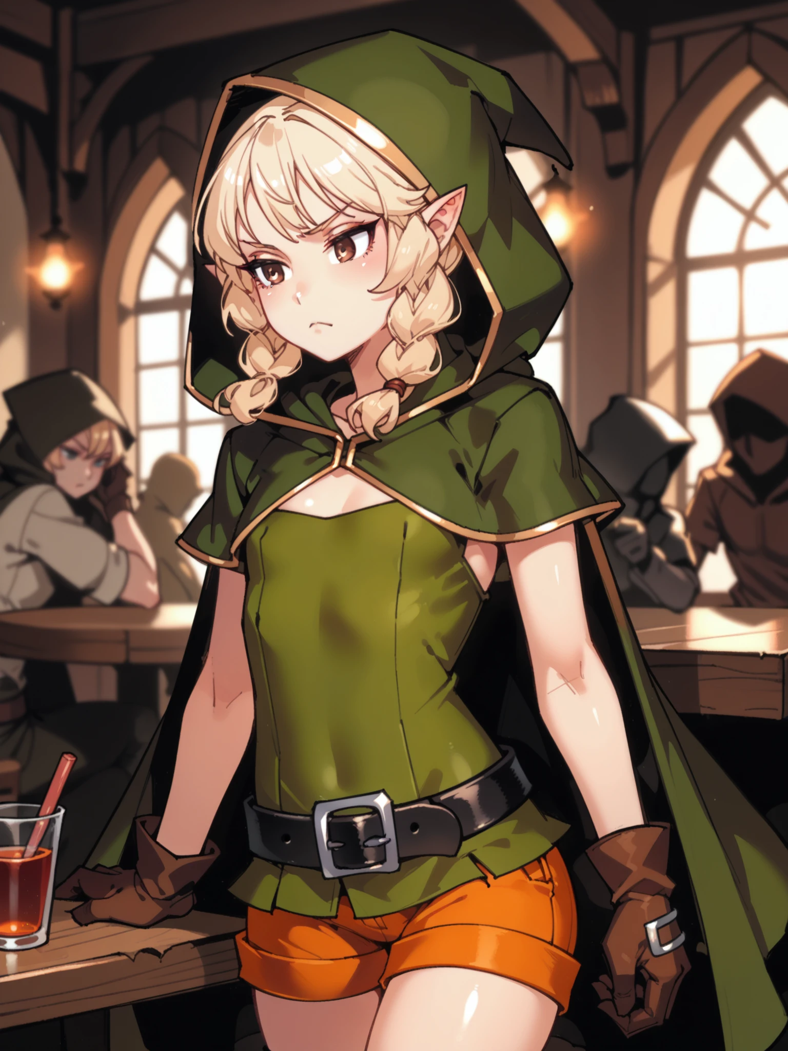 Default outfit: green dress, orange shorts, thigh boots, hooded cloak, hood, gloves, belt