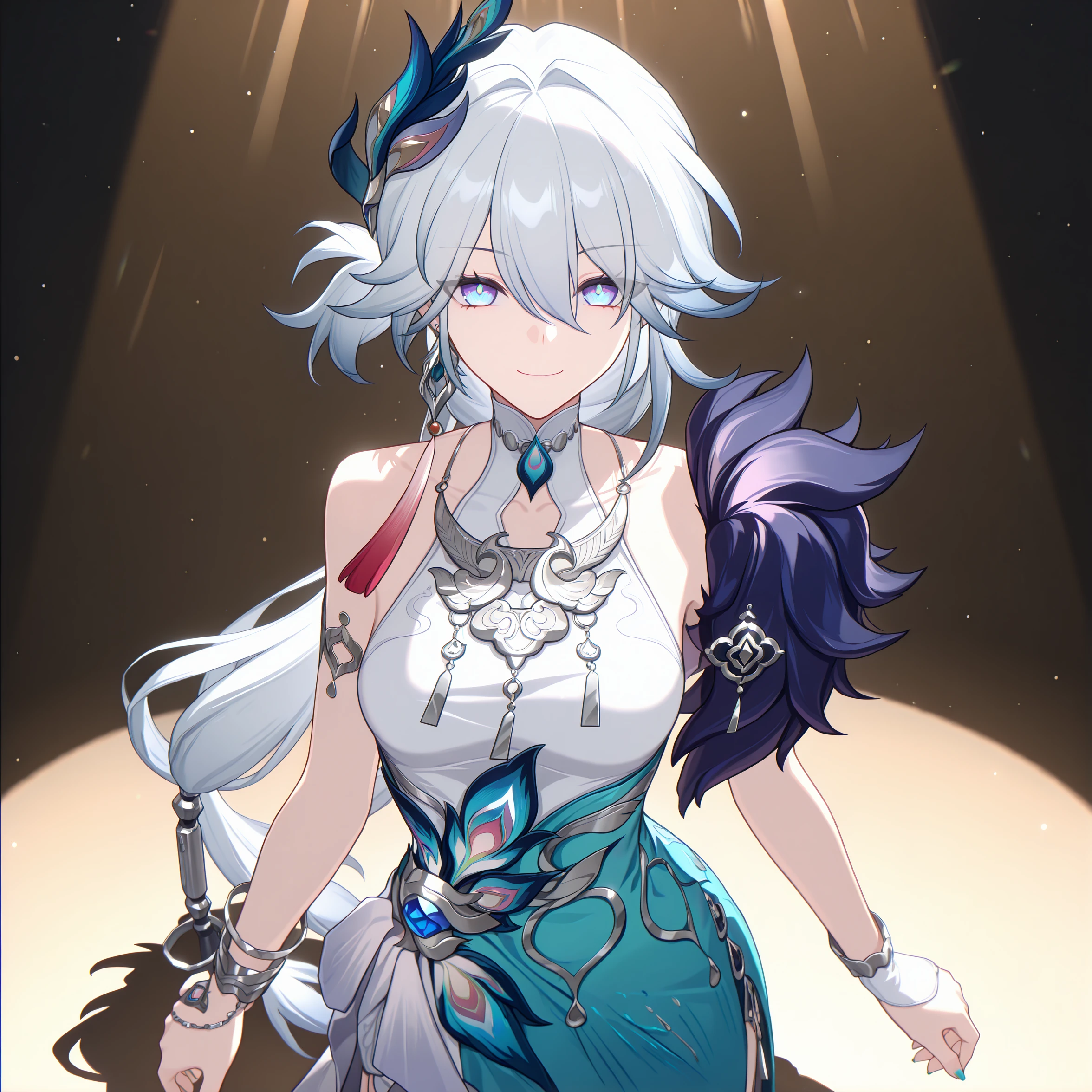 masterpiece, best quality, very aesthetic, newest, hires, Yaoguang, 1girl, solo, looking at viewer, hair ornament, bracelet, dress, high heels, smile, full body, detailed light, spotlight, simple background,For full-body shots, you can try adding full body or high heels.