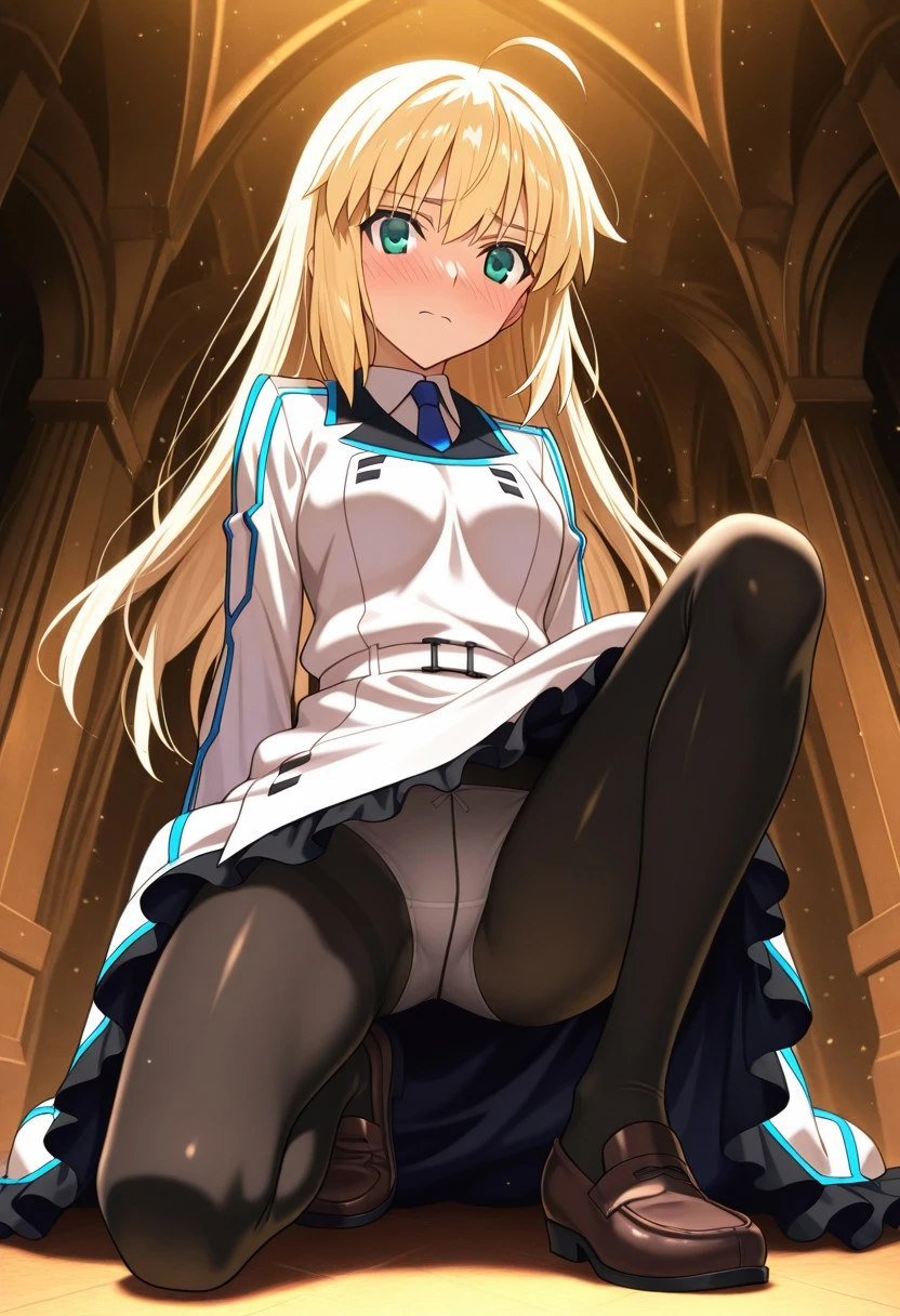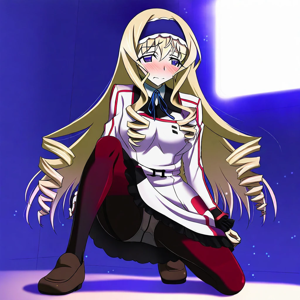 1girl, solo, cecilia alcott, hair between eyes, blue eyes, long hair, blonde hair, blue hairband with white frills, drill hair tips, blue neck ribbons, isuni_long dress, notched collar with red trim, white isuni_uniform with red trim, long sleeves with red trim, frilly skirt, frilly sleeve trim, white belt, long dress, white and black long skirt with red trim, black pantyhose,
