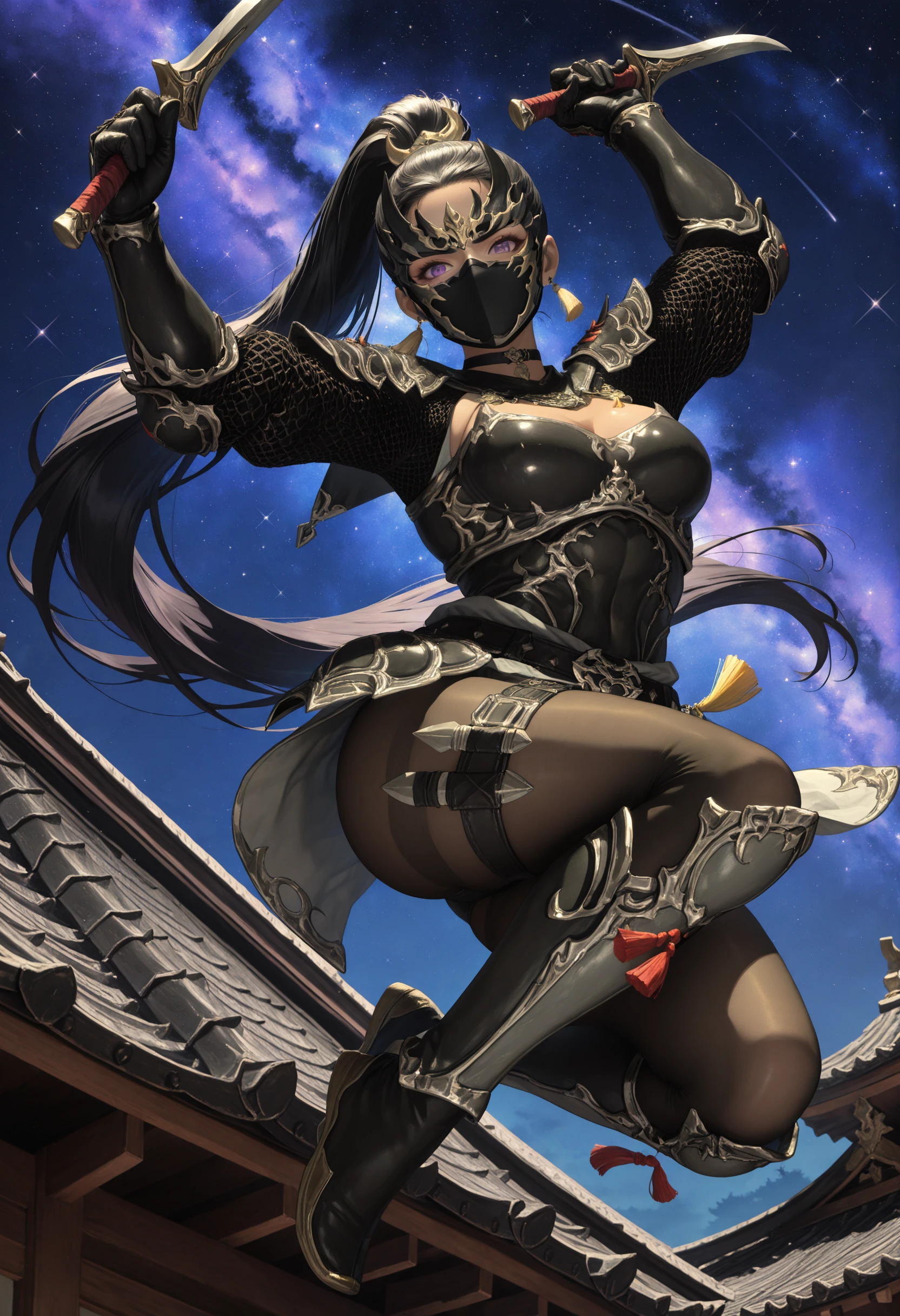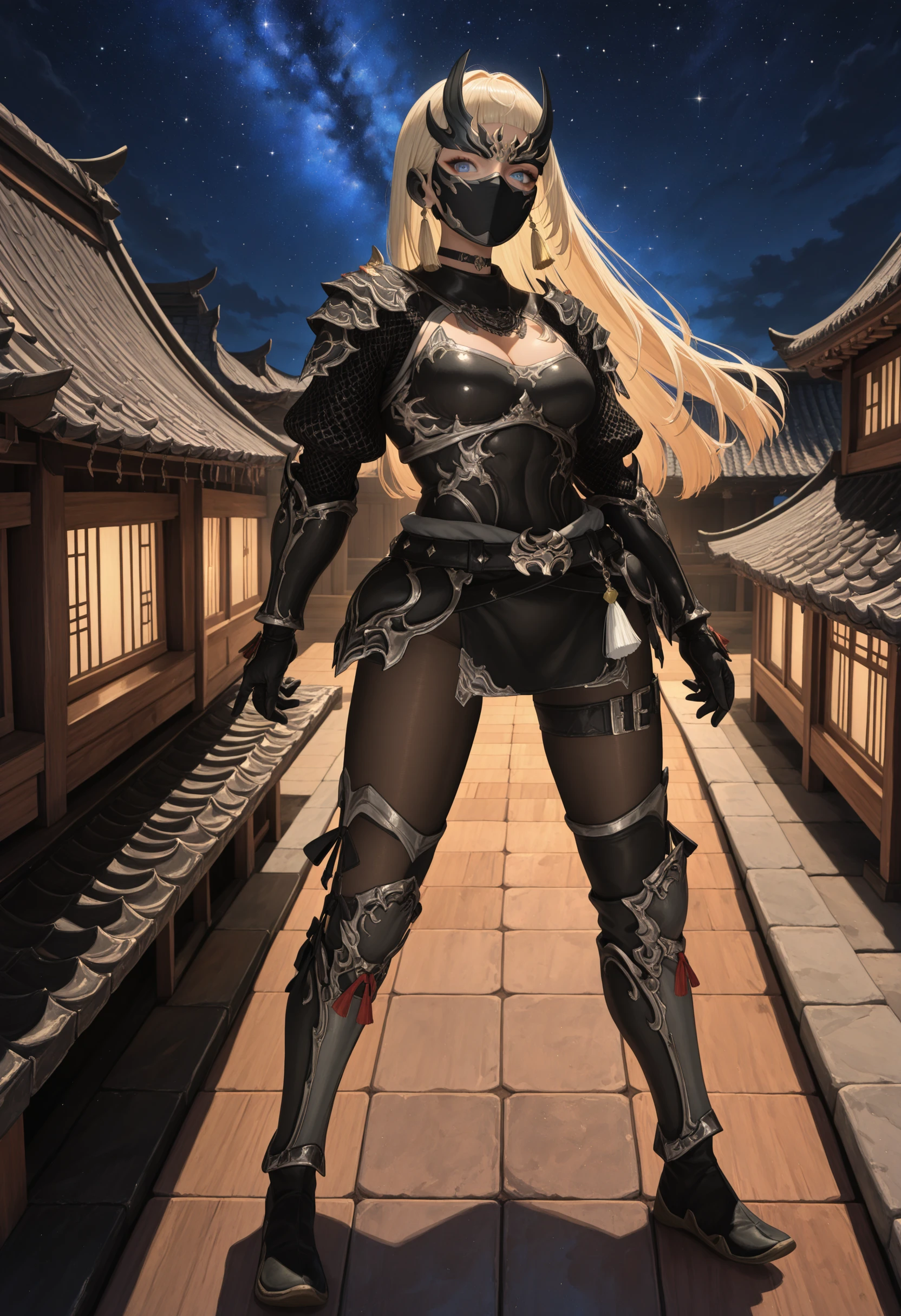 Ninja is another job that has an aesthetic I love. I did a bit of a mix with this one, I took the Mask from the second stage armor instead of the original full head covering of the first stage. I like to be able to see the hair styles, I think they match pretty well though so I doubt any non Final Fantasy XIV player would notice.