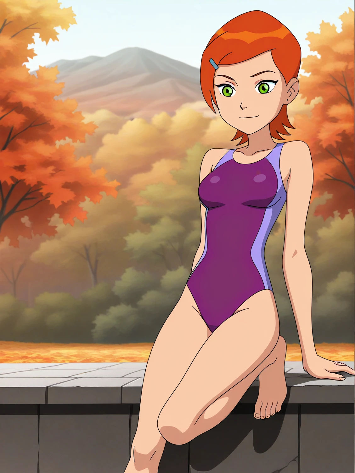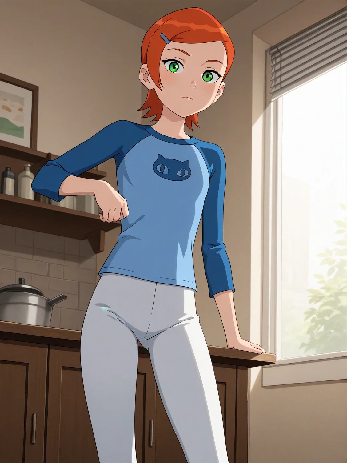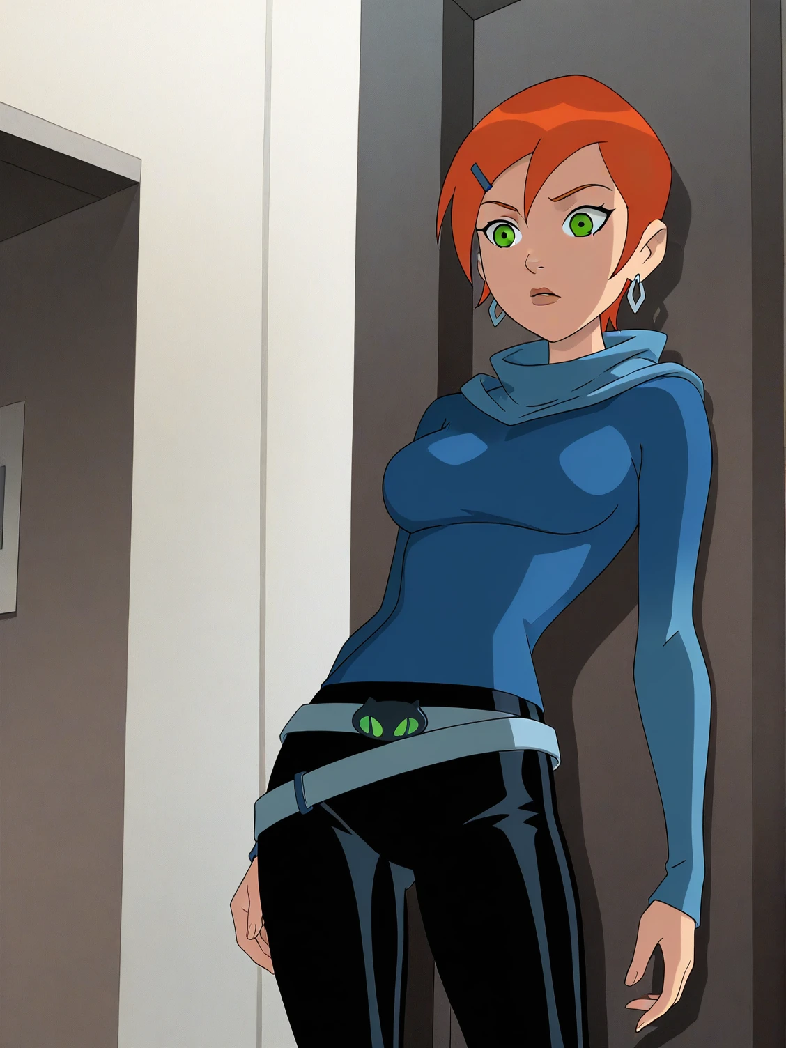 b10-gwen, red hair, short hair, green eyes, hairclip